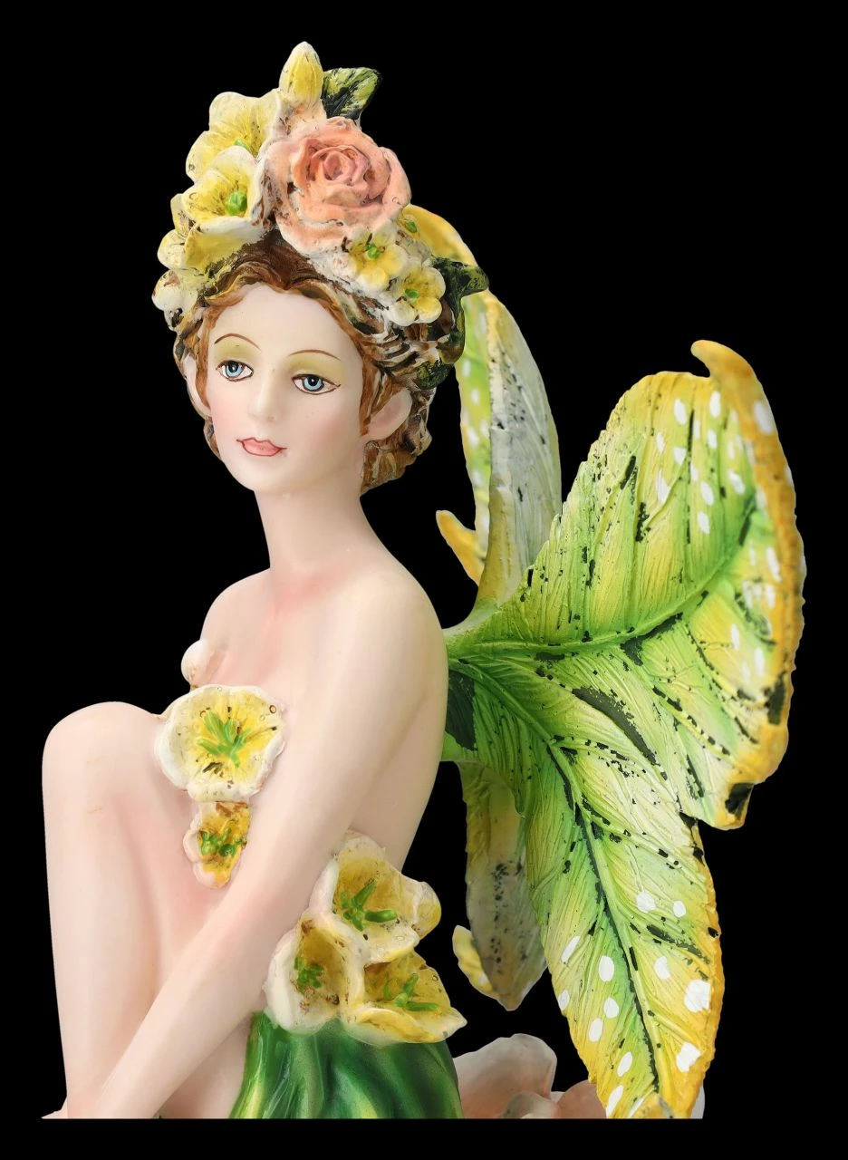 Den vielen Blumen auf der Wiese konnte sie nicht widerstehen. Ein paar mussten einfach für ihre neue Hutkreation gesammelt werden. So schön geschmückt setzt sich die Elfe Tiniwen wie ein bunter Schmetterling auf eine große Rosenblüte und genießt den herrlichen Sommertag. Die wunderhübsche Elfe Tiniwen wurde aus liebevoll handbemaltem Kunststein (Polyresin) geschaffen. Mit der Höhe von 29 cm, der Breite von 17,5 cm und der Tiefe von 13 cm ist sie eine fantastische Dekoration für die Fensterbank oder die Blumenbank. Ihre schönen, blattähnlichen Flügel sind zum Stecken. Die niedliche Elfe Tiniween mit dem Blumenhut ist aber auch – vielleicht mal statt Blumen – ein fantasievolles Geschenk für alle, die Elfen lieben.