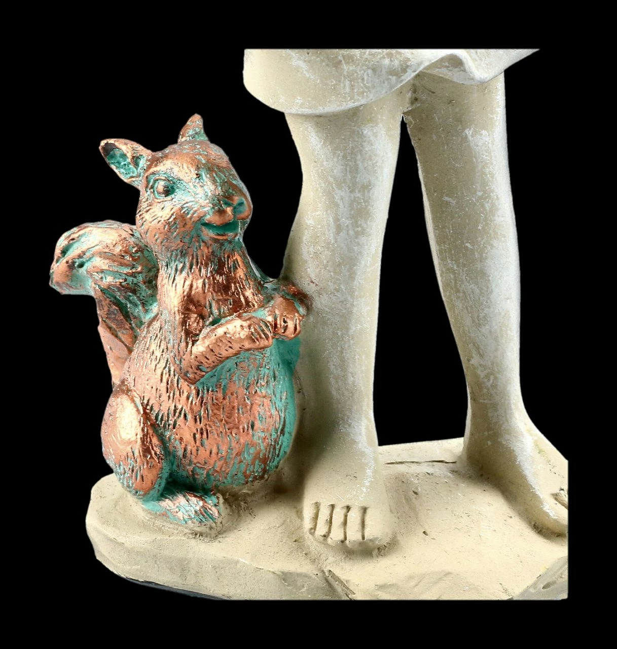 Diese süße zarte Waldelfe freut sich, gemeinsam mit ihrem Eichhörnchen, auf einen schönen Platz mitten in Ihrer Herbstdeko oder zwischen grünen Pflanzen auf der Fensterbank. Die herbstblätterfarbenen Flügel mit den grünen Akzenten und die Blüte in ihrer Hand haben dieselbe Farbe wie das Eichhörnchen. Diese süße Elfe ist 18,0 cm hoch, 12,0 cm breit, 6,0 cm tief und aus handbemaltem Kunststein (Polyresin).