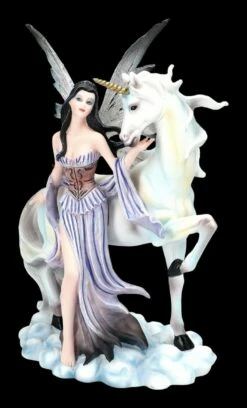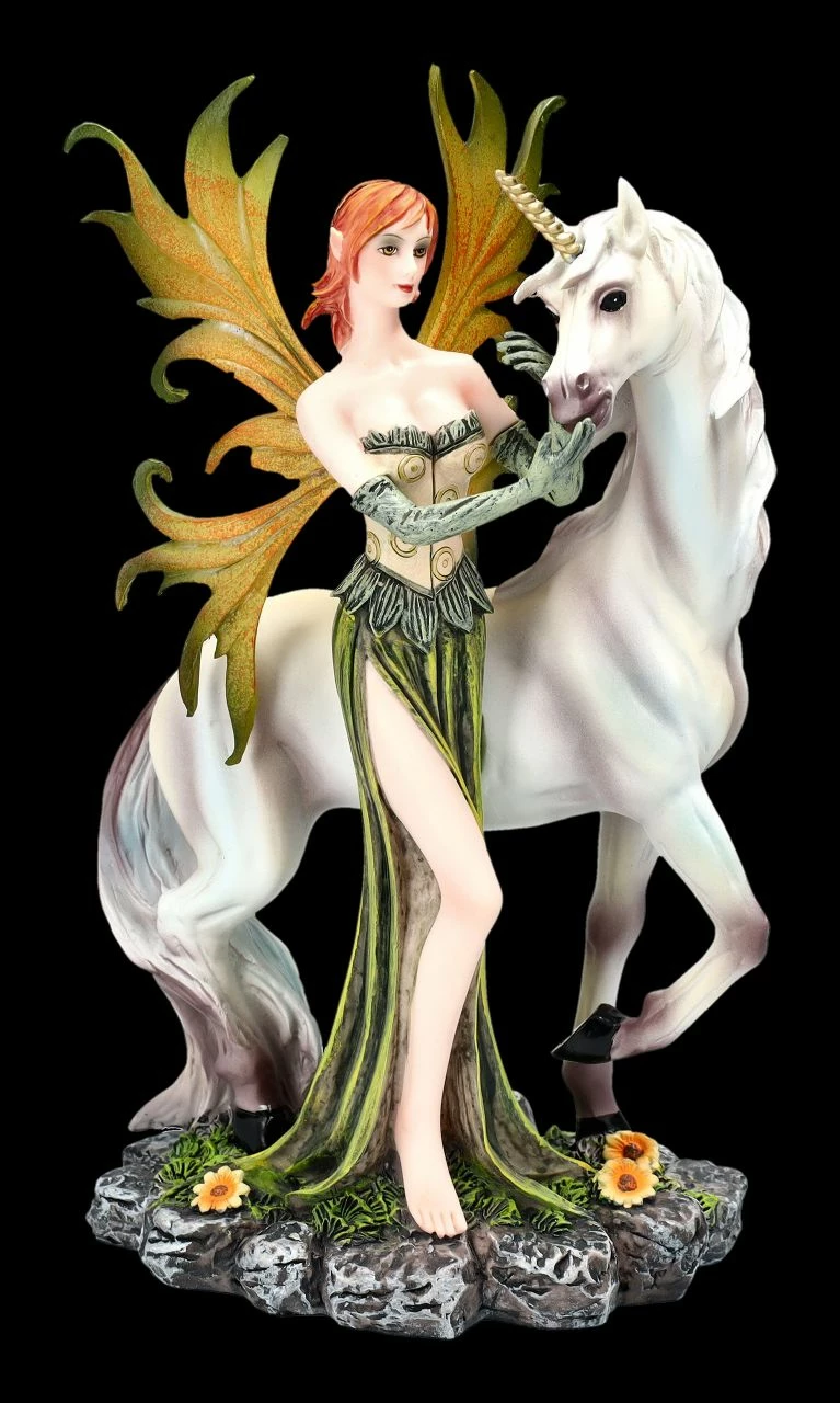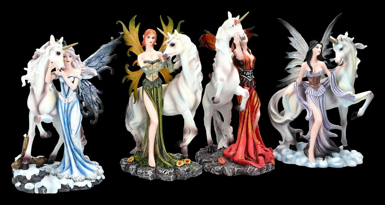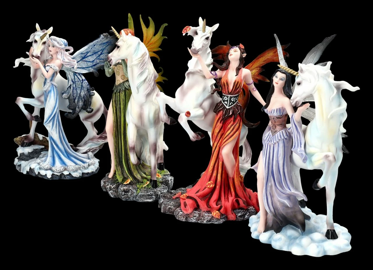 Frühling – Sommer – Herbst und Winter – vier verführerische Elfen haben sich mit ihren Einhörnern auf den Weg zum großen Jahreszeitentreffen gemacht. Bei der blonden Frühlingselfe in dem wie ein Frühlingshauch zarten blauen Kleid sieht man noch letzte Schneereste auf dem Boden, während die rothaarige Sommerelfe ein verlockend hochgeschlitztes grünes Kleid trägt und Blumen auf ihrem Weg liegen. Die braunhaarige Herbstelfe trägt ein verführerisches Kleid in den Farben herbstlich verfärbter roter Blätter und herbstliche Blätter säumen auch ihren Weg. Und die wunderschöne schwarzhaarige Winterelfe auf der Schneewolke, die nicht einmal in dem federleichten und hoch geschlitzten kühl lilafarbenem Kleid zu frieren scheint, macht den Jahresreigen komplett. Die filigranen Flügel der Elfen passen zu ihren Gewändern. Die liebevoll handbemalten Elfen mit ihren prächtigen Einhörnern wurden sehr detailreich aus Kunststein (Polyresin) gefertigt Die vier Elfenfiguren mit den Einhörnern sind 19,5 – 22 cm hoch, 11,5 – 15 cm breit und 8,5 – 13 cm tief und werden viele Bewunderer finden. Die fantastischen Vier im Set sind einzeln oder gemeinsam aber auch ein wunderbares Geschenk für jeden, der die wundersame Welt der märchenhaften Fabelwesen liebt.