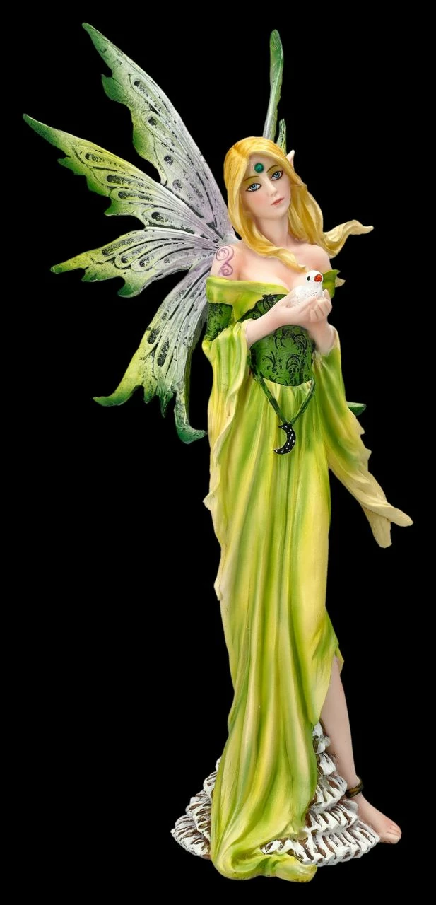 Auch im weit entfernten und geheimnisvollen Land der Elfen, Feen und Zauberwesen bekommen Prinzessinnen eine Aufgabe, die zu ihrem Charakter passt. So wurde die wunderschöne Fee Mira von der Mondgöttin als Friedensfee ausgewählt. Sie ist damit auch für die Friedenstauben.verantwortlich, die sorgfältig von ihr gehütet werden und die sie sofort fliegen lässt, wenn sie Gefahr von Streitigkeiten im Land der Elfen vermutet. Die wunderschöne Elfe Mira mit den langen blonden Locken ist in ihrem blattgrünem Kleid zauberhaft anzusehen. An ihrem Gürtel trägt sie stolz das Symbol der großen Mondgötttin und in ihren Händen hält sie die flugbereite Friedenstaube. Die 28 cm hohe, 12,5 cm breite und 11 cm tiefe zauberhafte Elfenfigur ist bis zu den schönen filigranen grünen Flügeln, die übrigens zum Stecken sind, sehr detailreich aus Kunststein (Polyresin) gefertigt und liebevoll von Hand bemalt. Als Symbol für den Frieden ist die schöne Fee Mira mit ihrer Taube ein wunderbares Geschenk für alle, die von der Welt der Elfen und Feen bezaubert sind.