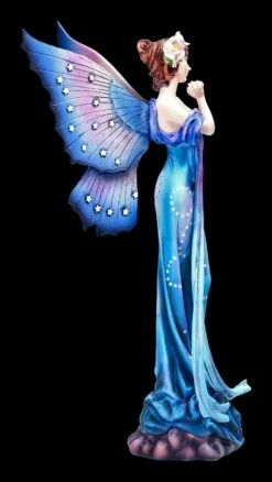 Bewundernswert schön wie Sternenstaub steht die himmlische Elfe verträumt über den Wolken und der Mondsichel. Zart umfließt das mit Sternen und bis zum Saum des Kleides mit schwingenden Bändern verzierte lange blaue Kleid ihre filigrane Figur. Ihre roten Haare sind mit Rosen geschmückt und ihre blauen Flügel mit den violetten Akzenten sind mit zahlreichen Sternen besetzt. Die Flügel sind zum Stecken. Diese wunderschöne Elfe Stardust ist sorgfältig aus Kunststein (Polyresin) gefertigt und mit viel Liebe zum Detail handbemalt. Sie ist 42 cm hoch, 22 cm breit und 23 cm tief. Stardust ist eine wunderschöne Elfe und ein besonderes Geschenk für alle, die die romantische Stimmung einer Sternennacht lieben.
