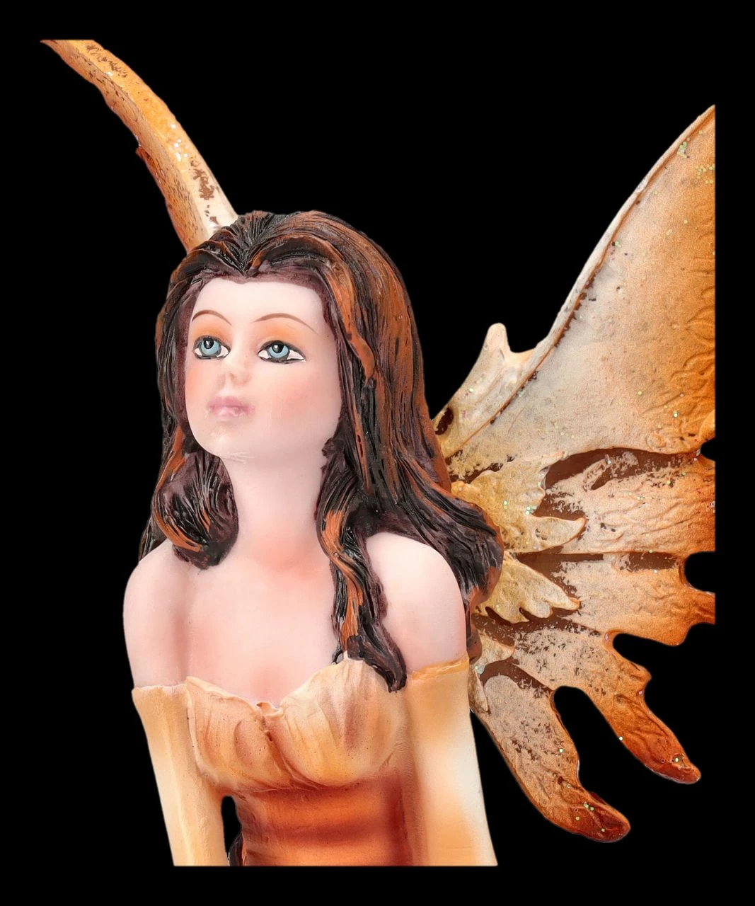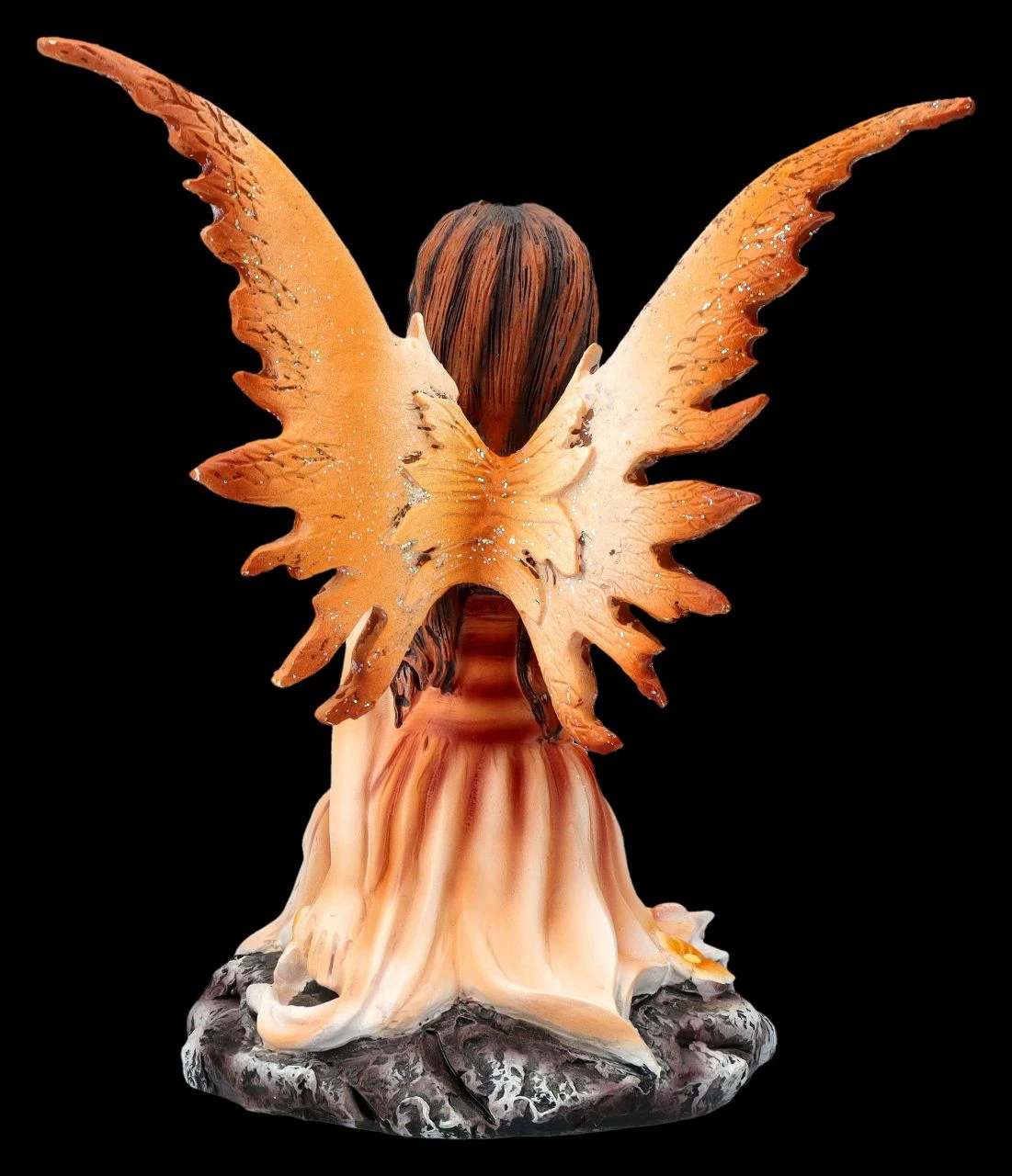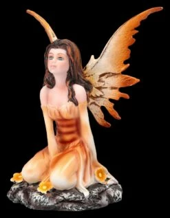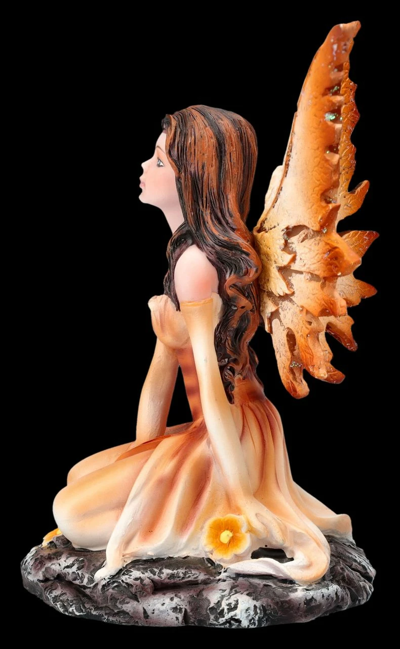 Die zauberhafte Elfe Thalior kniet in ihrem hauchzarten orangen Kleidchen vertrĂ€umt auf einem kleinen Felsen und reckt ihr niedliches Gesicht der Sonne entgegen. Zu ihren FĂŒĂen blĂŒhen orange-gelbe BlĂŒten und es scheint warm zu sein, denn sie friert nicht einmal in ihrem zarten Kleidchen. Ihre filigranen FlĂŒgel, die ĂŒbrigens zum Stecken sind, passen in der Farbe perfekt zu ihrem Kleid. Die bezaubernde Elfe Thalior in ihrem orangen Kleid ist aus liebevoll handbemaltem Kunststein (Polyresin) und 13 cm hoch, 10 cm breit und 8 cm tief. Wenn sie einen Platz zwischen den Blumen und Pflanzen auf der Blumenbank bekommt, fĂŒhlt sie sich am wohlsten. Da kann sie sich dann – vielleicht gleich gemeinsam mit ihren Elfen-Freundinnen aus unserem Shop – alles in ihrer Umgebung interessiert beobachten. Daher ist die bezaubernde Elfe Thalior auch ein perfektes Geschenk fĂŒr Sammler und alle, die gerne von der Welt der Elfen, Feen und Zauberwesen trĂ€umen.