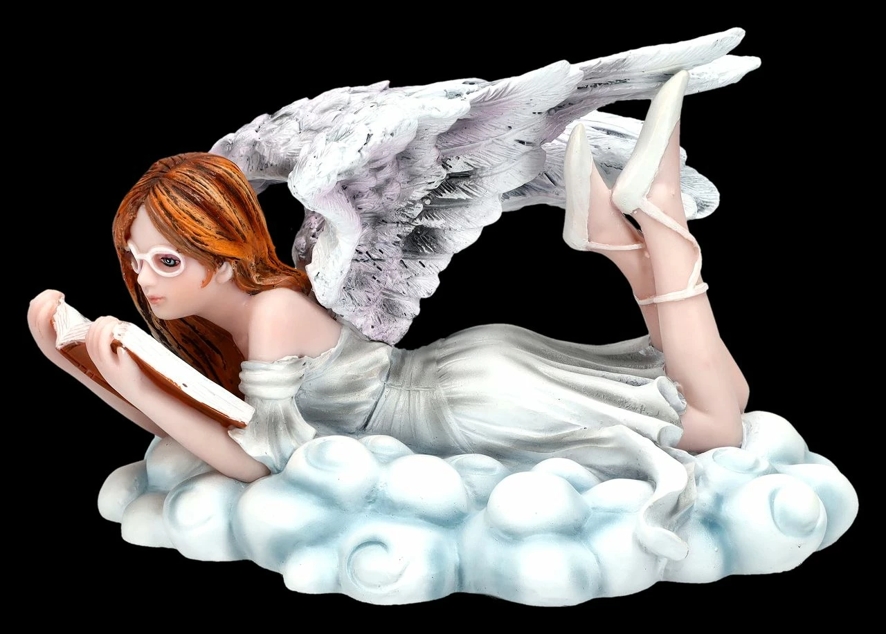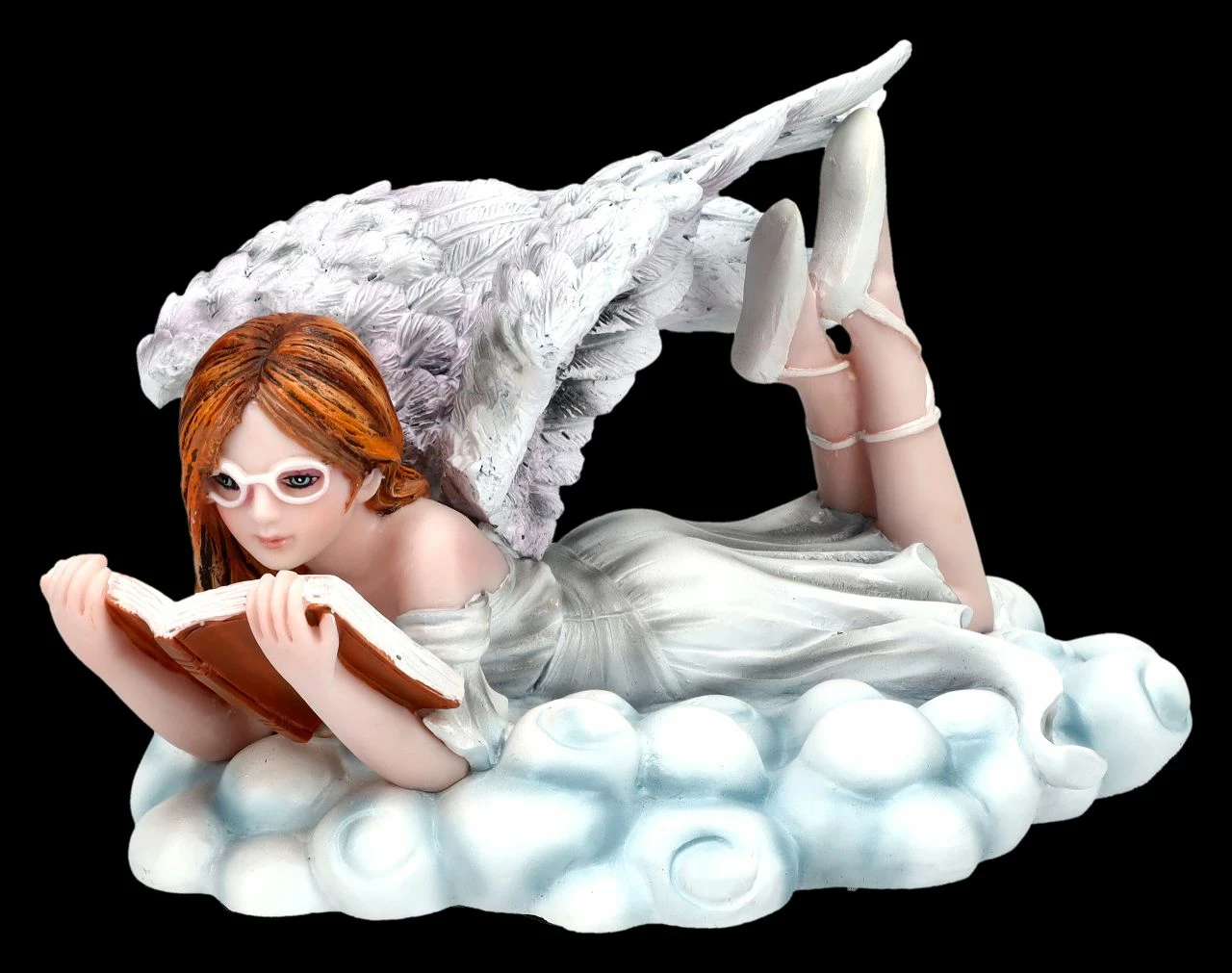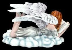‚Selbst auf Wolke 7 hat ein Engel mal eine Pause verdient‘, denkt sich der süße Engel Anja und hat beim Vorbeifliegen schnell einen Stop in der himmlischen Bibliothek eingelegt. Schnell die Brille auf die Nase und ein bequemes Plätzchen auf der Wolke gesucht… So liegt der niedliche rothaarige Engel in seinem weißen himmlischen Kleidchen bäuchlings auf der Wolke und ist so in das Buch versunken, dass sogar das tägliche Hosianna.vergessen wird. Die bezaubernde Engel Figur ist aus liebevoll handbemaltem Kunststein (Polyresin) gefertigt und 7,5 cm hoch, 13 cm breit und 8,5 cm tief. Sie ist eine wunderbare Deko – auch für einen Bücherladen – und ein zauberhaftes Geschenk für alle, die gerne lesen.
