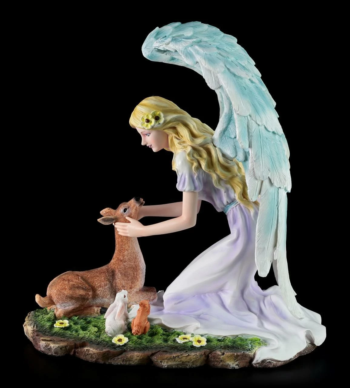 Der sanfte Engel Calista ist auf die Erde gekommen, um nach ihren SchĂŒtzlingen zu sehen. Liebevoll streichelt sie ein Reh. Auch andere Wildtiere, wie ein kleiner Hase und ein niedliches Eichhörnchen sind gekommen, um den Engel zu begrĂŒĂen. Die Engel Figur bringt eine friedliche AtmosphĂ€re in Ihre Wohnung und ist ein liebevolles Geschenk an einen tierlieben Menschen.