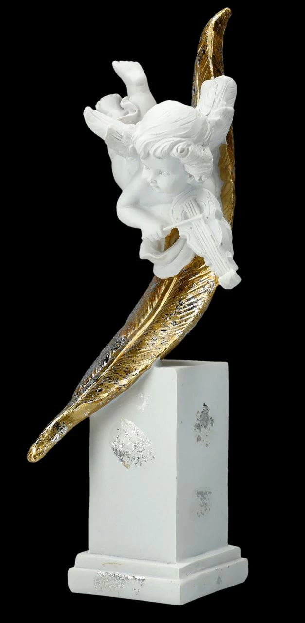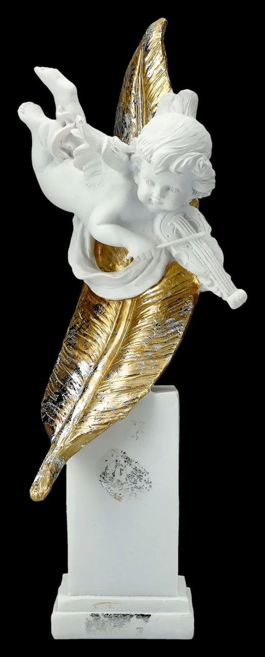 Bereits in der Antike kannte man den pausbäckigen ‚Putto‘, was im Lateinischen ‚Knäblein‘ bedeutete. Sie wurden meist als Liebesengel dargestellt und spielten in den späteren kirchlichen Darstellungen oft ein Instrument. Wie auch bei dieser niedlichen Engel-Figur, die auf ihrer Violine spielt. Die Putte Amor schwebt dabei vor einer goldenen Feder, mit der vielleicht auch ein Liebesgedicht auf die dahinter stehende Säule geschrieben werden sollte. Die bezaubernde Engel-Figur aus liebevoll handbemaltem Kunststein (Polyresin) ist 24 cm hoch, 9 cm breit und 9 cm tief. Ob als kleines Geschenk als Liebesgabe oder als Deko auf einer Hochzeitstafel, die Putte Amor wird sicher jedem ein Lächeln entlocken.