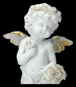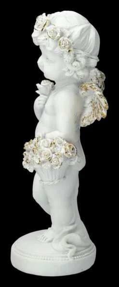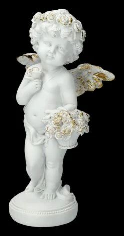 Hier kommt der Engel, der auf dem Weg zum Traualtar mit den Blumenkindern Rosen streut. Die niedliche Putte mit dem Rosenkorb gehört zu der großen Engelschar, die in unserem Shop gelandet ist. Sie ist 23 cm hoch, 12,5 cm breit und 10 cm tief und wurde mit goldenen Akzenten aus liebevoll handbemaltem Kunststein (Polyresin) gefertigt. Nicht nur für jeden Hochzeitstisch ist diese süße Putte eine tolle Deko, sie ist auch ein perfektes Geschenk für den ganz persönlichen Engel.
