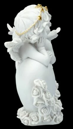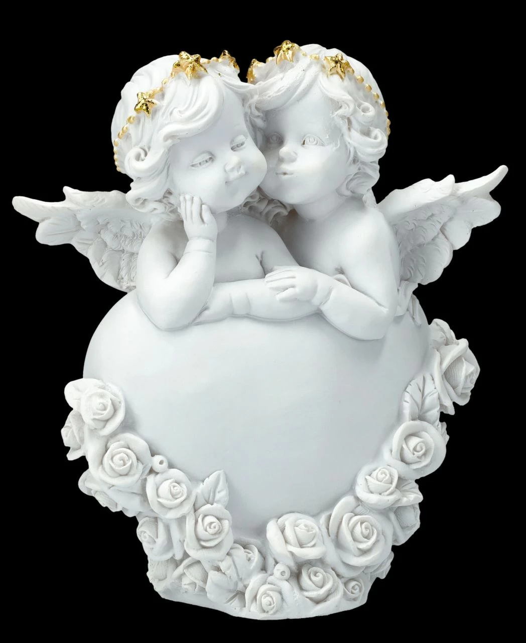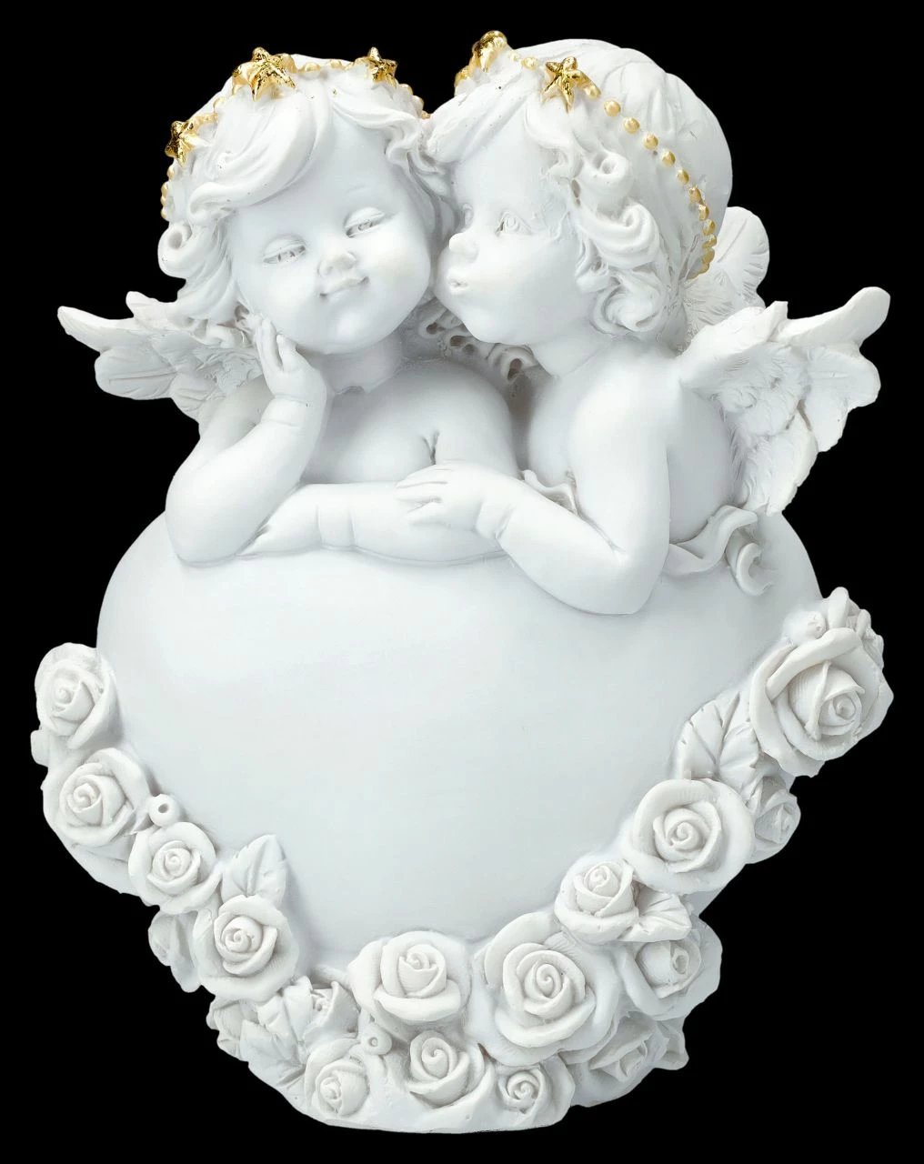 Ist das nicht niedlich? Aus einem mit Rosen geschmückten Herzen scheinen diese beiden kleinen Putten hervorzuschauen und eine der beiden Putten mit goldenen Sternenkränzen in den Haaren gibt der anderen ein zartes ‚Bussi‘. Dieses zauberhafte weiße Engel-Figur mit den goldenen Akzenten ist eine wirklich hübsche Dekoration auf einer Hochzeitstafel, aber auch ein reizendes Geschenk, denn bereits in der Antike kannte man den pausbäckigen ‚Putto‘, was im Lateinischen eigentlich ‚Knäblein‘ bedeutete, als Liebesengel. Die bezaubernden küssenden Putten mit dem Herz sind aus liebevoll handbemaltem Kunststein (Polyresin) und 15 cm hoch, 12 cm breit und 7 cm tief.