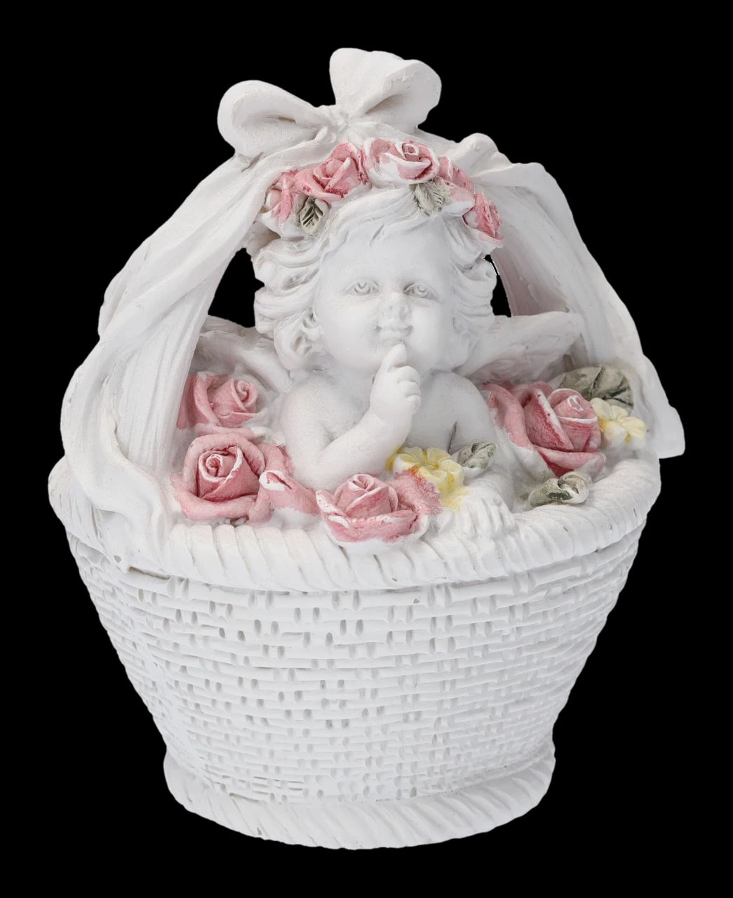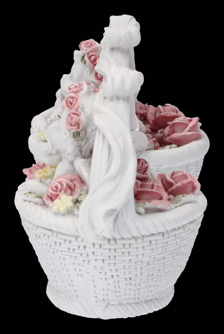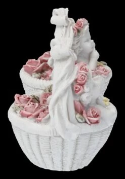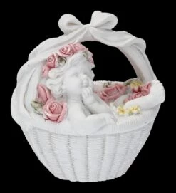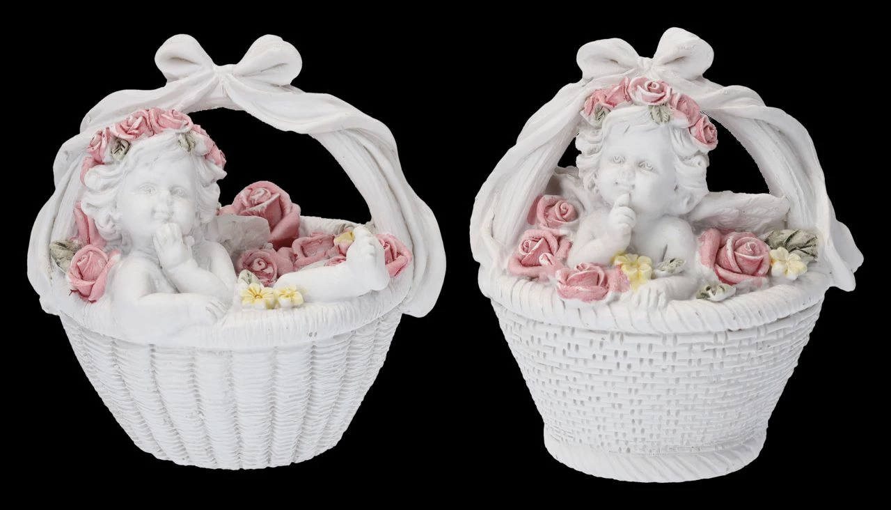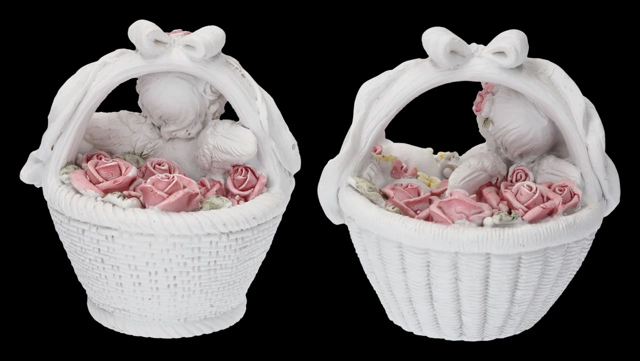 Da haben sich die beiden Engelchen gleich selbst in den Blumenkorb gesetzt und möchten wohl von da aus die Rosenblätter streuen… Sind sie nicht absolut niedlich? Gemeinsam mit einer großen Engelschar sind sie in unserem Shop gelandet. Die Putten in den Blumenkörben wurden aus liebevoll handbemaltem Kunststein (Polyresin) gefertigt und sind je 8 cm hoch, 7 – 7,5 cm breit und 6 – 7,5 cm tief. Auf jedem Hochzeitstisch ist dieses niedliche 2-er Set doch eine tolle Deko.