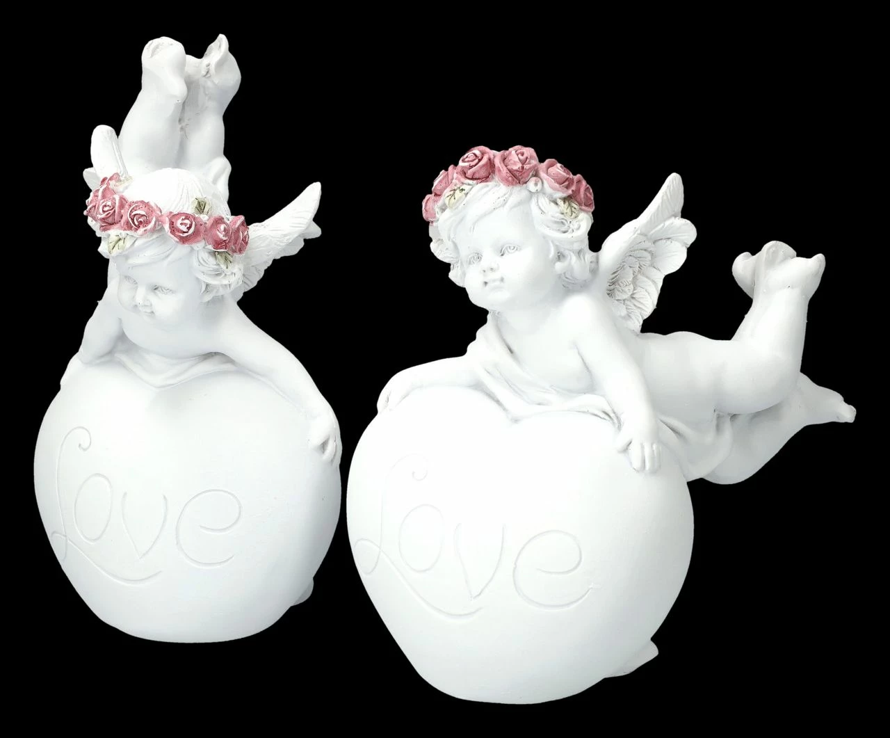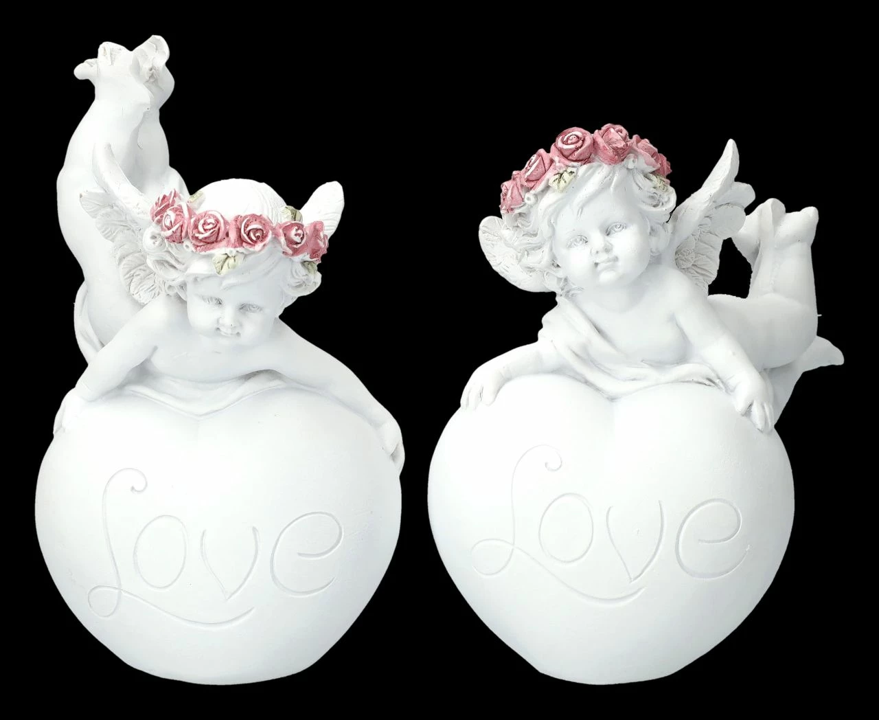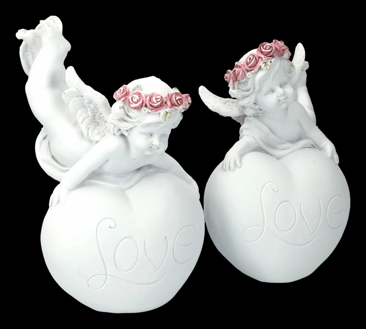 Hoch oben auf einer Hochzeitstorte wäre eigentlich der richtige Platz für die süßen Putten, die Herzen mit dem Schriftzug ‚Love‘ bringen und sie da vorsichtig ablegen möchten. Gemeinsam mit einer großen Engelschar sind die niedlichen Putten in unserem Shop gelandet. Sie wurden aus liebevoll handbemaltem Kunststein (Polyresin) gefertigt und sind 12,5 – 13,5 cm hoch, 8 – 9,5 cm breit und 7,5 – 8 cm tief. Auf jedem Hochzeitstisch ist dieses niedliche 2-er Set eine tolle Deko, es ist aber auch ein vielsagendes Geschenk für einen ganz besonderen Engel.