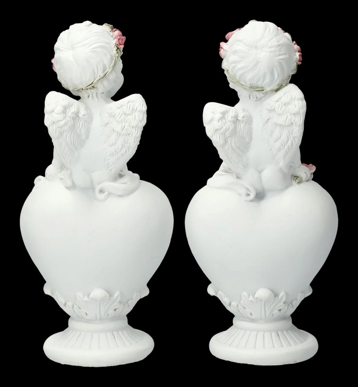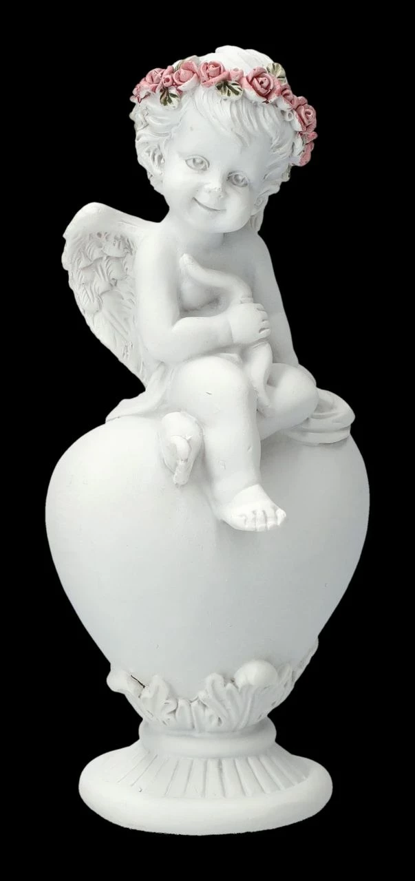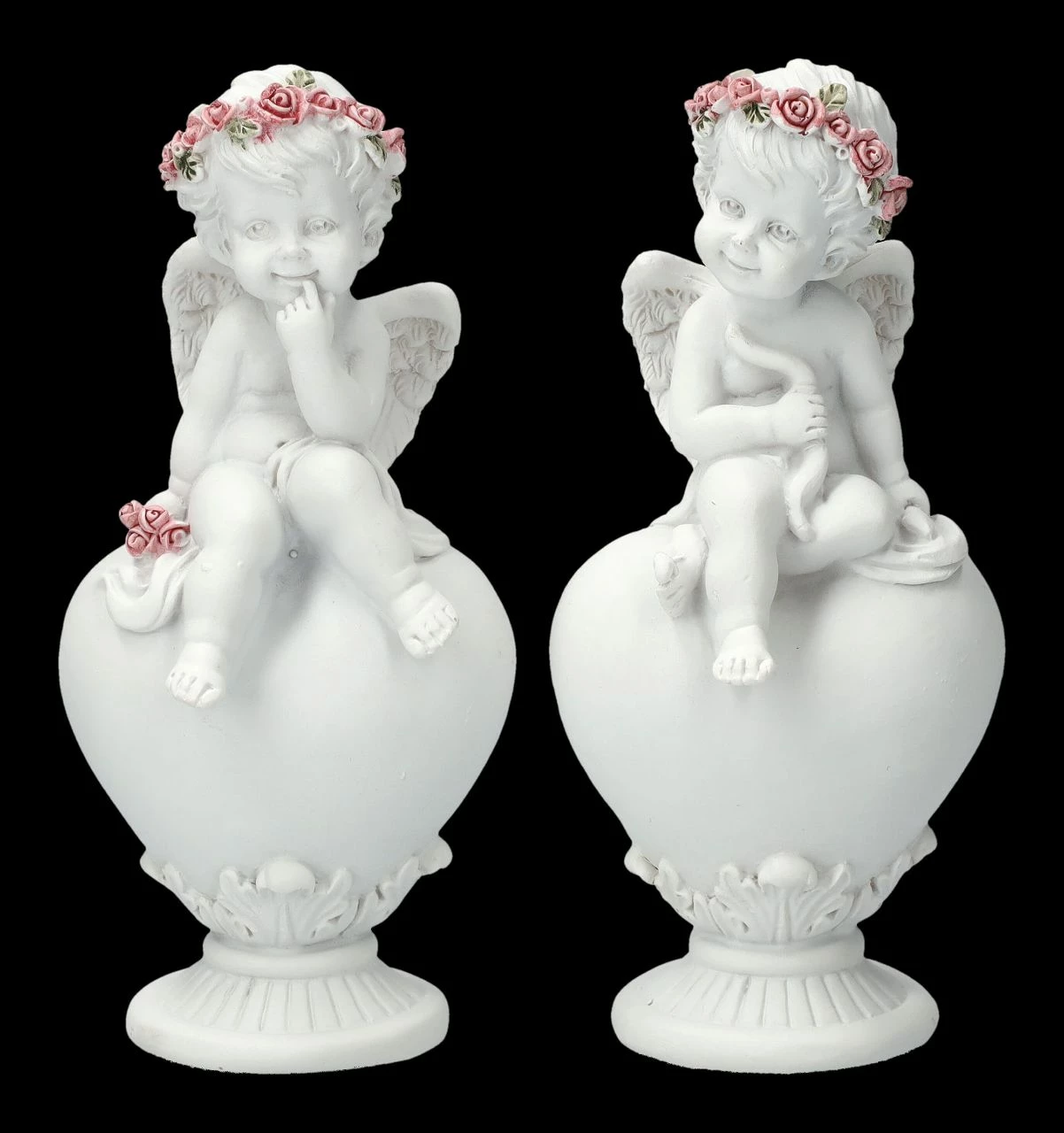 Sind sie nicht absolut niedlich und die perfekte Deko für einen Hochzeitstisch? Zu der Engelschar, die in unserem Shop gelandet ist, gehören auch die beiden auf Herzen sitzenden süßen Putten. Das 2er Set ist je 12,5 cm hoch, je 5,5 cm breit und je 5 cm tief. Sie wurden aus liebevoll handbemaltem Kunststein (Polyresin) gefertigt und auch ein tolles Geschenk für den Engel seines Herzens.