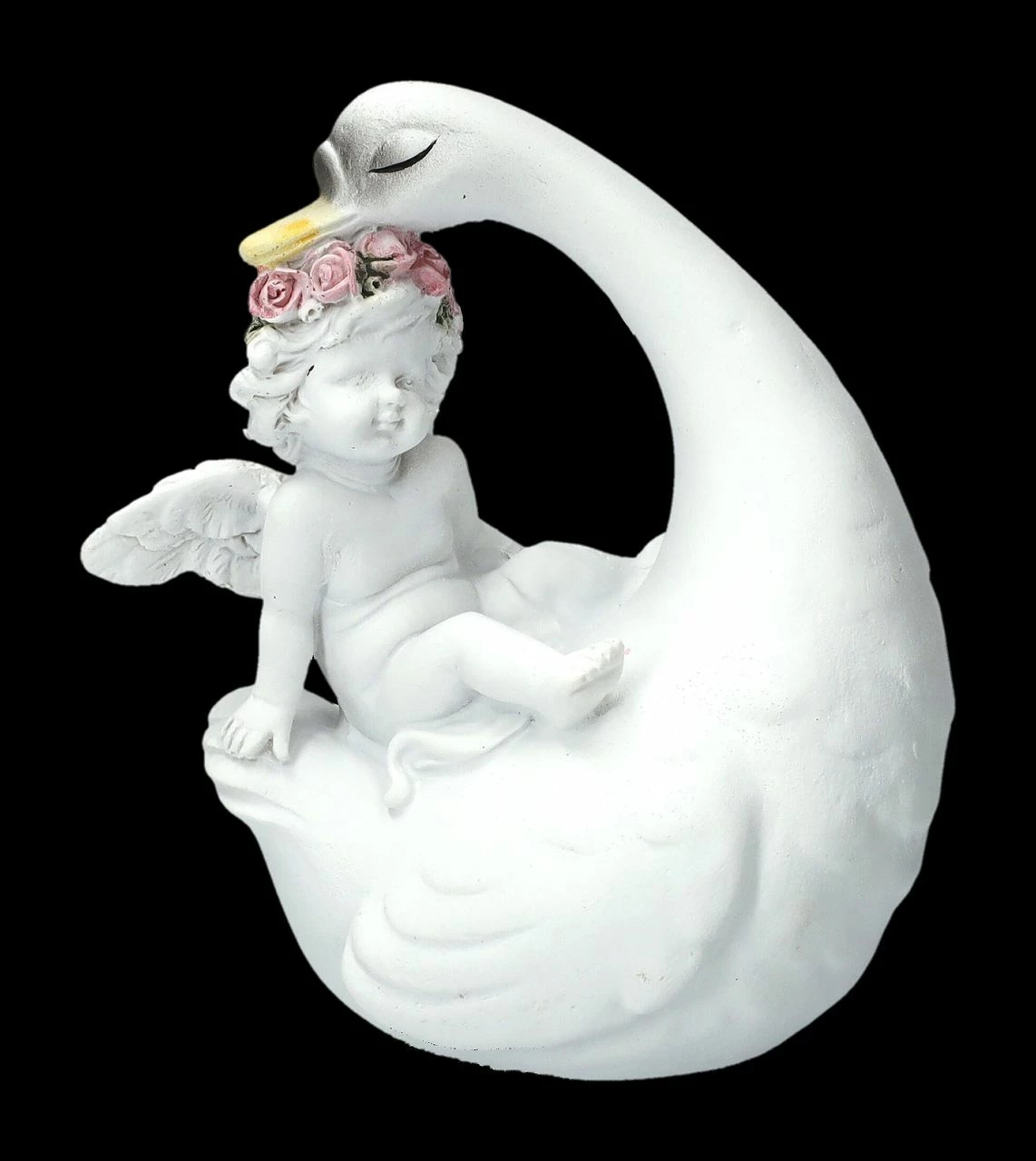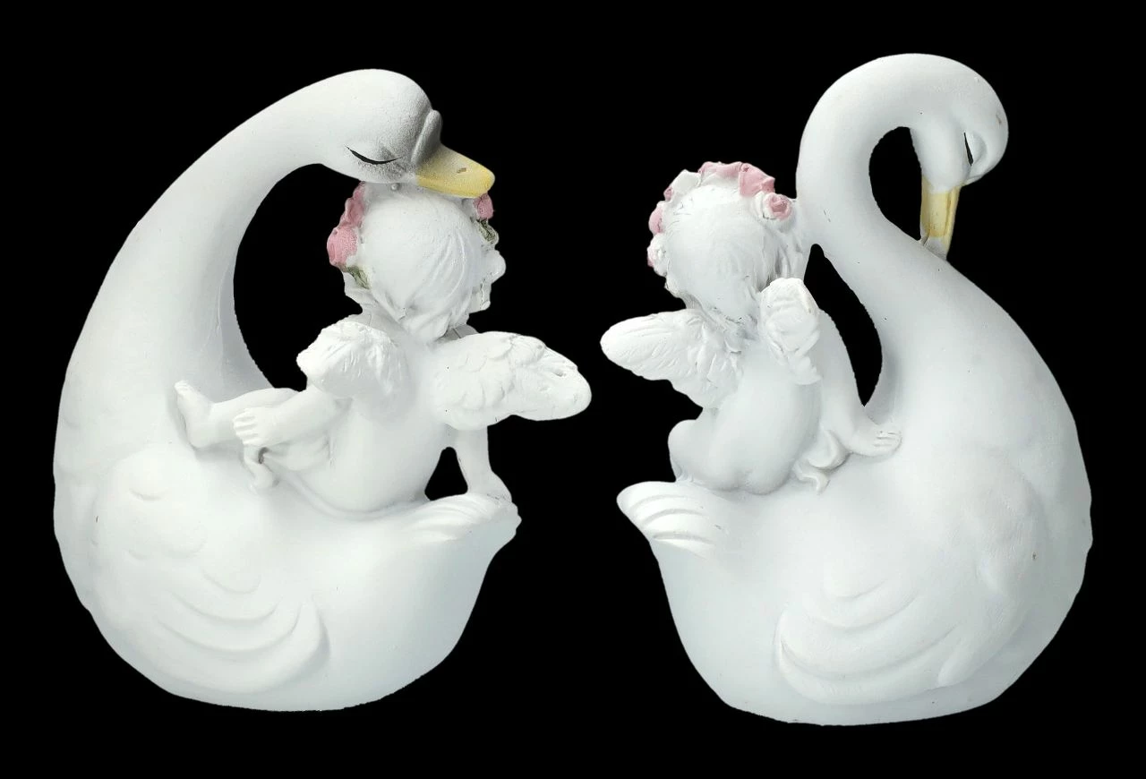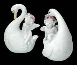 Am liebsten würden sie hoch oben auf einer Hochzeitstorte in der wolkenhaft weißen weichen Sahne sitzen und da passen sie wirklich auch hin – die schönen verliebten Schwäne mit den süßen Putten. Gemeinsam mit einer großen Engelschar sind die kleinen Putten mit den Schwänen gut in unserem Shop gelandet. Sie wurden aus liebevoll handbemaltem Kunststein (Polyresin) gefertigt und sind je 10 cm hoch, 7,5 – 8,5 cm breit und je 5,5 cm tief. Auf jedem Hochzeitstisch ist dieses niedliche 2-er Set eine tolle Deko, es ist aber auch ein vielsagendes Geschenk für einen ganz besonderen Engel.
