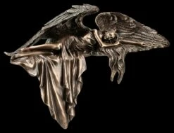 Der Flug scheint anstrengend gewesen zu sein und so hat sich der wunderschöne Schutzengel nur ganz kurz auf dem Schrank oder einem Regal hingelegt und ist dabei eingenickt. Lediglich die großen Flügel geben ihm Halt. Das lange Kleid, das den zauberhaften Engel wie ein Schleier bedeckt, hängt, wie auch das lange gewellte Haar, über die Kante. Die edel bronzierte Engel-Figur aus Kunststein (Polyresin) ist 13,5 cm hoch, 20 cm breit und 6,5 cm tief und stammt aus der Studio Collection von Veronese. Der Schutzengel als Kantenhocker ist einfach bezaubernd und hat einen wirklich guten Platz verdient, an dem er sofort entdeckt wird. Außerdem sind Schutzengel auch immer willkommene Geschenke, die viel Freude bereiten.