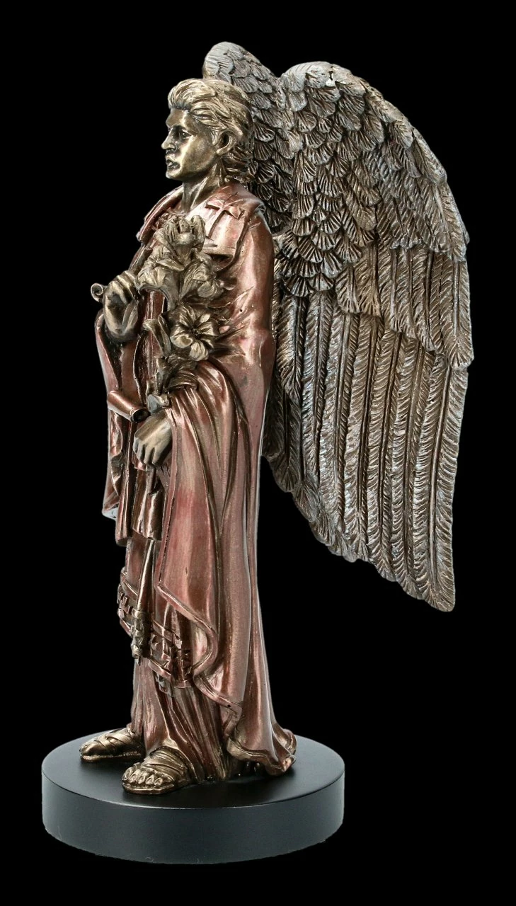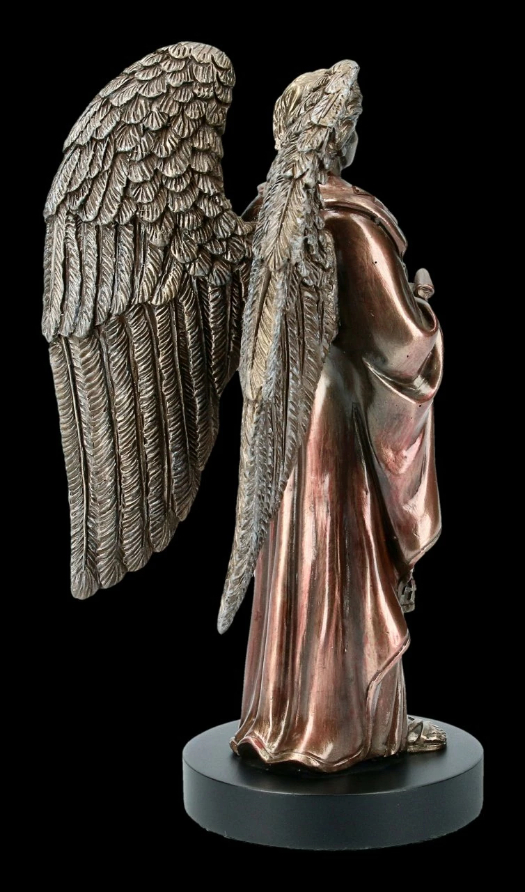 Der Erzengel Gabriel ist der Engel der Verkündigung der Geburt Jesu. Sein Name bedeutet Macht oder Kraft Gottes. Er gilt als Lichtwesen und er ist der Botschafter der Hoffnung. Diese wunderschöne und außerordentlich detailreiche Figur des Erzengel Gabriel auf dem Podest ist aus edel bronziertem Kunststein (Polyresin) gefertigt. Die Figur hat eine Höhe von 20,5 cm, eine Breite von 10 cm und eine Tiefe von 10 cm. Sie lässt sich auch sehr gut mit den anderen Erzengelfiguren aus unserem Shop zu einer effektvollen Gruppe zusammenstellen, die überall ein besonderer Blickfang sein wird.