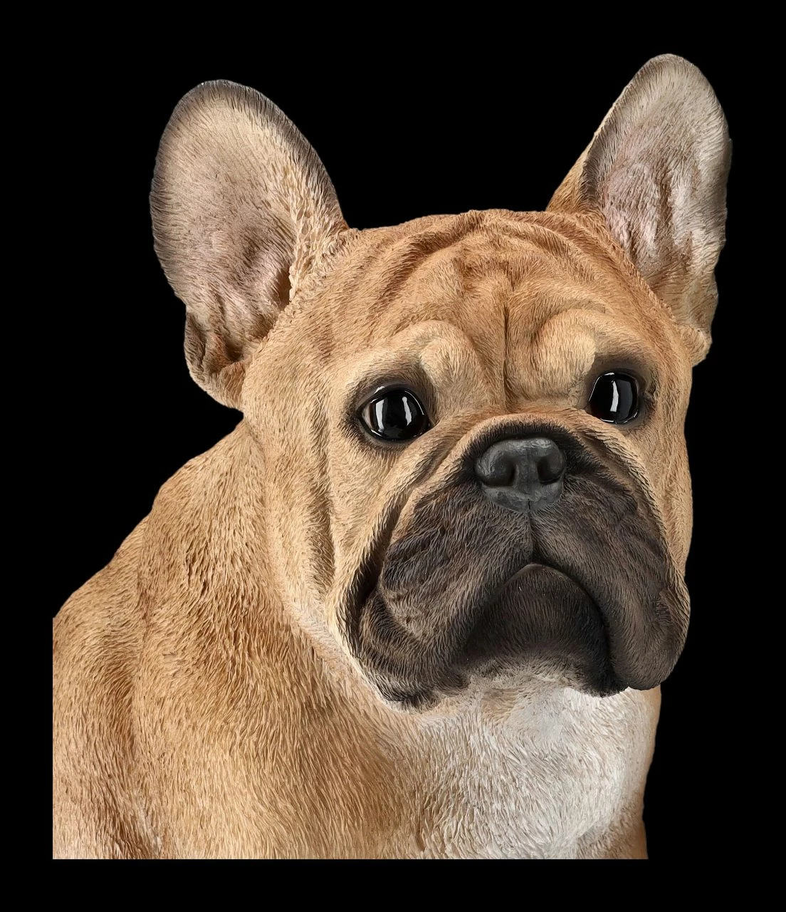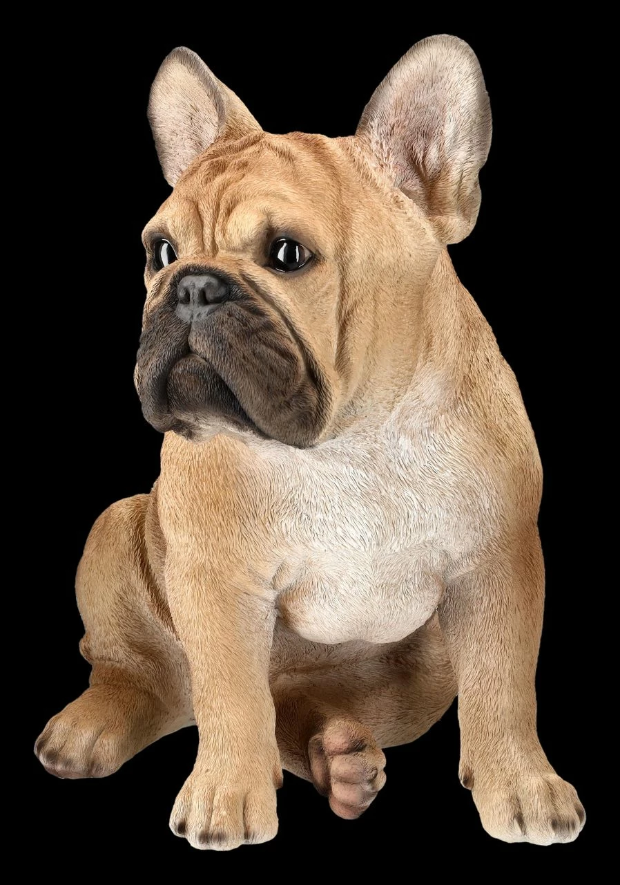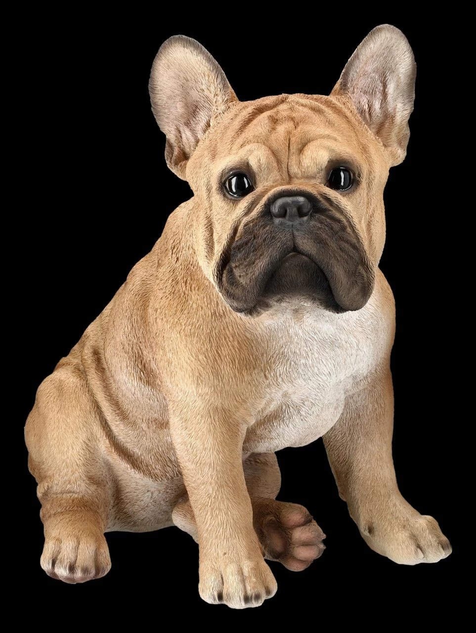 Wunderbar realistisch und detailreich gestaltet ist diese sitzende Figur einer Französischen Bulldogge von Hotant. Der herrlich griesgrämige Gesichtsausdruck kommt bei dieser Figur wunderbar zur Geltung. Auch wenn man es dieser Hunderasse nicht so ohne weiteres ansieht, sie sind wegen ihres fröhlichen und verspielten Wesen sehr beliebt und eigentlich regelrechte Kampfschmuser. Jeder Hundebesitzer weiß, dass sie sich sehr gerne ein Bett oder Sofa als Schlafplatz aussuchen, aber die Gefahr besteht bei dieser Französischen Bulldogge nicht, auch wenn diese Figur absolut realistisch aussieht. Sie ist einfach fantastisch aus hochwertigem Kunststein (Polyresin) gefertigt und mit viel Liebe handbemalt. Mit der Höhe von 40 cm, der Breite von 35 cm und der Tiefe von 26 cm ist die Figur einfach perfekt einem echten Hund nachempfunden. Wer die Französische Bulldogge kennt und diese Figur sieht, wird sie vermutlich sofort streicheln wollen. Die Figur von Hotant ist nicht nur eine tolle Deko, sie ist auch eine hochwertige und fantastische Trophäe für jeden Züchter, Verein oder Zuchtverband und natürlich auch ein perfektes Geschenk für alle Hundefreunde. Wenn aber der treue Begleiter seinen Menschen eines Tages zurück lässt, wird diese Figur, neben der Urne, aufgestellt immer an ihn erinnern.