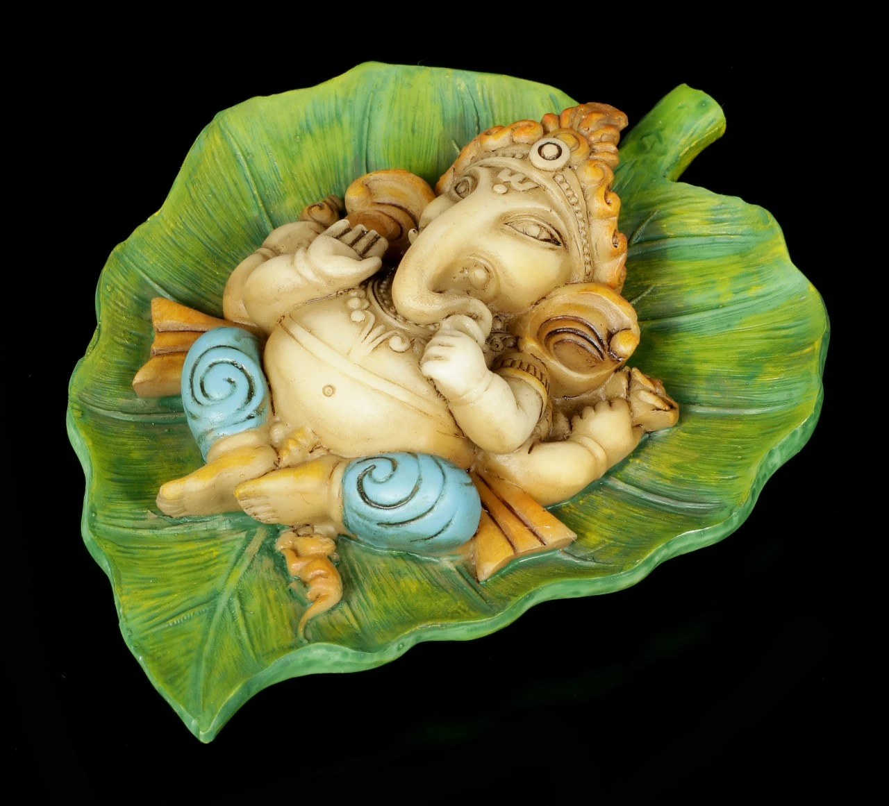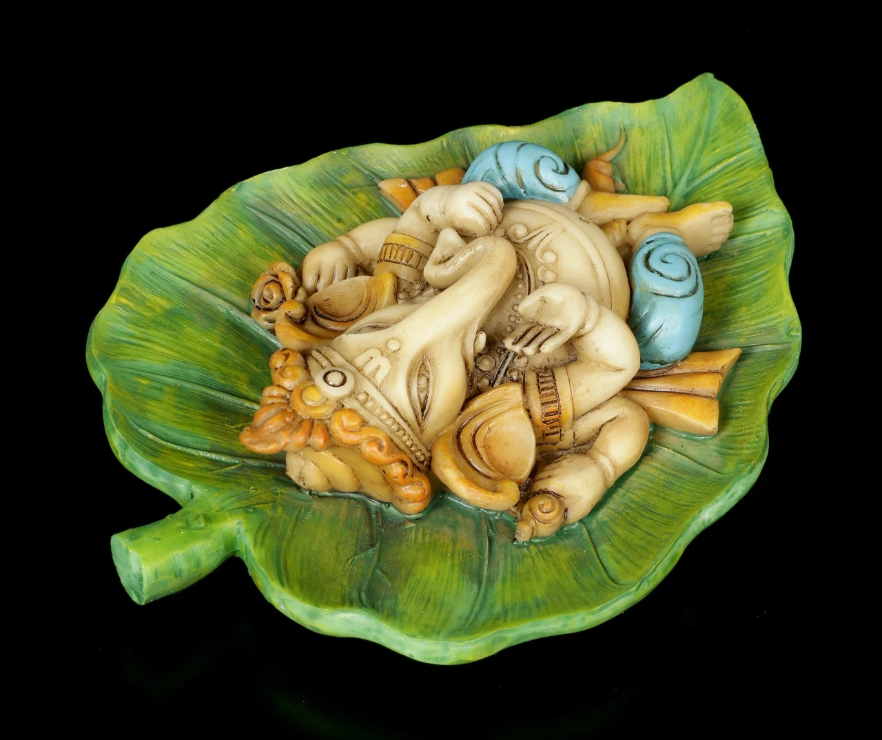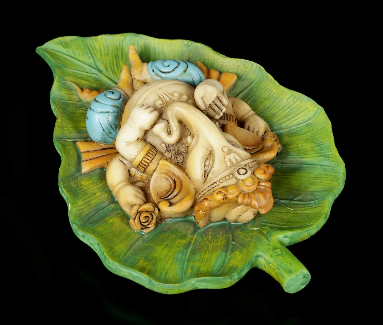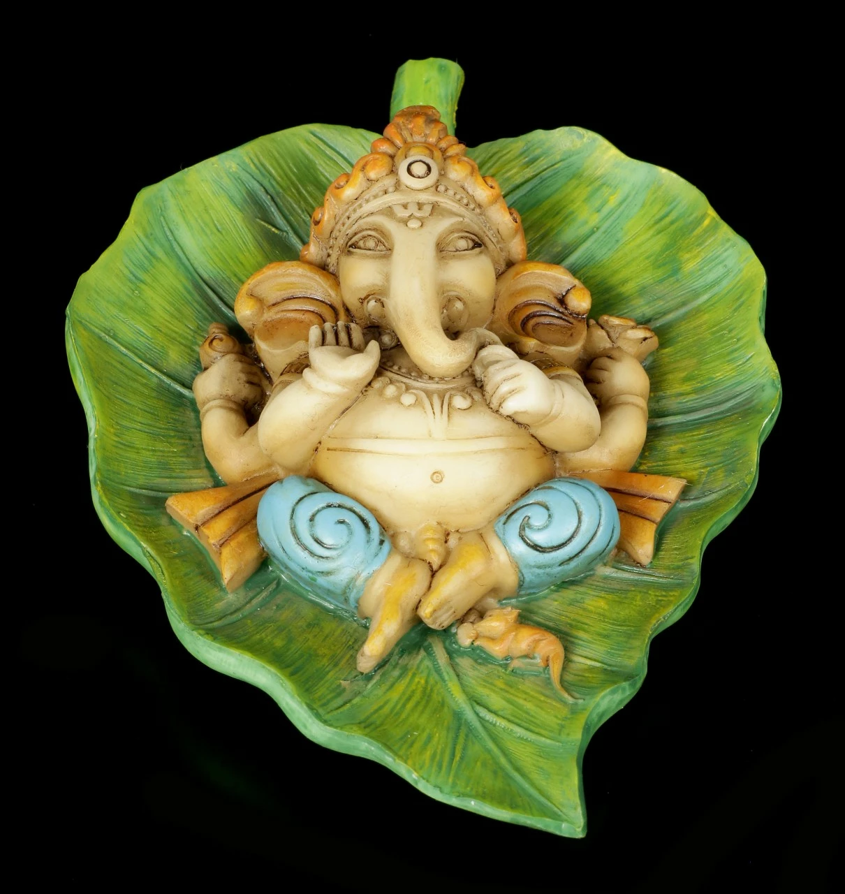 Ganesha liegt auf dem Blatt einer Pappelfeige. Die Pappelfeige wird auch Buddhabaum genannt. Diese wundervolle handbemalte Kunststein Buddha Figur wurde detailreich gestaltet und strahlt Ruhe, Macht und Besinnung aus. Ganeshas Begleiter, die Ratte, ist selbstverständlich mit auf dem Blatt.