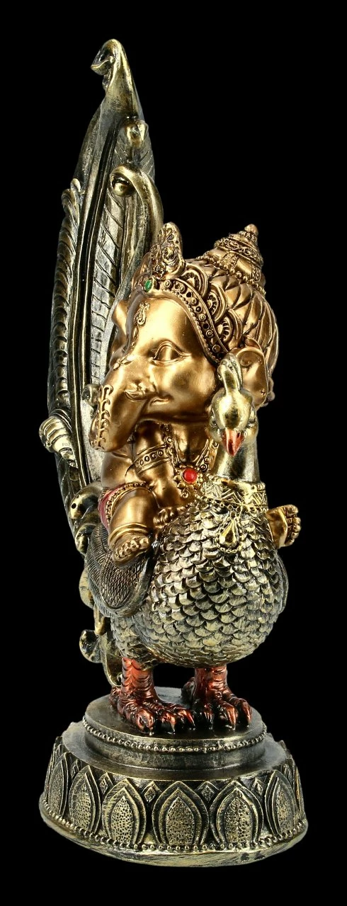 Außergewöhnlich und sehr dekorativ ist diese kleine Ganesha Figur, die auf einem Pfau reitet. Mit seiner ungewöhnlichen, bronzefarbenen Farbgebung hat diese effektvolle, sehr detailreich aus Kunststein (Polyresin) gefertigte Dekofigur einen edlen asiatischen Touch. Die wunderbare Ganesha Figur auf dem Pfau ist 24 cm hoch, 17 cm breit und 8 cm tief. Sie ist mit Sicherheit ein absoluter Blickfang in jedem Wohn- oder Arbeitsbereich.