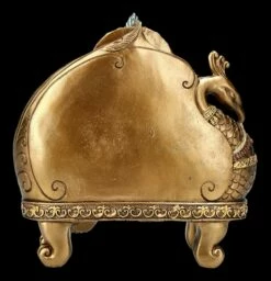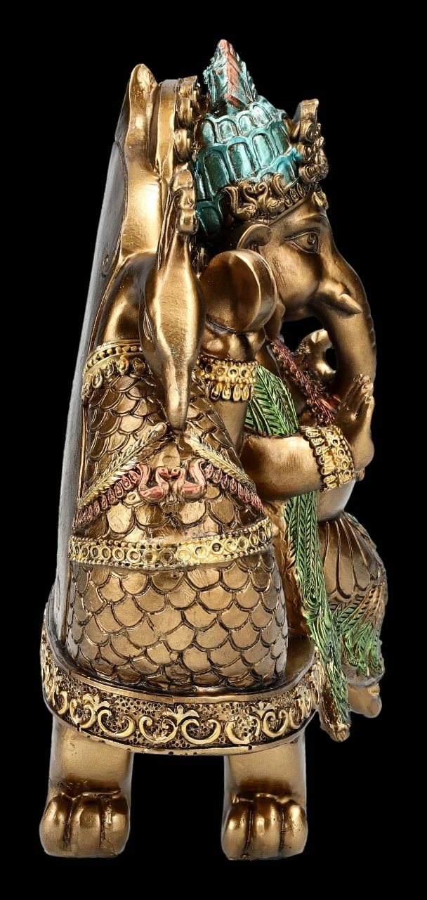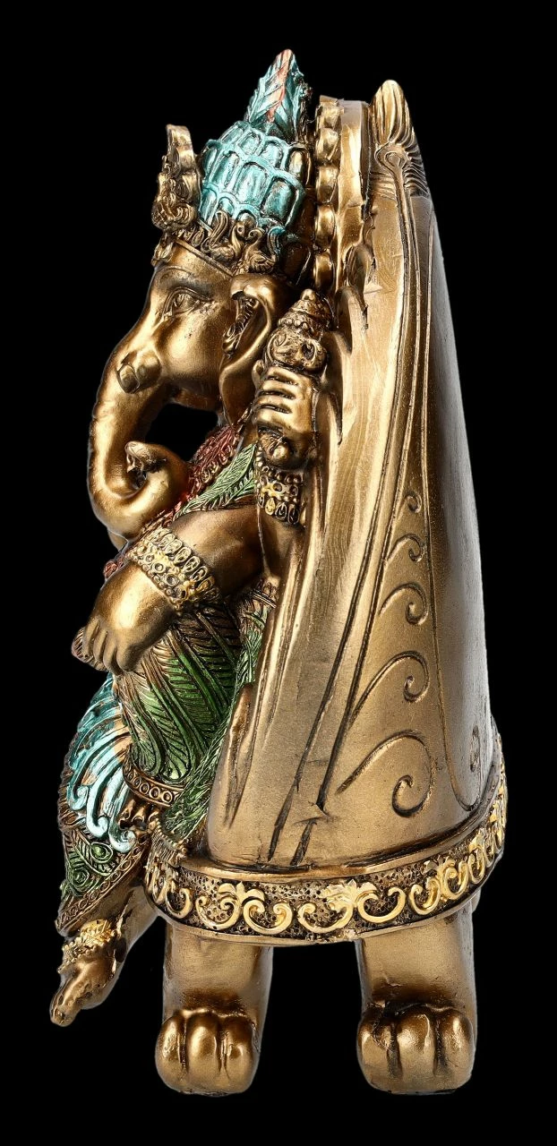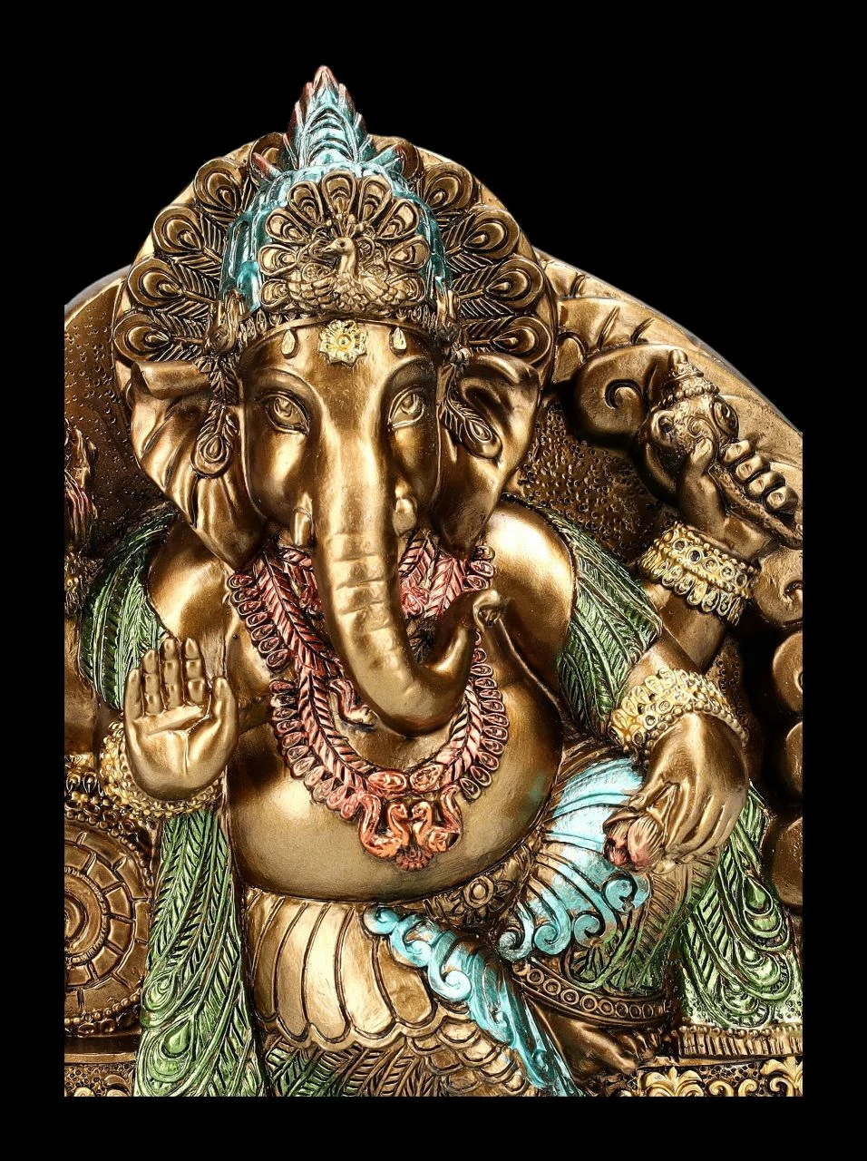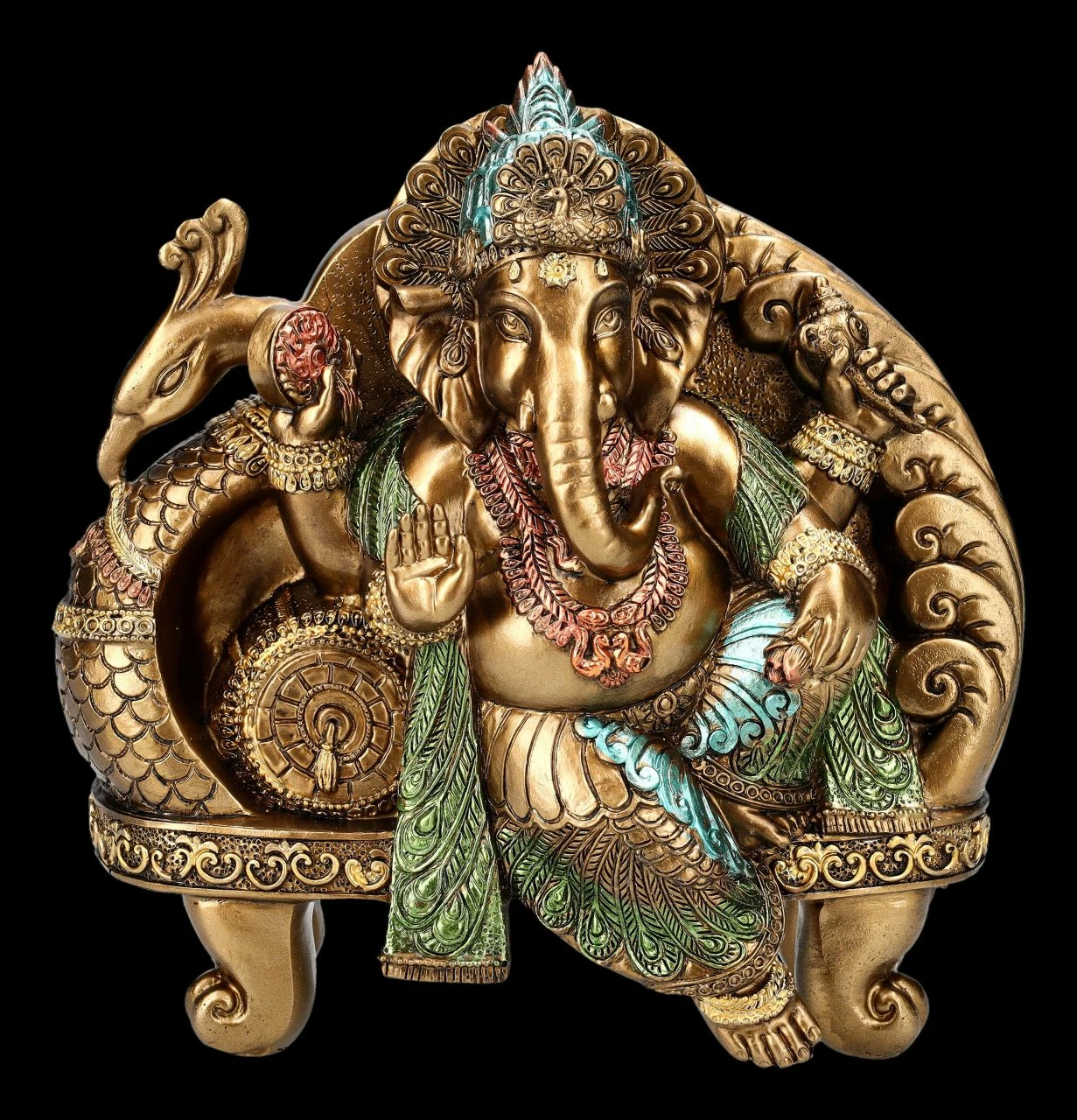 Nicht mehr nur in Asien ist Ganesha, der Gott mit dem Menschenkörper und dem Elefantenkopf außerordentlich beliebt, da er nicht nur lustig und nett anzusehen ist, sondern zeigt, dass man das Leben genießen kann. Er gilt als Symbol für eine leicht zugängliche Energie, für das Genießen der schönen Seiten des Lebens und seine lebenspraktische Weisheit. Bei dieser fantastischen Figur sitzt Ganesha auf einem reich verzierten Pfauen-Thron. Die wunderbare Gahesha-Figur auf dem Thron ist 18,5 cm hoch, 19 cm breit und 9 cm tief und wurde aus sorgfältig und detailreich handbemaltem Kunststein (Polyresin) gefertigt. Sie bringt asiatisches Feeling in jeden Bereich und wirkt durch die Farbgebung sehr authentisch. Diese wunderbare Figur des Gottes Ganesha ist auch ein perfektes Geschenk nicht nur für jeden, dem Sie eine gute Energie für einen Neubeginn wünschen, denn Ganesha ist auch der Gott der Weisheit, der Wissenschaften und der Künste.