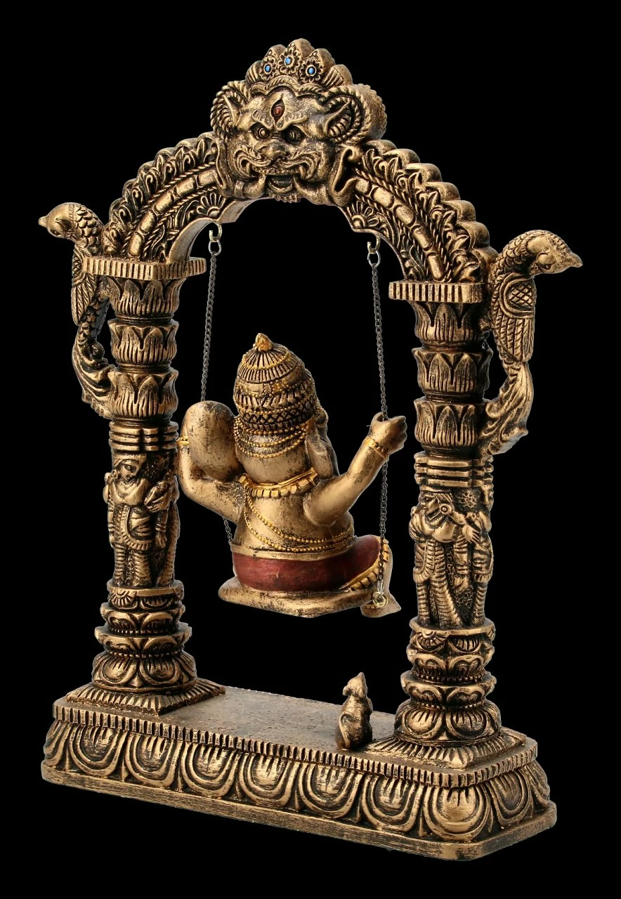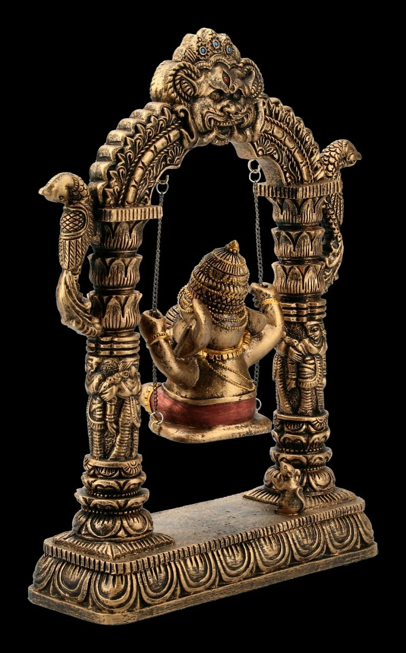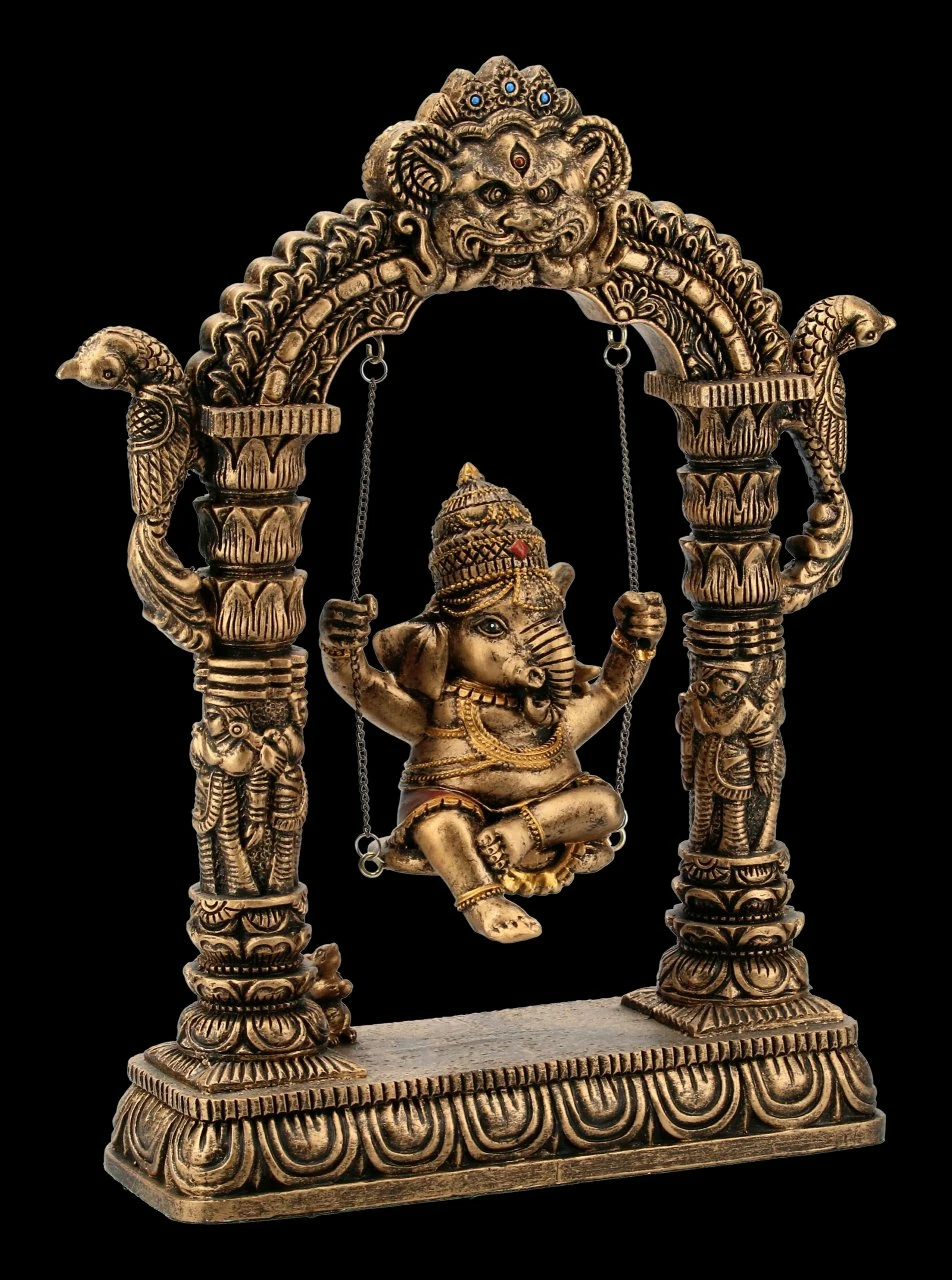 Der Elefantenköpfige Gott Ganesha sitzt fröhlich auf der Schaukel zwischen dem Weltentor. Ganesha steht für die Weisheit, aber auch für die Überwindung von Hindernissen und für einen guten Anfang. Die tolle Ganesha Figur ist mit vielen Details aufwändig aus Kunststein (Polyresin) gefertigt und sorgfältig handbemalt. Sie ist 24 cm hoch, 20 cm breit und 6 cm tief. Als Glücksbringer ist diese tolle Ganesha Figur ein ganz besonderes Geschenk. Sie ist aber auch in Ihrem eigenen Wohn- oder Arbeitsbereich der absolute Hingucker.