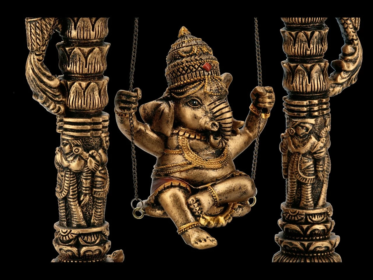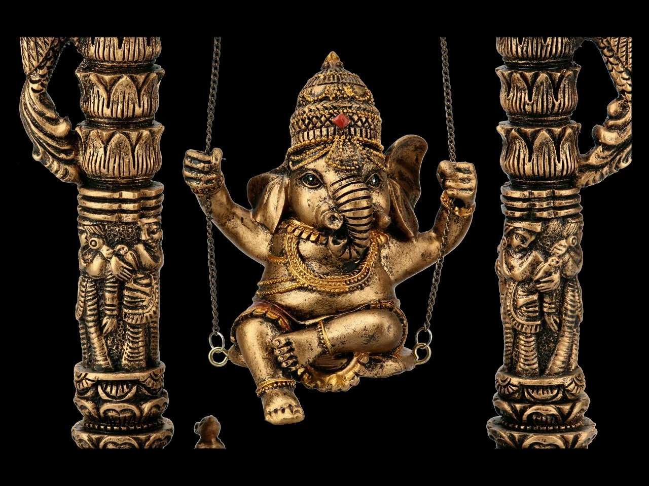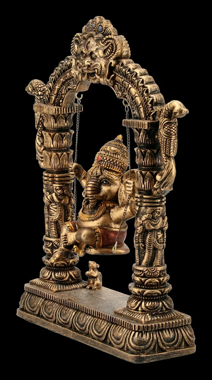 Der Elefantenköpfige Gott Ganesha sitzt fröhlich auf der Schaukel zwischen dem Weltentor. Ganesha steht für die Weisheit, aber auch für die Überwindung von Hindernissen und für einen guten Anfang. Die tolle Ganesha Figur ist mit vielen Details aufwändig aus Kunststein (Polyresin) gefertigt und sorgfältig handbemalt. Sie ist 24 cm hoch, 20 cm breit und 6 cm tief. Als Glücksbringer ist diese tolle Ganesha Figur ein ganz besonderes Geschenk. Sie ist aber auch in Ihrem eigenen Wohn- oder Arbeitsbereich der absolute Hingucker.