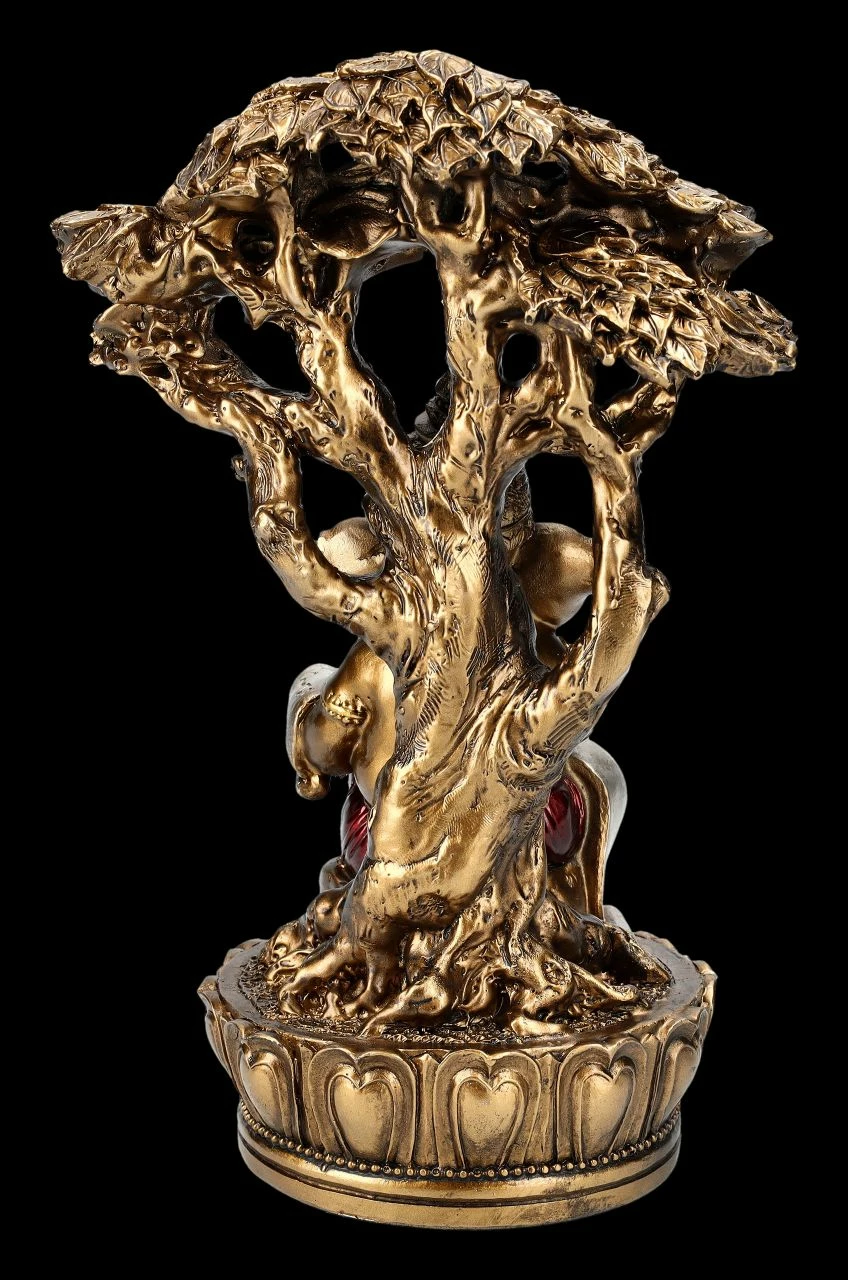 Ist es der Baum der Erkenntnis, unter dem Ganesha sitzt? Er scheint sich voll auf seine Gedanken zu konzentrieren, die er auf einer Schriftrolle festhält. Der nicht nur in Indien beliebte elefantenköpfige Gottt Ganesha steht immerhin für Geist, Intellekt, Bewusstsein und Selbstbewusstsein. Ganesha ist in Asien als Gott der Weisheit, der Wissenschaften und der Künste.auch für Schulkinder von großer Bedeutung und gilt nicht nur im Hinduismus und Buddhismus als Symbol für eine leicht zugängliche Energie, das Genießen der schönen Seiten des Lebens und eine lebenspraktische Weisheit. Die handbemalte Gahesha-Figur mit der Schriftrolle unter einem Baum ist 22 cm hoch, 14,5 cm breit und 9,5 cm tief und wurde detailreich aus Kunststein (Polyresin) gefertigt. Sie bringt asiatisches Feeling in jeden Bereich und wirkt durch die Farbgebung sehr authentisch. Diese wunderbare Figur des Gottes Ganesha ist auch als Glücksbringer ein perfektes Geschenk.