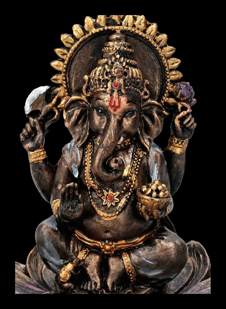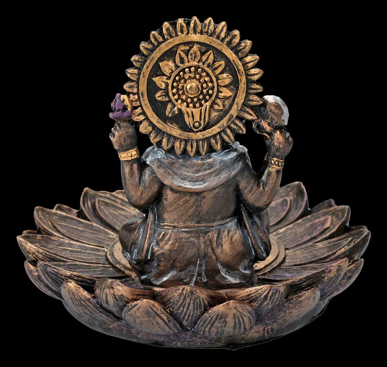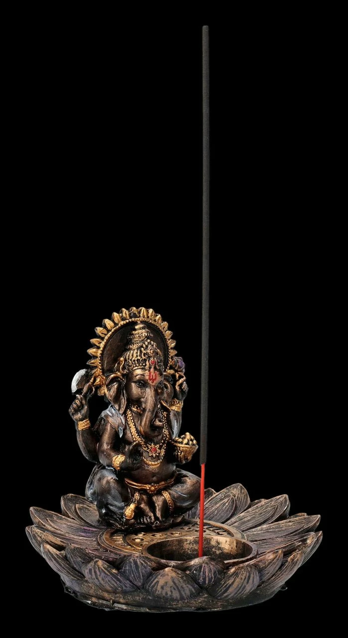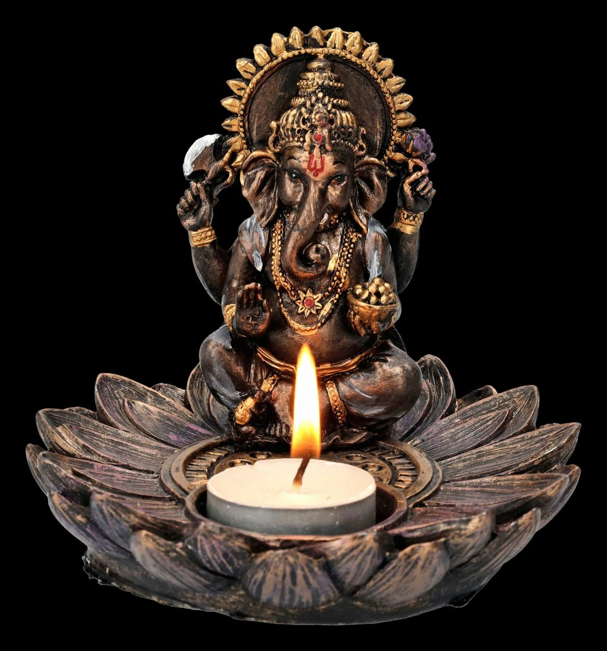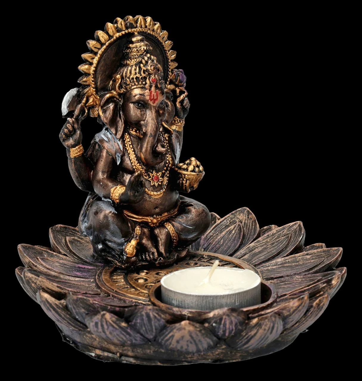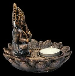 Die elefantenköpfige Gottheit Ganesha mit den vier Armen wird nicht nur im Hinduismus verehrt. Er gilt als Gott der Weisheit, der Wissenschaften und der Künste und seine vier Arme repräsentieren Geist, Intellekt, Bewusstein und Ego. Diese fein handbemalte Ganesha-Figur aus Kunststein (Polyresin) sitzt auf einer Lotosblüte mit einer Öffnung für ein Teelicht, das die Figur sanft beleuchten kann. Der 11 cm hohe Teelichthalter mit dem Durchmesser von 13 cm kann auch als Halter für ein Räucherstäbchen dienen, das – wie auch das Teelicht – nicht in der Lieferung enthalten ist. Räucherstäbchen erhalten Sie jedoch in zahlreichen Duftrichtungen in unserem Shop.