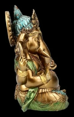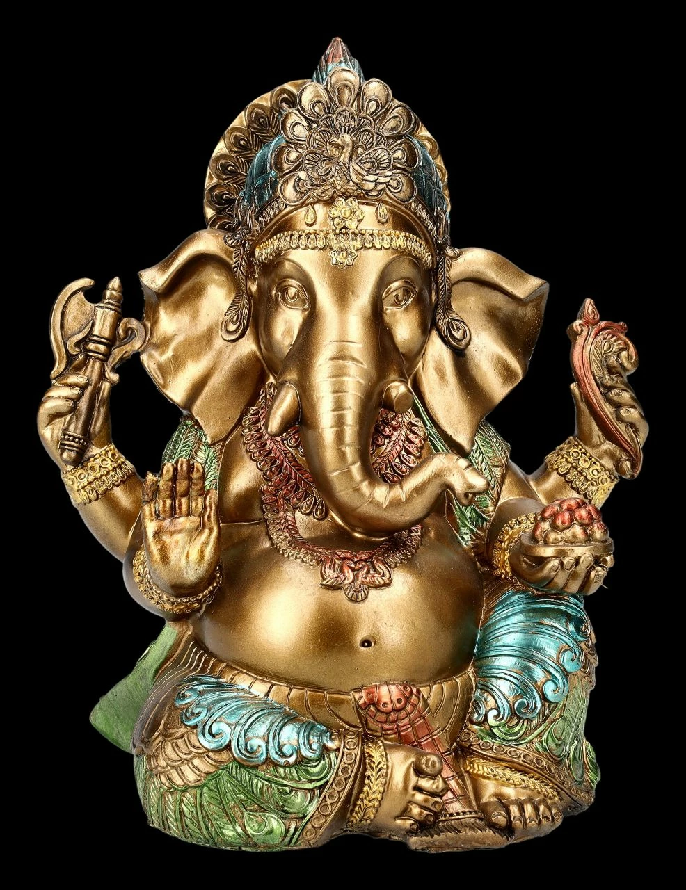 Der nicht nur in Asien sehr beliebte Gott Ganesha mit dem Menschenkörper und dem Elefantenkopf wird stets mit vier Armen dargestellt. Die vier Arme stehen für die vier Aspekte des feinstofflichen Körpers – also für Geist, Intellekt, Bewusstsein und Selbstbewusstsein. Ganesha gilt nicht nur als Symbol für eine leicht zugängliche Energie, für das Genießen der schönen Seiten des Lebens und seine lebenspraktische Weisheit, sondern ist in Asien als Gott der Weisheit, der Wissenschaften und der Künste.auch für Schulkinder von großer Bedeutung. Die wunderbare Gahesha-Figur mit den vier Händen ist 20 cm hoch, 17 cm breit und 12,5 cm tief und wurde aus sorgfältig und detailreich handbemaltem Kunststein (Polyresin) gefertigt. Sie bringt asiatisches Feeling in jeden Bereich und wirkt durch die Farbgebung sehr authentisch. Diese wunderbare Figur des Gottes Ganesha ist auch als Glücksbringer ein perfektes Geschenk.