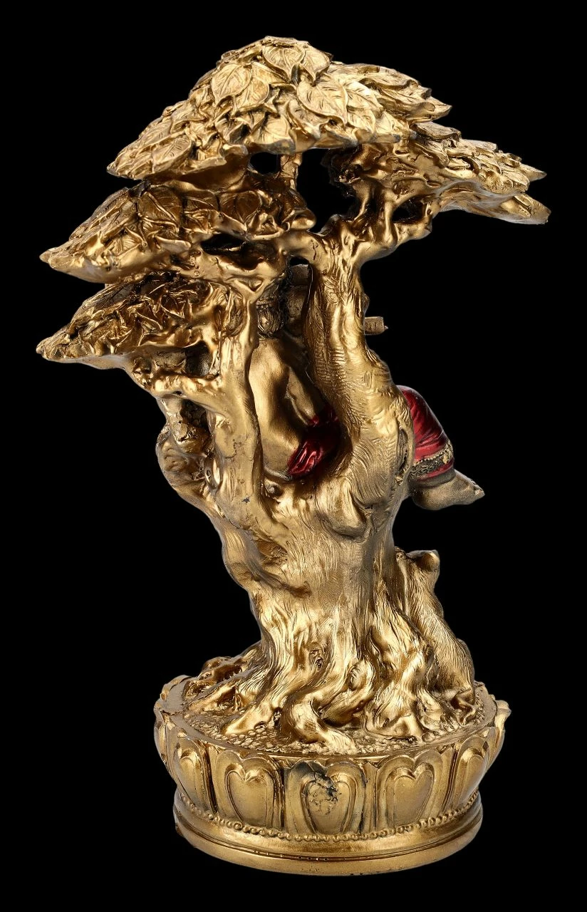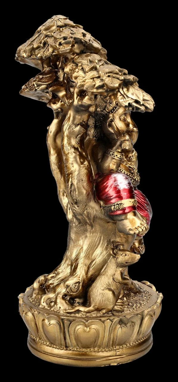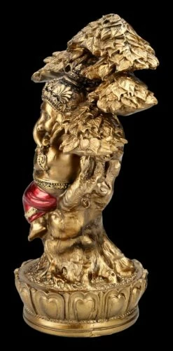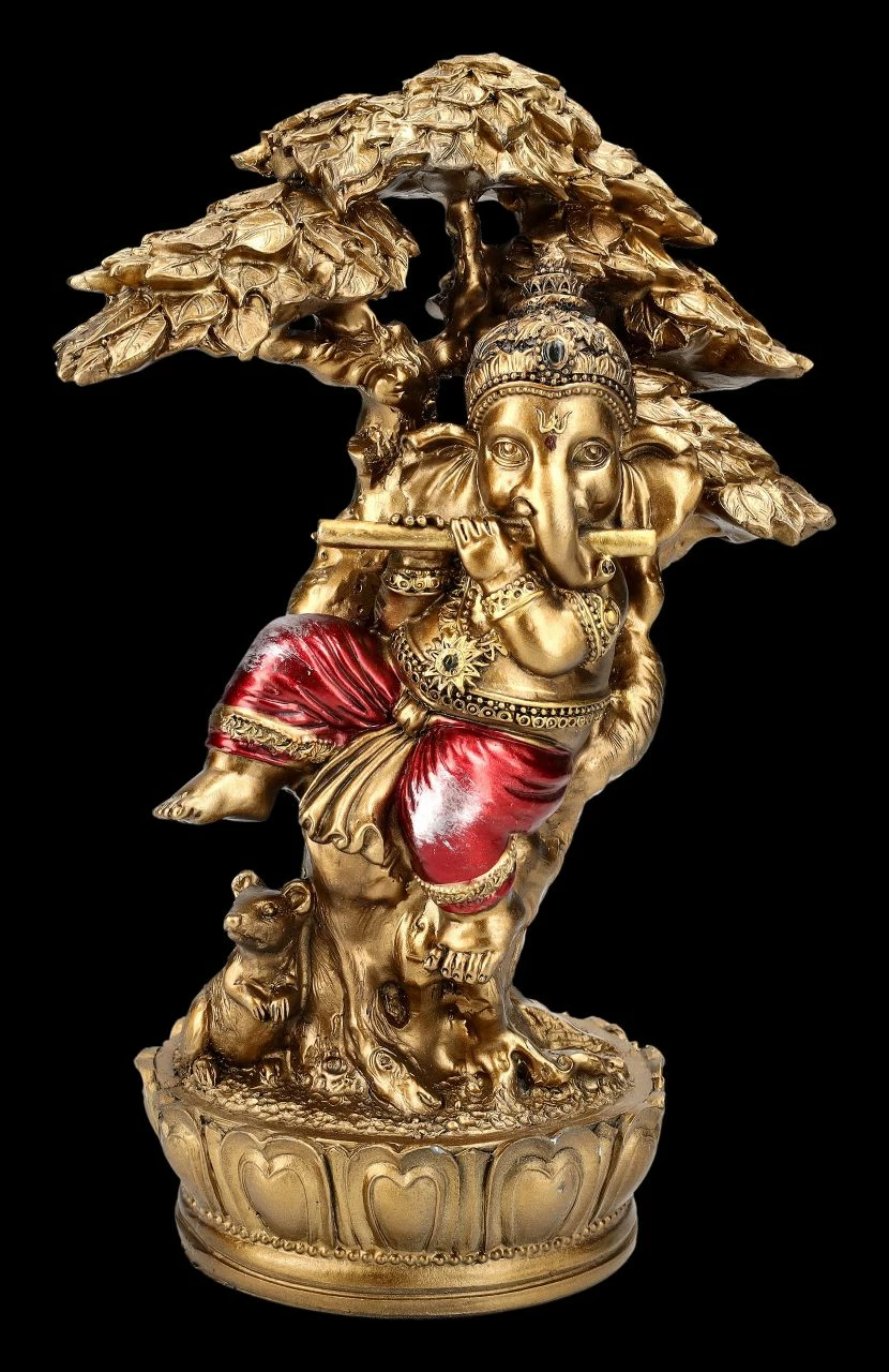 Selbst die Tiere lauschen gebannt, wenn der nicht nur in Indien beliebte Gottt Ganesha auf seiner Flöte spielt. Der elefantenköpfige Gott Ganesha mit dem menschlichen Körper ist in Asien als Gott der Weisheit, der Wissenschaften und der Künste.von großer Bedeutung und gilt nicht nur im Hinduismus und Buddhismus als Symbol für das Genießen der schönen Seiten des Lebens, aber auch für die lebenspraktische Weisheit und für eine leicht zugängliche Energie. Bei der goldfarben handbemalten Gahesha-Figur sticht die leuchtend rote Hose besonders hervor. Die unter dem Baum musizierende faszinierende Ganesha Figur ist 22 cm hoch, 15,5 cm breit und 9,5 cm tief und wurde detailreich aus Kunststein (Polyresin) gefertigt. Sie bringt nicht nur asiatisches Feeling in jeden Bereich, sondern ist auch als Glücksbringer ein perfektes Geschenk.
