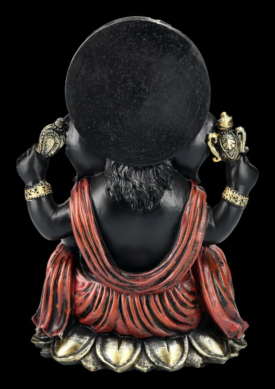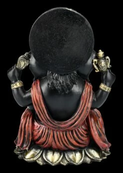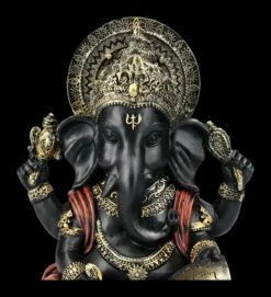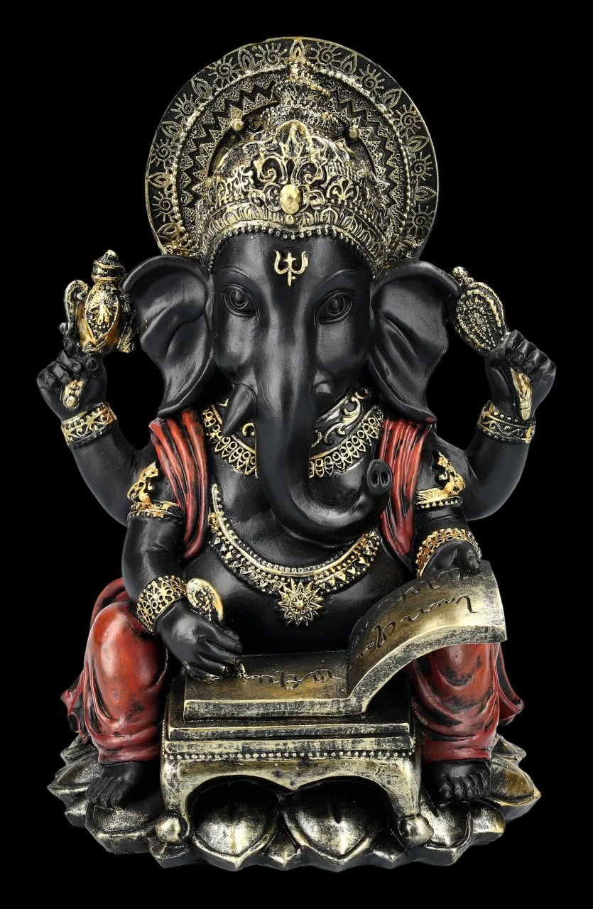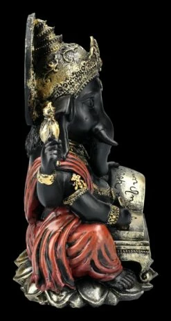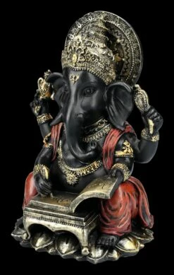 Die in dunklen Farben gehaltene Figur des Gottes Ganesha schreibt konzentriert seine Weisheiten in ein Buch. Die fantastische und sehr schön handbemalte Ganesha-Figur ist 20,5 cm hoch, 15 cm breit und 12 cm tief. Sie wurde aus sorgfältig und detailreich handbemaltem Kunststein (Polyresin) gefertigt und bringt asiatisches Feeling in jeden Bereich. Ganesha, der Gott mit dem Menschenkörper und dem Elefantenkopf ist nicht nur im Hinduismus und Buddhismus außerordentlich beliebt. Er gilt als Symbol für eine leicht zugängliche Energie, für das Genießen der schönen Seiten des Lebens und eine lebenspraktische Weisheit und ist als Gott der Weisheit, der Wissenschaften und der Künste in Asien auch für Schulkinder von großer Bedeutung. Diese wunderbare Figur des Gottes Ganesha ist auch als Glücksbringer und als Symbol für lebenspraktische Weisheit ein perfektes Geschenk.