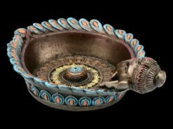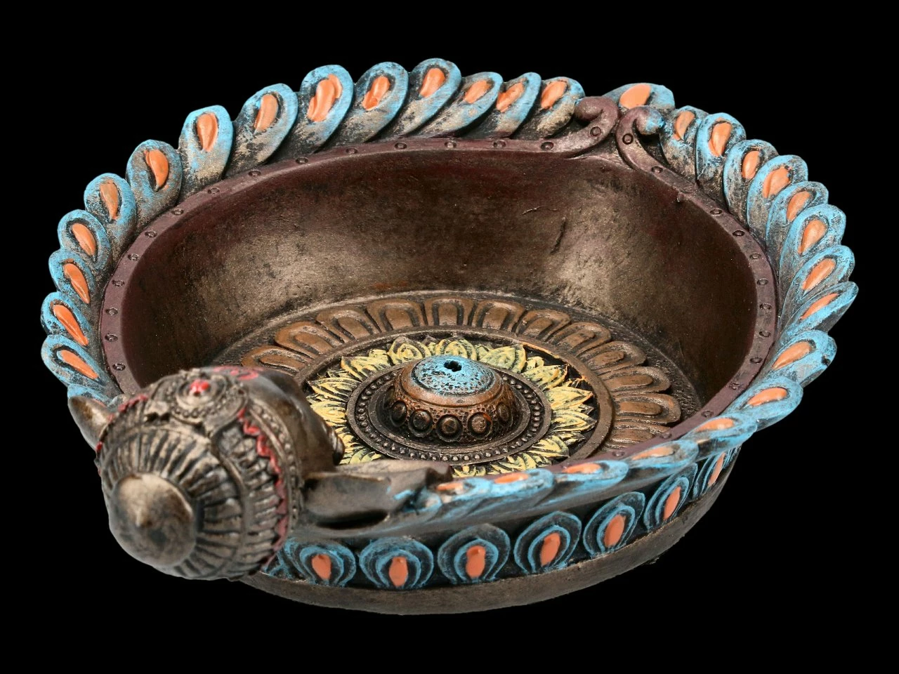 Die edel handbemalte Schale mit dem Ganesha Kopf ist mit dem schönen indischen Touch der perfekte Halter für Räucherstäbchen. Mit der Höhe von 4,5 cm, der Breite von 10,5 cm und der Tiefe von 14,5 cm passt der aus Kunststein (Polyresin) detailreich gefertigte und in Bronzetönen mit blauen und roten Akzenten handbemalte Räucherstäbchenhalter in jedes Ambiente. Die Lieferung erfolgt ohne Räucherstäbchen, die Sie jedoch in großer Auswahl für jeden Geschmack in unserem Shop finden.