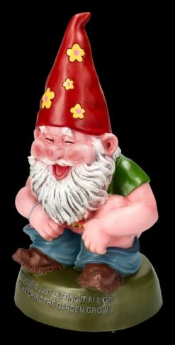 Ganz schön frech – der fröhliche Hippie Gnom lässt einfach seine Hosen fallen. Der Gartenzwerg steht auf einem Podest, auf dem übersetzt zu lesen ist: ‚Glück ist, einfach alles loszulassen und dem Garten beim Wachsen zuzusehen.‘, aber anscheinend möchte er mit Dünger etwas nachhelfen. Aber hoffentlich stört sich der Gartennachbar nicht daran… Der fröhlich lachende Gartenzwerg trägt eine mit Hippieblumen verzierte Zipfelmütze. Er ist 28 cm hoch, 15 cm breit und 14 cm tief und wurde aus handbemaltem Kunststein (Polyresin) gefertigt. Der Gartenzwerg-Hippie, der die Hosen runter lässt, ist eine freche und lustige Deko, aber auch ein witziges Geschenk für ewige Hippies.