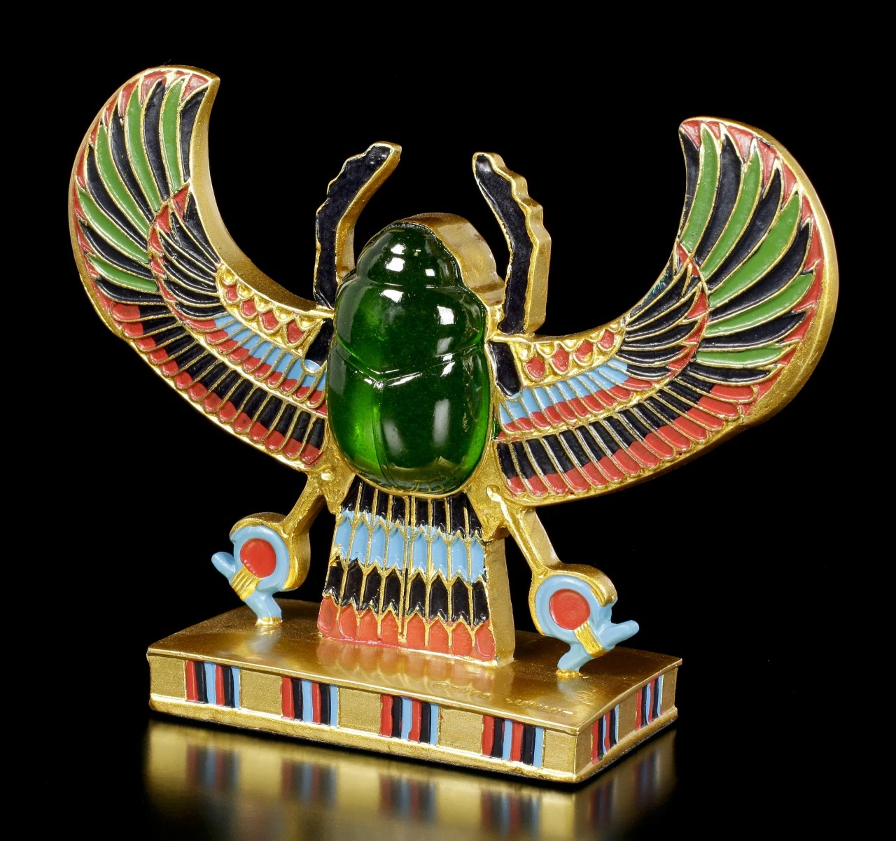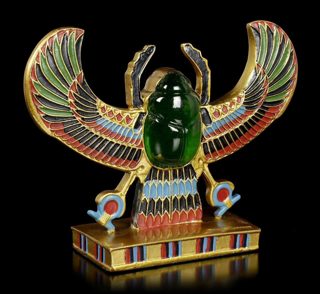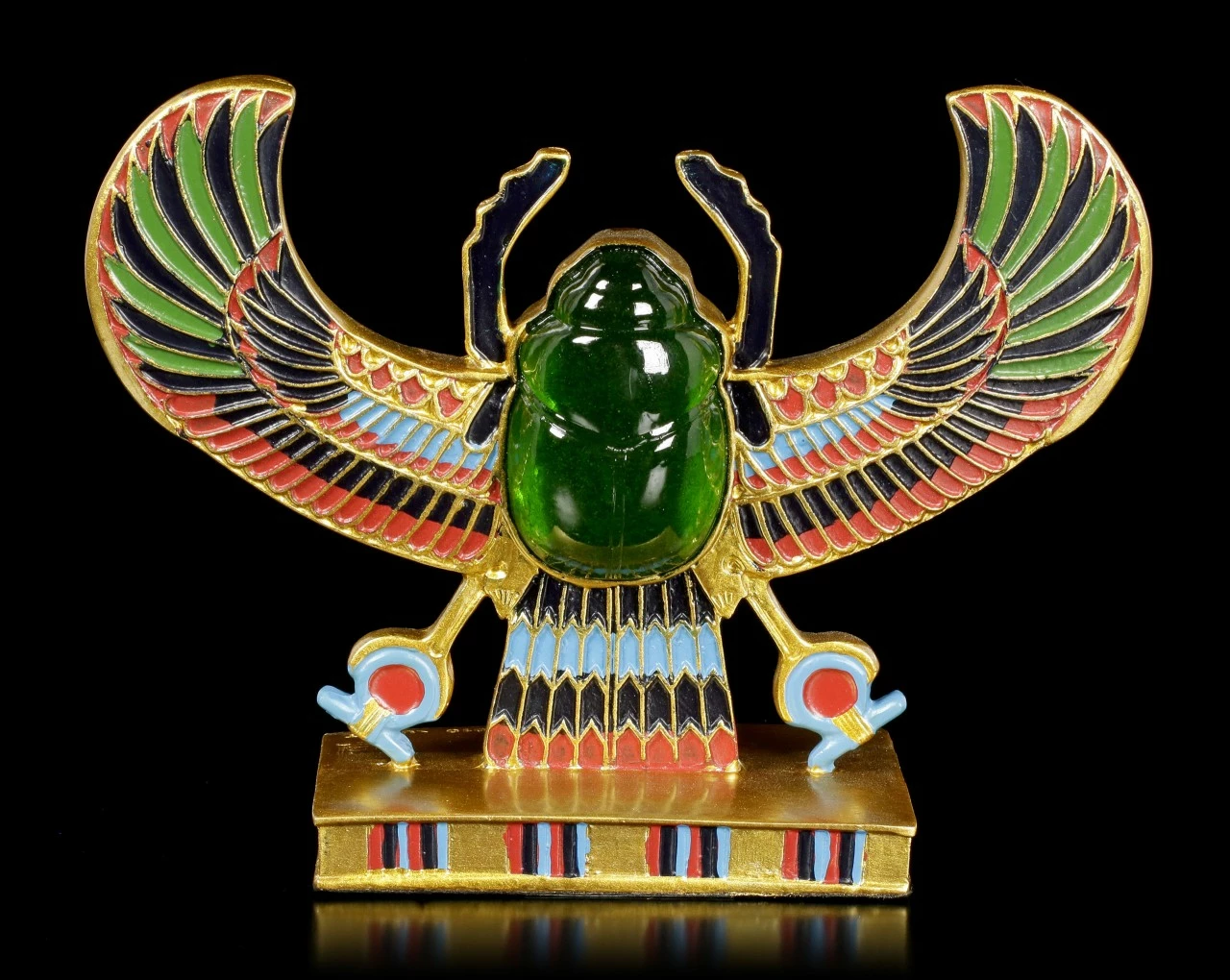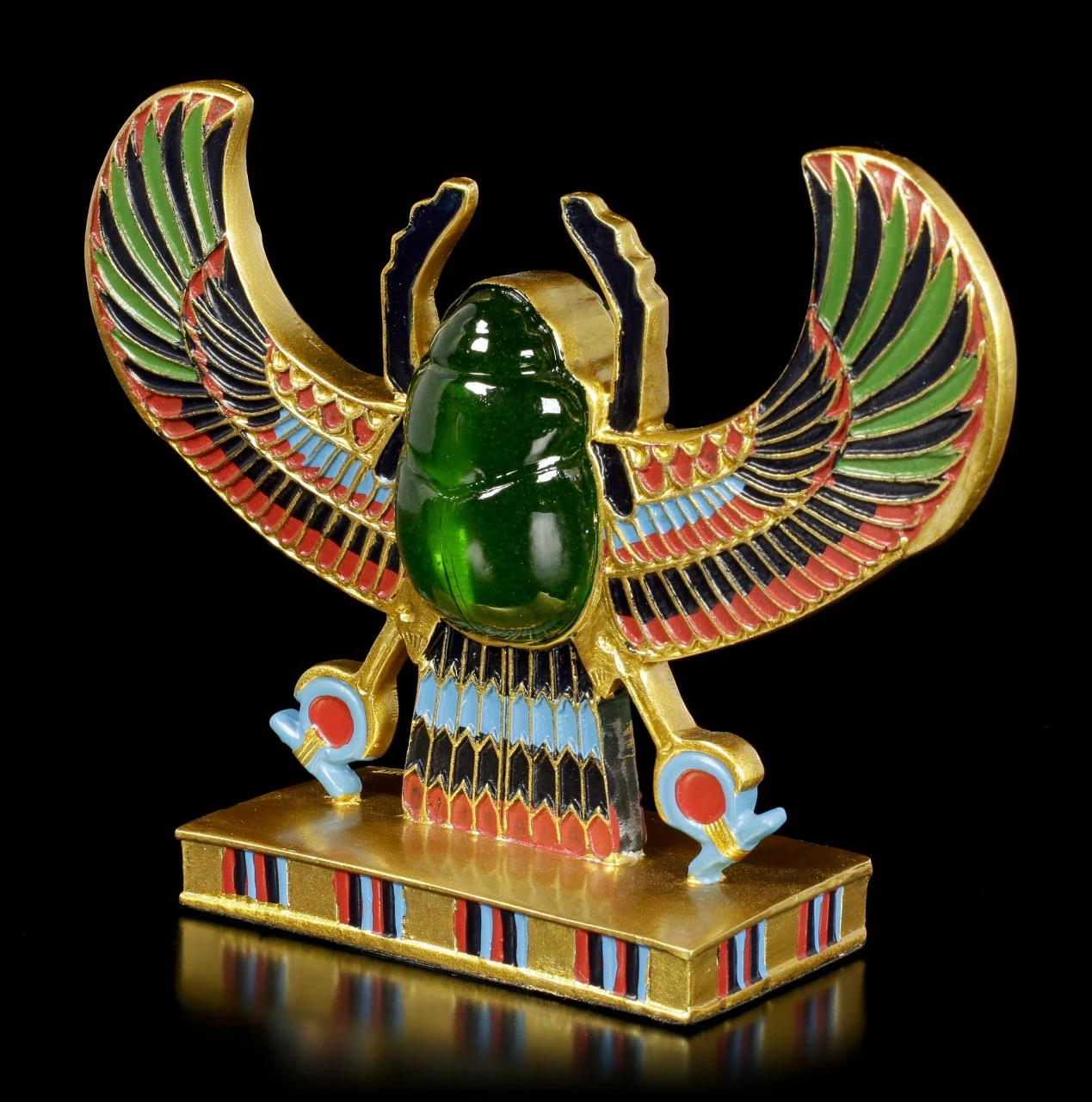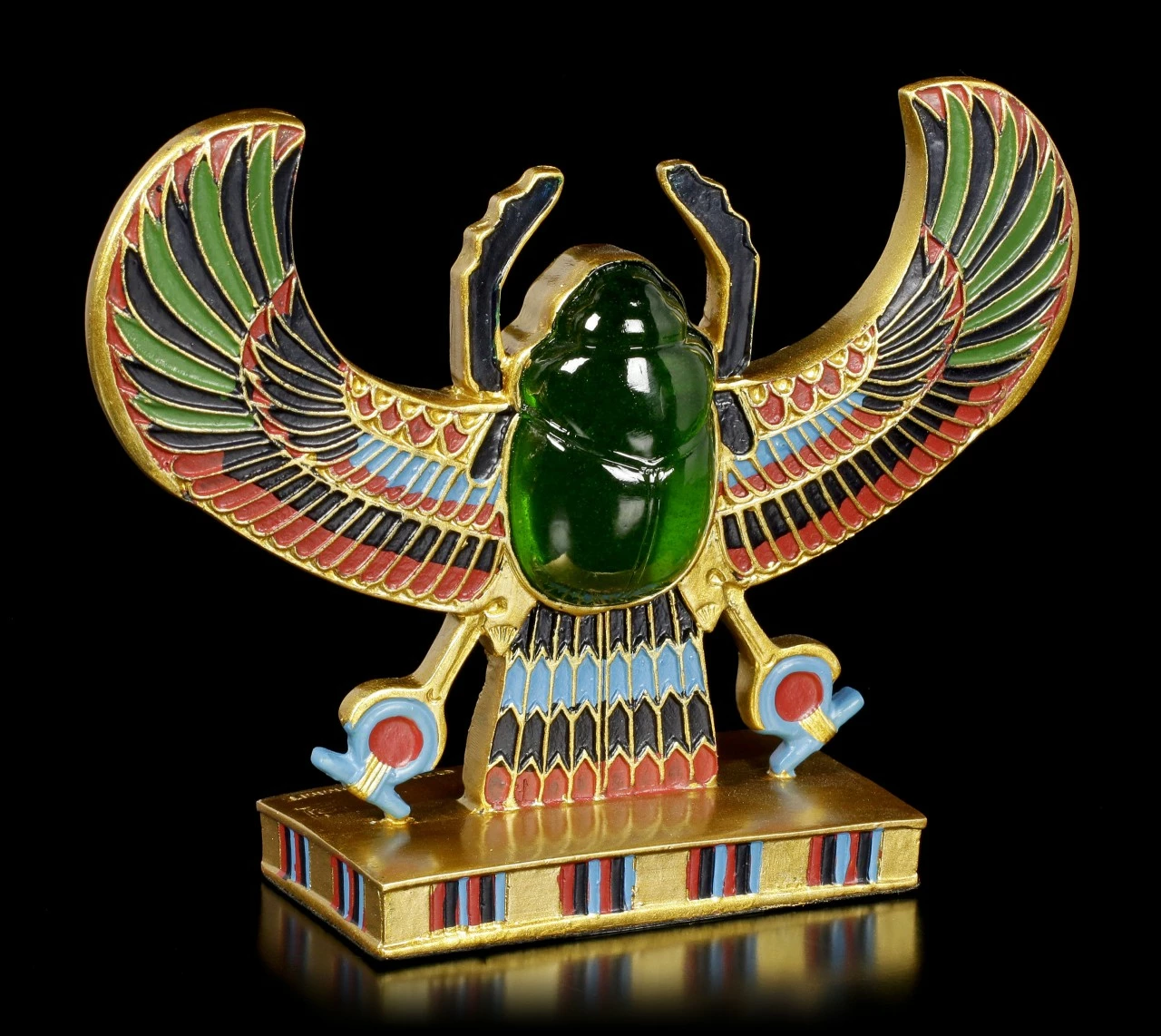 Der edel Skarabäus mit ausgebreiteten Flügen ist für jeden Liebhaber des Ägyptischen ein Must Have. Der Korpus des handbemalten Kunststein Skarabäus ist aus klarem grünem Resin und in Kombination mit den bunten Flügeln einfach ein Highlight.