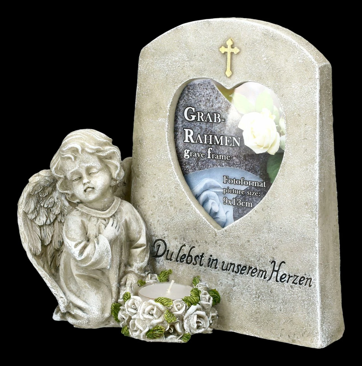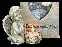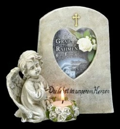 ‚Du lebst in unserem Herzen‘ steht auf dem liebevoll aus handbemaltem Kunstein (Polyresin) gefertigten Bilderrahmen, der von einem kleinen bezaubernden Grabengel bewacht wird. Der Bilderrahmen bietet in einem ausgeschnittenen Herz Platz fĂŒr ein schönes Erinnerungsfoto und die mit Rosen geschmĂŒckte Teelichthalterung ergĂ€nzt die romantische Gestaltung. Die Grabengel Figur mit dem Bilderrahmen und dem Teelicht hat eine Höhe und Breite von je ca. 20 cm und eine Tiefe von 9 cm. Die Lieferung erfolgt ohne Teelicht.