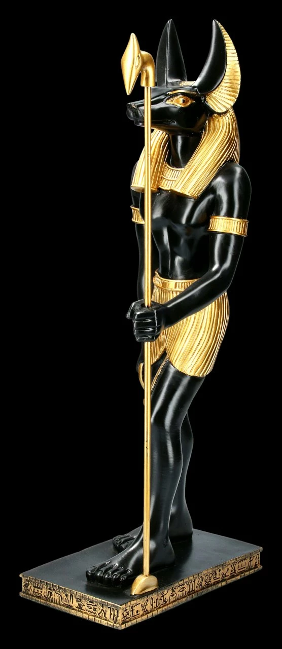 Der Gott Anubis wird Schakalsgestallt abgebildet. Er leitet das Totengericht und geleitet Seelen in das Totenreich. Außerdem ist er der Gott des Todes, der Totenriten und der Mumifizierung.