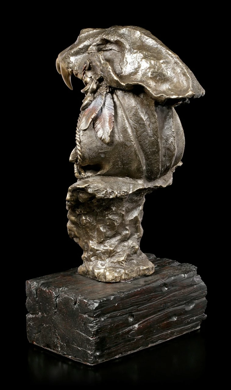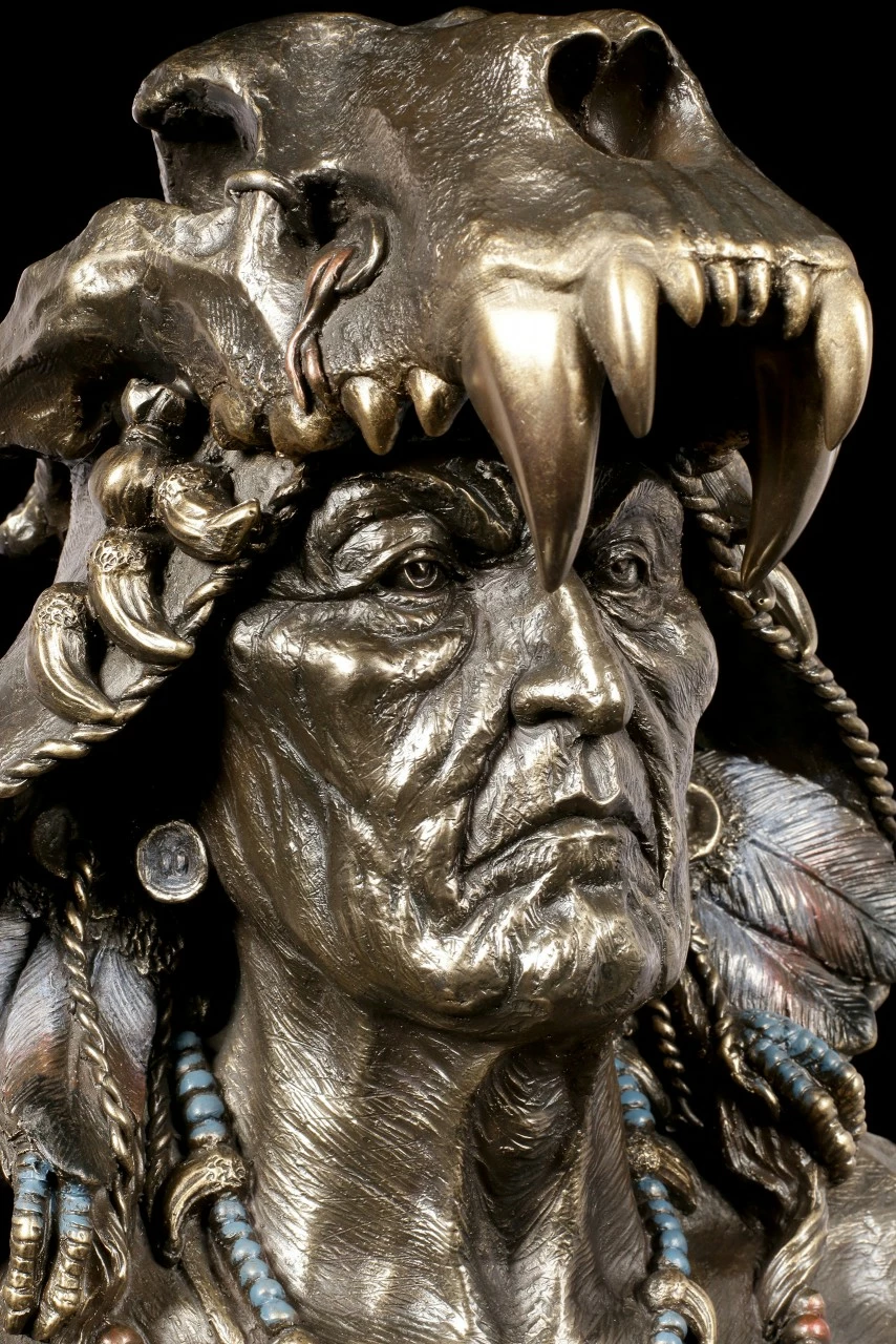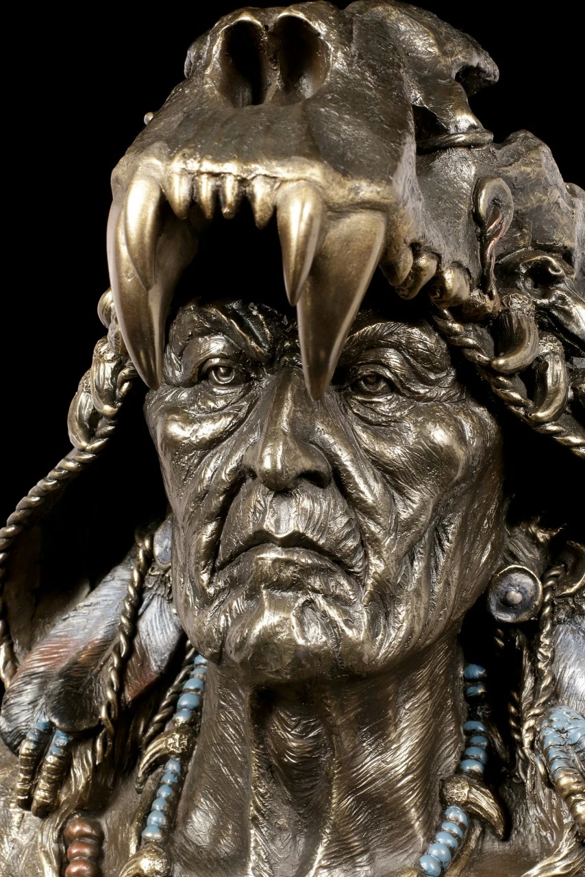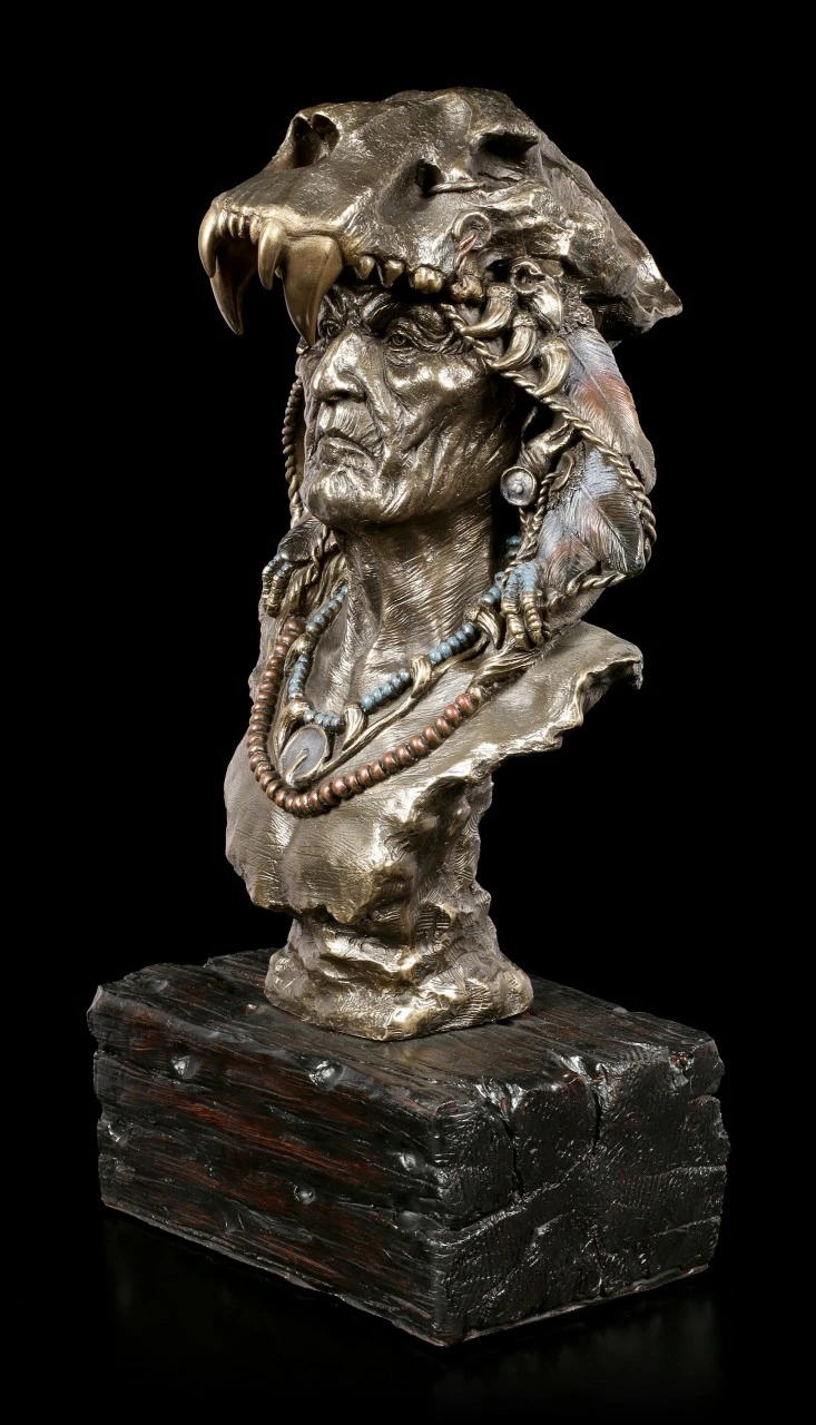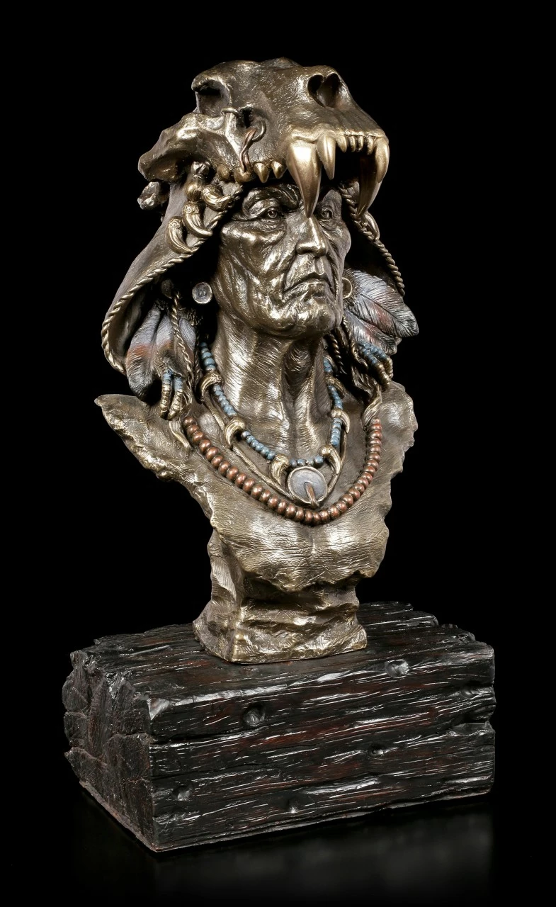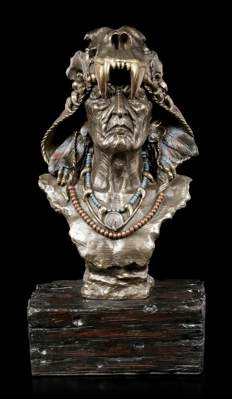 Achak ist der Medizinmann in seinem Indianer Stamm. Als Kopfschmuck trägt er den Schädel eines Raubtieres – sein Seelentier ist ein Säbelzahntiger. Die auf einem Sockel stehende edel bronzierte und colorierte Indianer Büste von Willow Hall ist außerordentlich detailreich aus Kunststein (Polyresin) gefertigt. Sie ist sehr beeindruckend und besticht durch die vielen wunderbaren Details. Die fantastische Indianer Büste ist ein Blickfang in jedem Interieur.