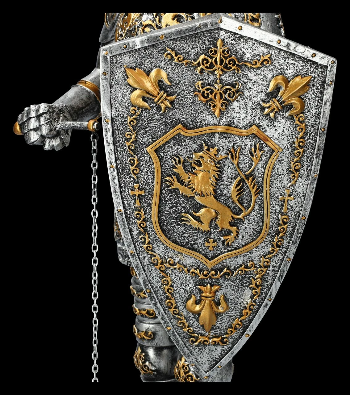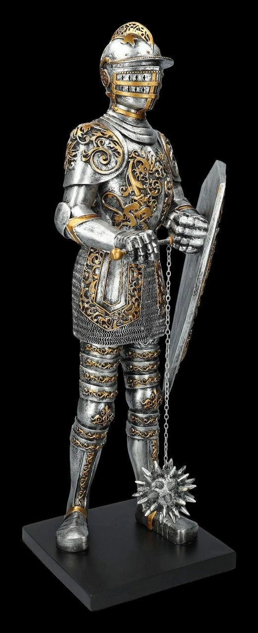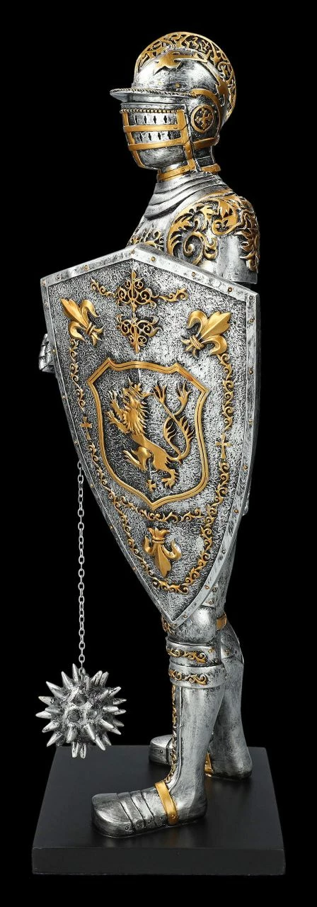 Stolz präsentiert der edle Ritter das Wappen seines Hauses.mit dem Löwen, der demonstrieren soll, dass Mut, Tapferkeit und Wehrhaftigkeit auf den Träger des Wappens übergehen. Die reiche goldfarbene Verzierung seiner silberfarbenen Rüstung des Ritters beweist, dass er aus hohem Hause stammt. Der Morgenstern zeigt, dass er durchaus überzeugt ist, jedes Turnier zu gewinnen und sich als Sieger auf den Sockel heben zu lassen. Die prächtige Ritterfigur mit dem Morgenstern wurde äußerst detailreich aus Kunststein (Polyresin) gefertigt und mit feinen Details in Gold und Silber handbemalt. Mit der Höhe von 56 cm, der Breite von 21 cm und der Tiefe von 17 cm ist der edle Ritter eine beeindruckende Deko und sollte unbedingt da hingestellt werden, wo er Gäste gebührend empfangen kann. Der Ritter mit dem Morgenstern ist aber auch ein fantastisches Geschenk für jeden Mittelalter-Fan.
