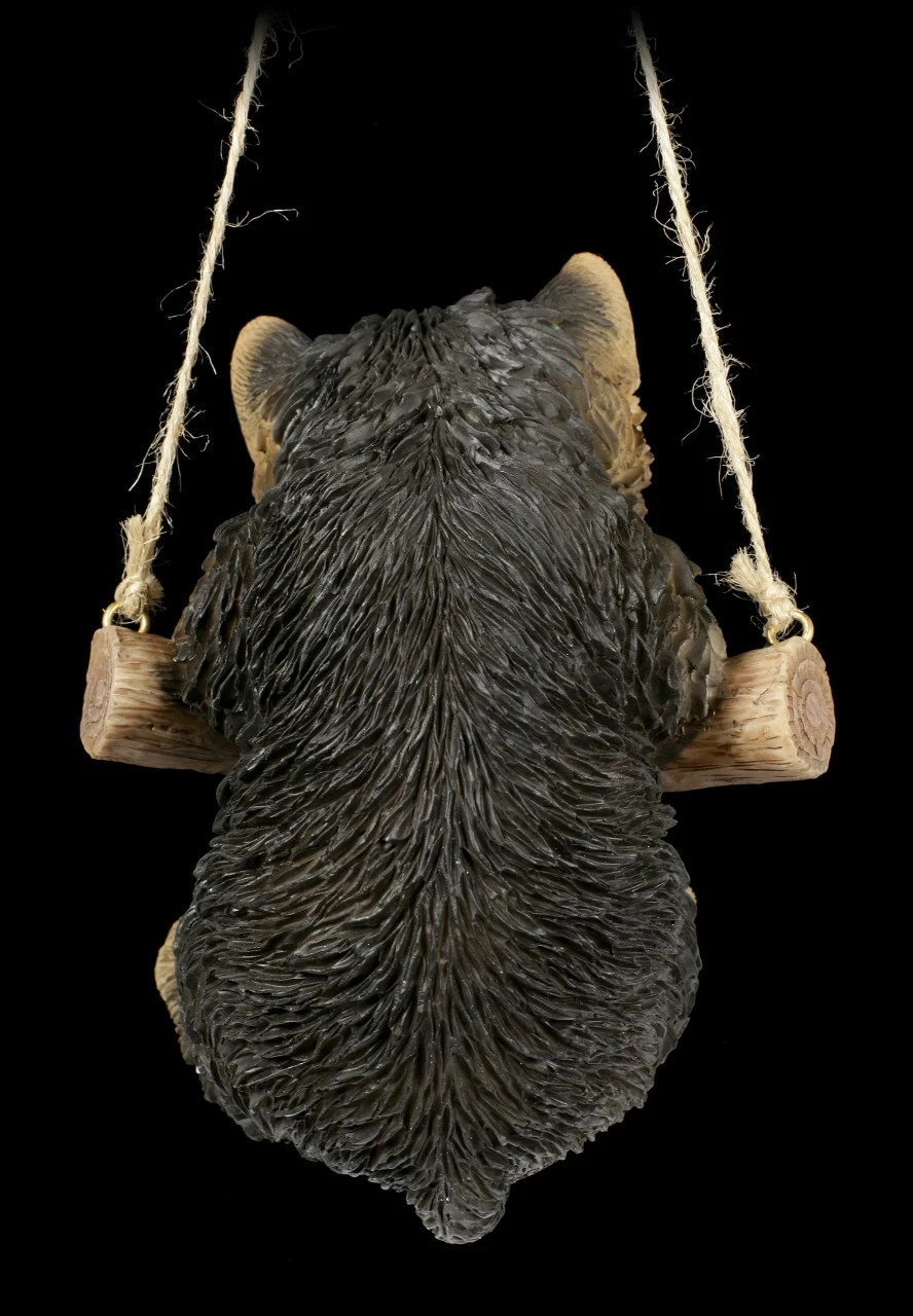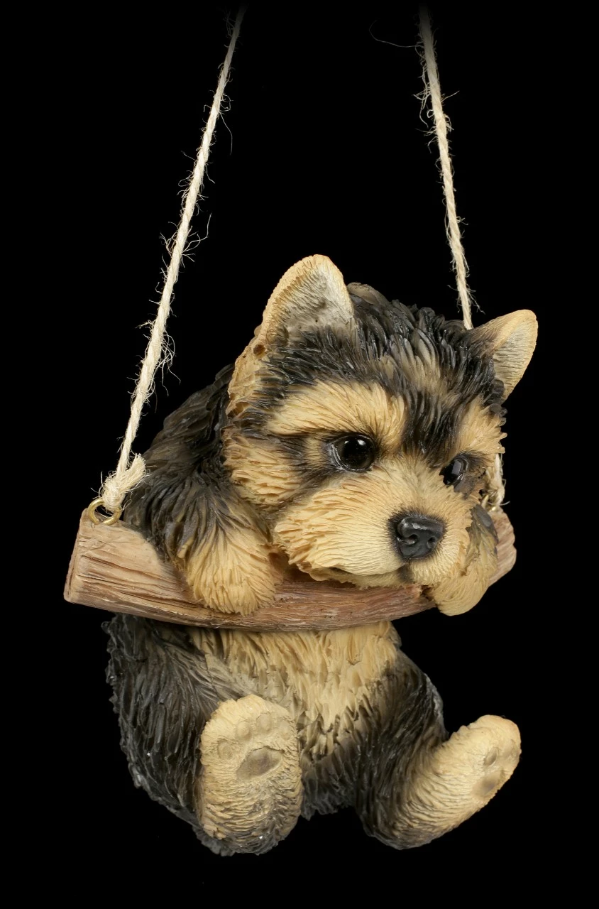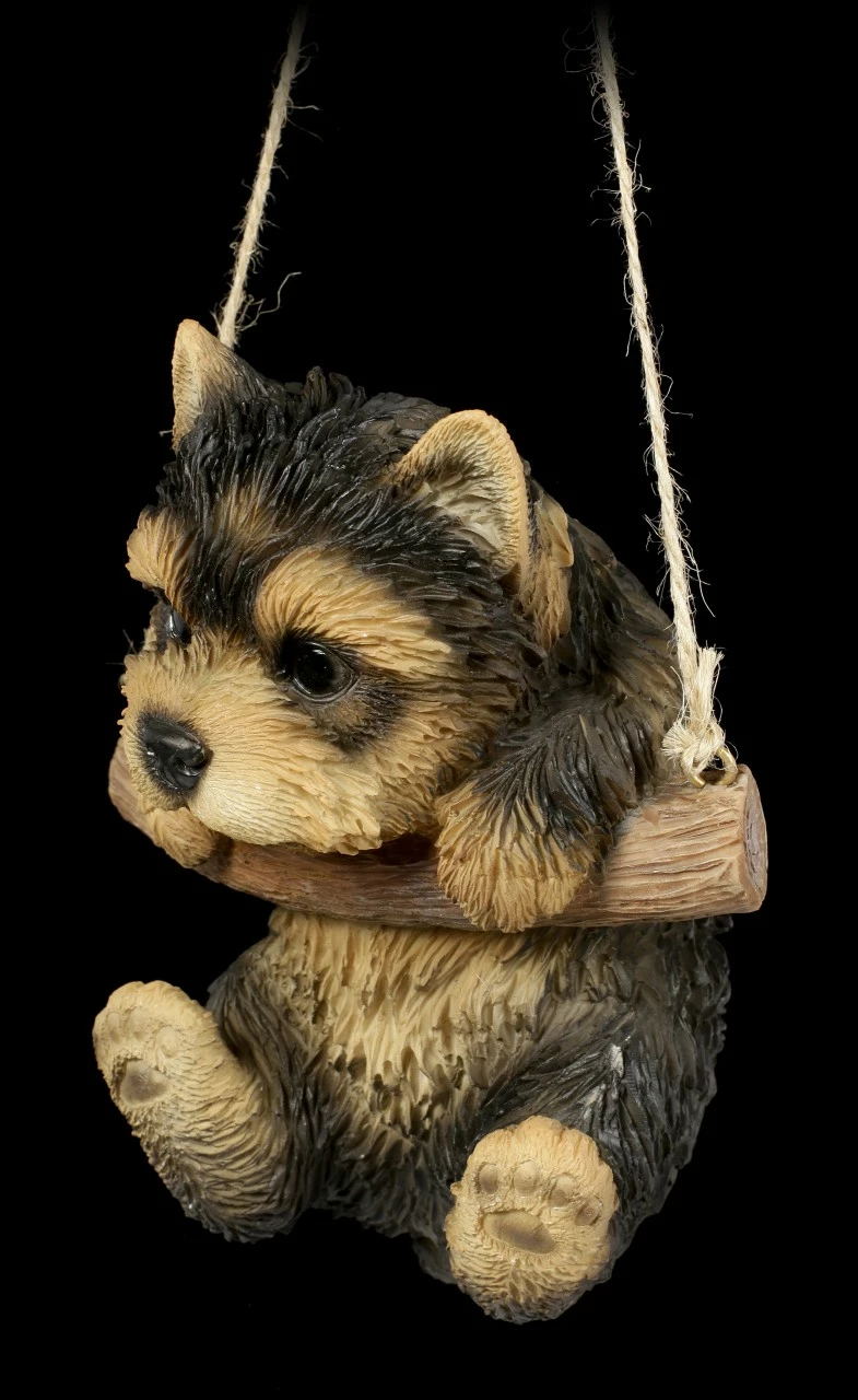 Der putzige Yorkshire Terrier Welpe liebt es zu schaukeln. Im Garten hat er einen hängenden Ast gefunden und nun schaukelt er voller Freude hin und her. Die handbemalte Kunststein (Polyresin) Figur ist für jeden Hunde Fan ein tolles Geschenk.