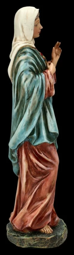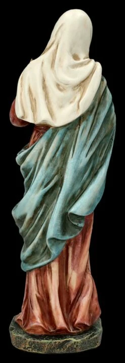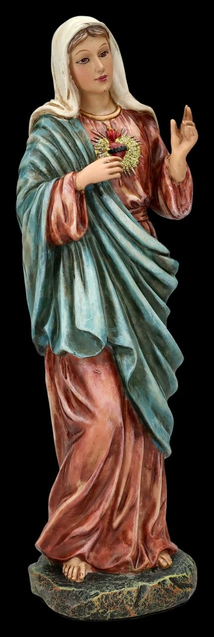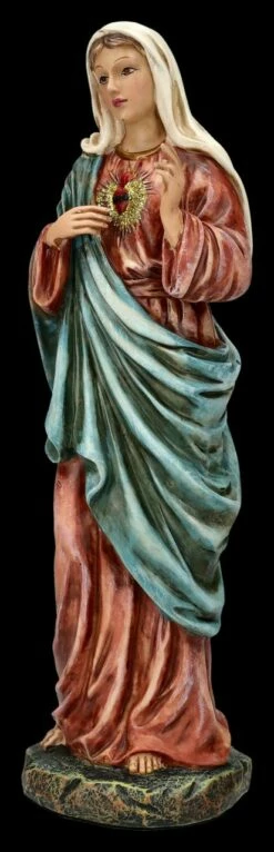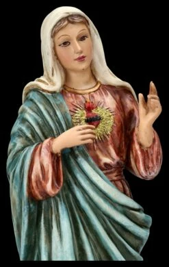 ‚Oh reinstes Herz Mariens, übervoll von Güte, zeig uns deine Liebe‘ – so beginnt das Weihegebet an das ‚Unbefleckte Herz Mariens. Sanft lächelnd, die rechte Hand zum ‚Gesegneten Herzen‘ weisend und die linke Hand segnend erhoben, ist diese von Hand liebevoll bemalte Heiligen Figur, die Maria mit dem sichtbaren Herzen zeigt, sorgfältig aus Kunststein (Polyresin) gefertigt. Die schöne Heiligen-Figur ist 27 cm hoch, 9 cm breit und 7,5 cm tief. Als Zeichen der Hoffnung und Liebe ist diese schöne Heiligen Figur auch ein wunderbares Geschenk.