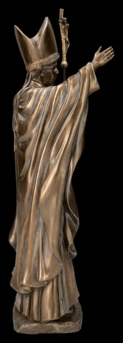 Am 13. März 2013 wurde der argentinische Kardinal Jorge Mario Bergoglio zum 266. Bischof von Rom und damit zum Papst gewählt und wurde zu Papst Franziskus. Er hat eine neue Ära in der katholischen Kirche eingeleitet und mit seiner Bescheidenheit und Liebe und seinen Predigten die Herzen der Menschen erreicht. Diese beeindruckende, 46 cm hohe, 15,5 cm breite und 13 cm tiefe Figur von Papst Franziskus ist aus edel bronziertem Kunststein (Polyresin). Sie zeigt Papst Franziskus in seinem lithurgischen Messgewand, wie der Mitra, dem Pallium (also dem breiten Band um Schulter und Hals, in dem sechs Kreuze eingestickt sind), dem Fischerring und dem Hirten- oder Kreuzstab mit Jesus am Kreuz am oberen Ende. Die detailreiche und schön bronzierte Heiligen Figur ist ein sofortiger Blickfang und für alle, die Papst Franziskus bewundern, auch ein perfektes Geschenk.