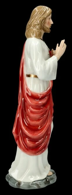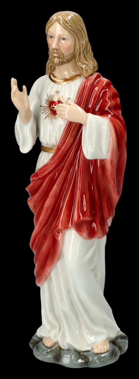 Die liebevoll von Hand bemalte Heiligen Figur aus Porzellan, die Jesus mit dem sichtbaren Herzen zeigt, ist 30,5 cm hoch, 9,5 cm breit und 11 cm tief. Bereits seit dem Mittelalter kennt man die ‚Herz-Jesu-Verehrung, denn nach der römisch-katholischen Spiritualität ist Jesus am Kreuz aus Liebe zu den Menschen gestorben. Seit dieser Zeit gibt es zahlreiche Darstellungen von Jesus mit dem gesegneten Herzen als Zeichen der Erlösung. Auch heute noch wird das ‚Gesegnete Herz Jesu‘ als Symbol der Liebe gefeiert. Die fein glänzende Porzellan Figur ‚Gesegnetes Herz Jesu‘ ist damit auch ein wunderbares Geschenk.