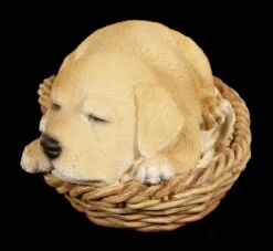 Unwiderstehlich süß schläft der kleine Labrador Welpe in seinem Bettchen und träumt von seinen Abenteuern. Er ist ein liebevolles Geschenk an einen Hundefreund.