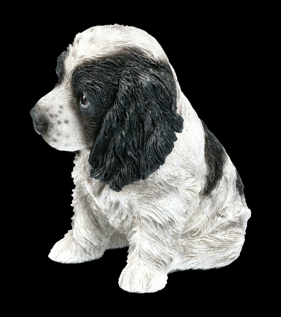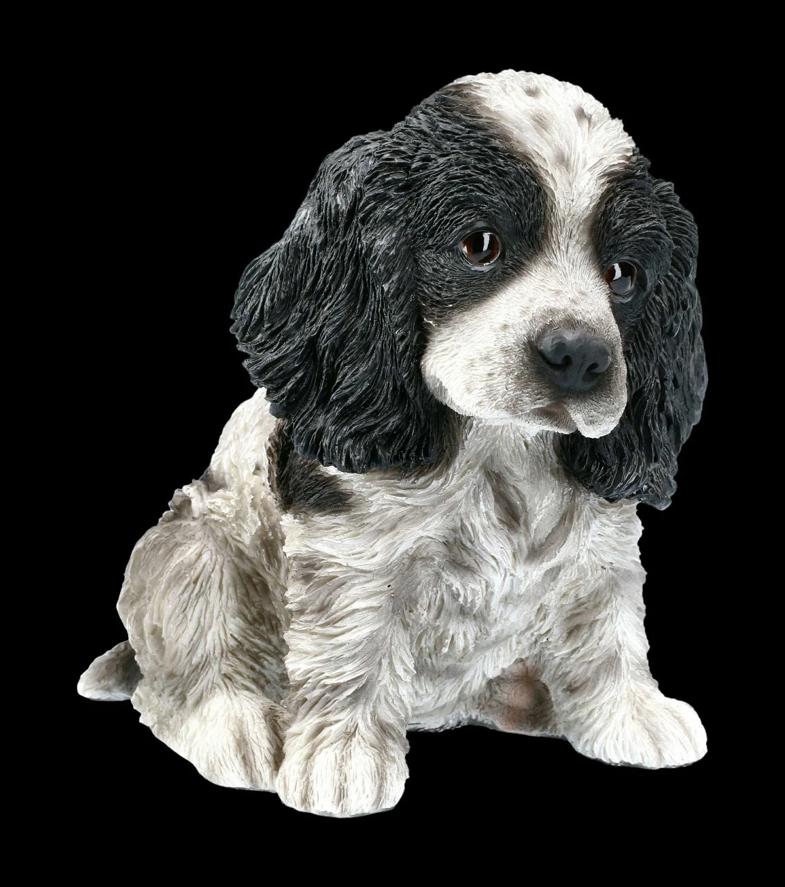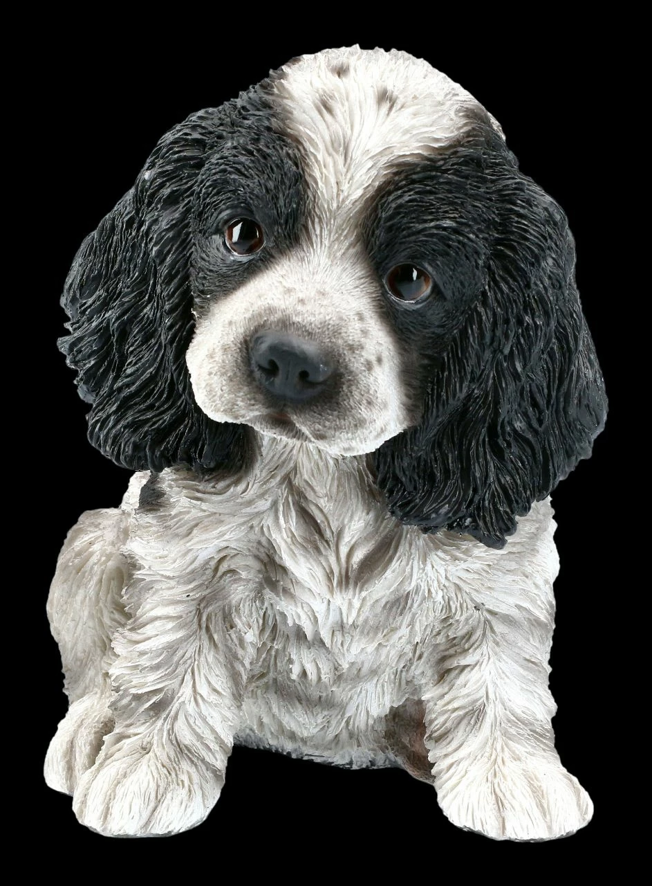 Lustig, ein bisschen vorwitzig und sehr charmant können Cocker Spaniel sein. Stets freundlich, quirlig und verspielt gehört der Cocker Spaniel deshalb zu den beliebtesten Rassehunden. Und das ist dem süßen Welpen aus detailreich handbemaltem Kunststein (Polyresin) auch anzusehen. Dieser Cocker Spaniel Welpe ist 15,5 cm hoch, 10,5 cm breit und 16,0 cm tief.. Mit seinen langen Ohren und dem treuherzigen Blick zeigt er deutlich, dass er sich auf ein liebevolles neues Zuhause freut. Der putzige Welpe ist ein tolles Geschenk für alle Hundeliebhaber.