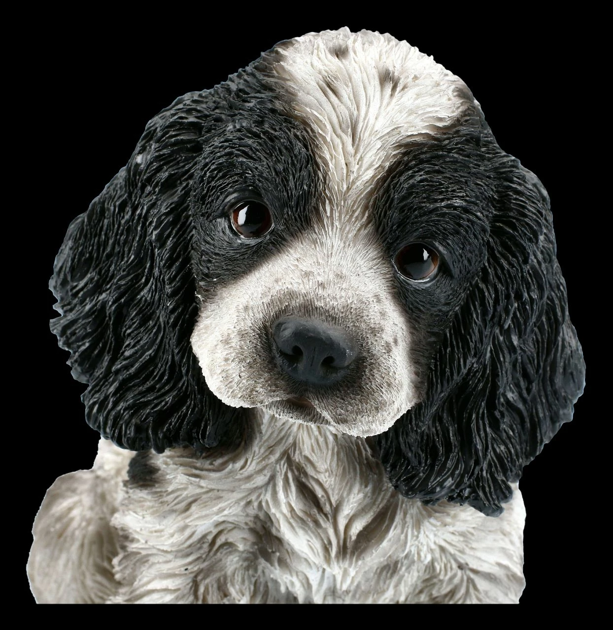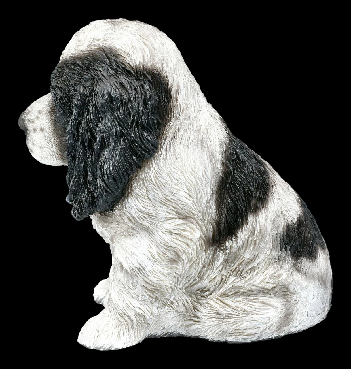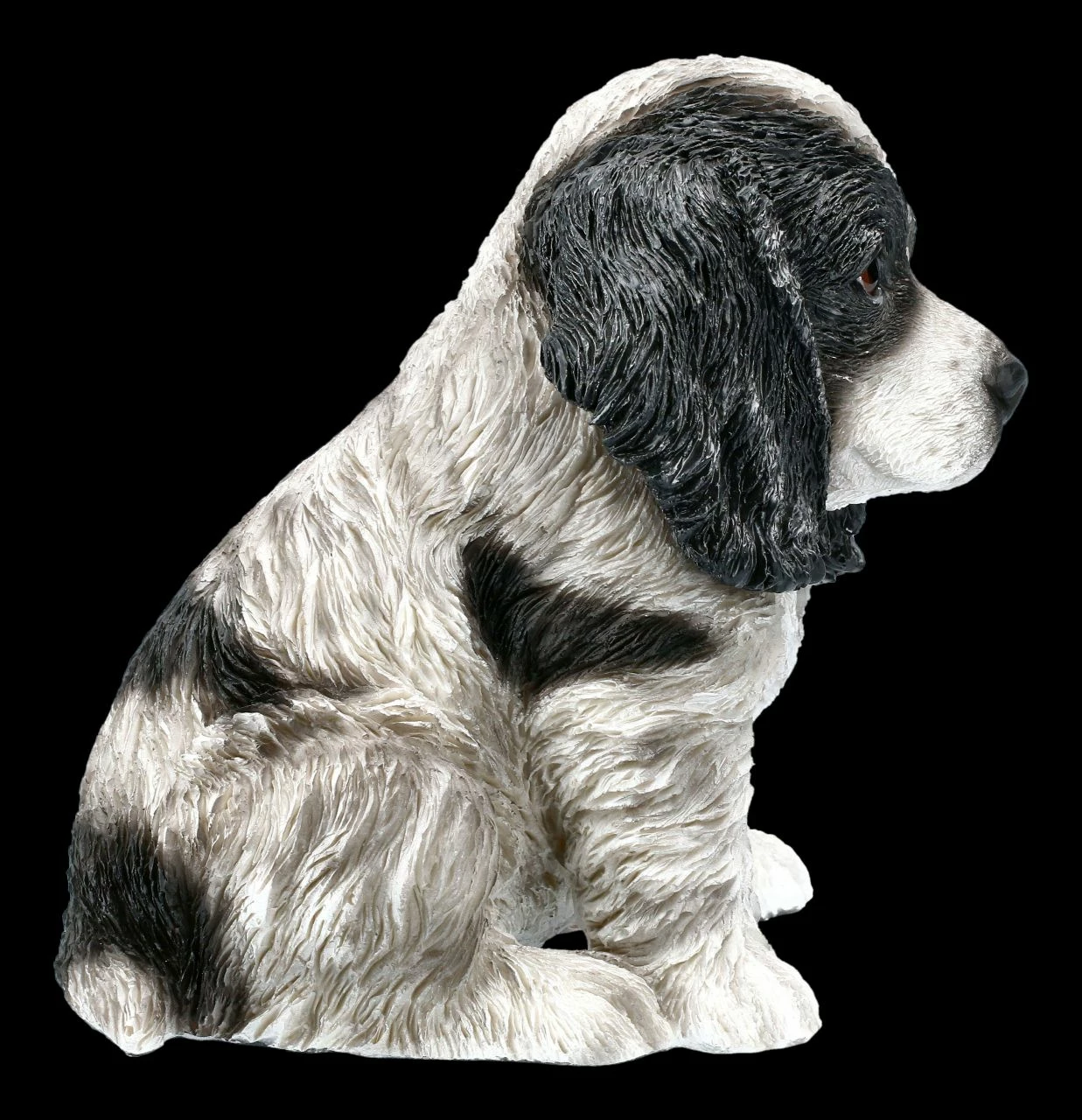 Lustig, ein bisschen vorwitzig und sehr charmant können Cocker Spaniel sein. Stets freundlich, quirlig und verspielt gehört der Cocker Spaniel deshalb zu den beliebtesten Rassehunden. Und das ist dem süßen Welpen aus detailreich handbemaltem Kunststein (Polyresin) auch anzusehen. Dieser Cocker Spaniel Welpe ist 15,5 cm hoch, 10,5 cm breit und 16,0 cm tief.. Mit seinen langen Ohren und dem treuherzigen Blick zeigt er deutlich, dass er sich auf ein liebevolles neues Zuhause freut. Der putzige Welpe ist ein tolles Geschenk für alle Hundeliebhaber.