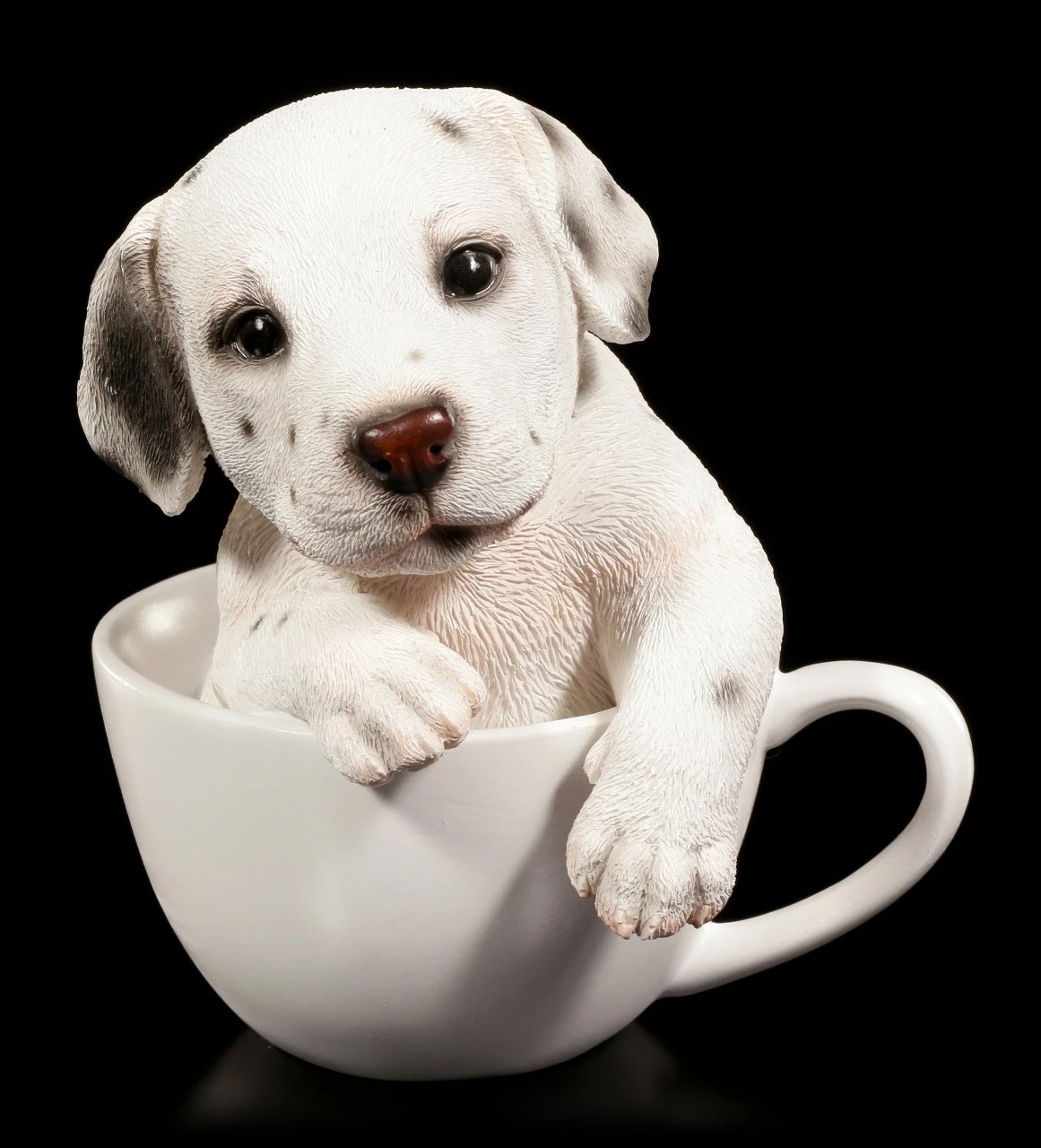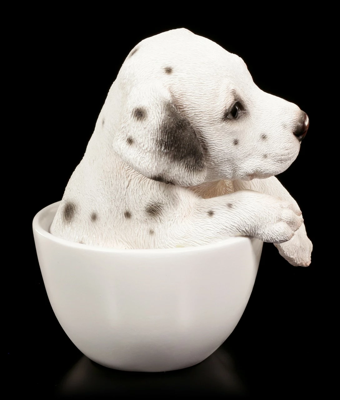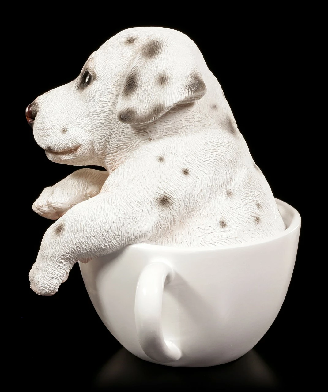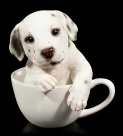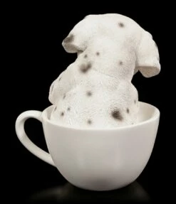 Dalmatiner sind von jeher treue Begleiter des Menschen. Früher begleiteten die lauffreudigen Hunde die Kutschen zum Schutz und noch heute sind sie eine wunderbare Hunderasse. Der kleine Welpe in der Tasse ist so nett anzusehen mit seinen kleinen schwarzen Tupfern.