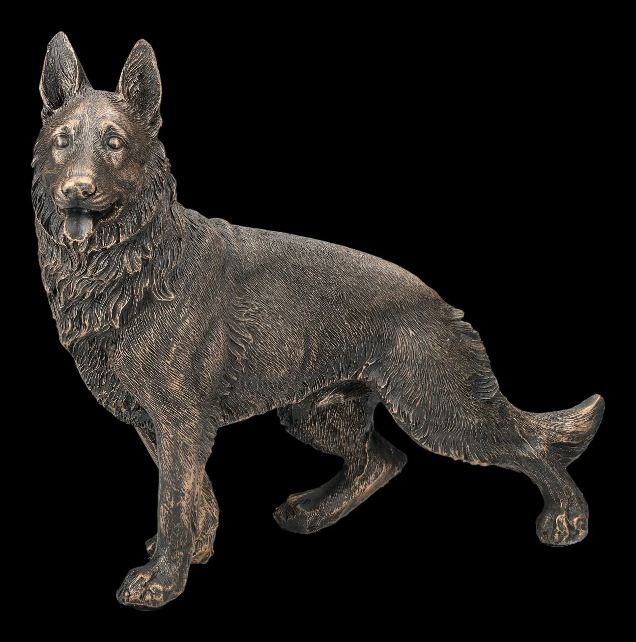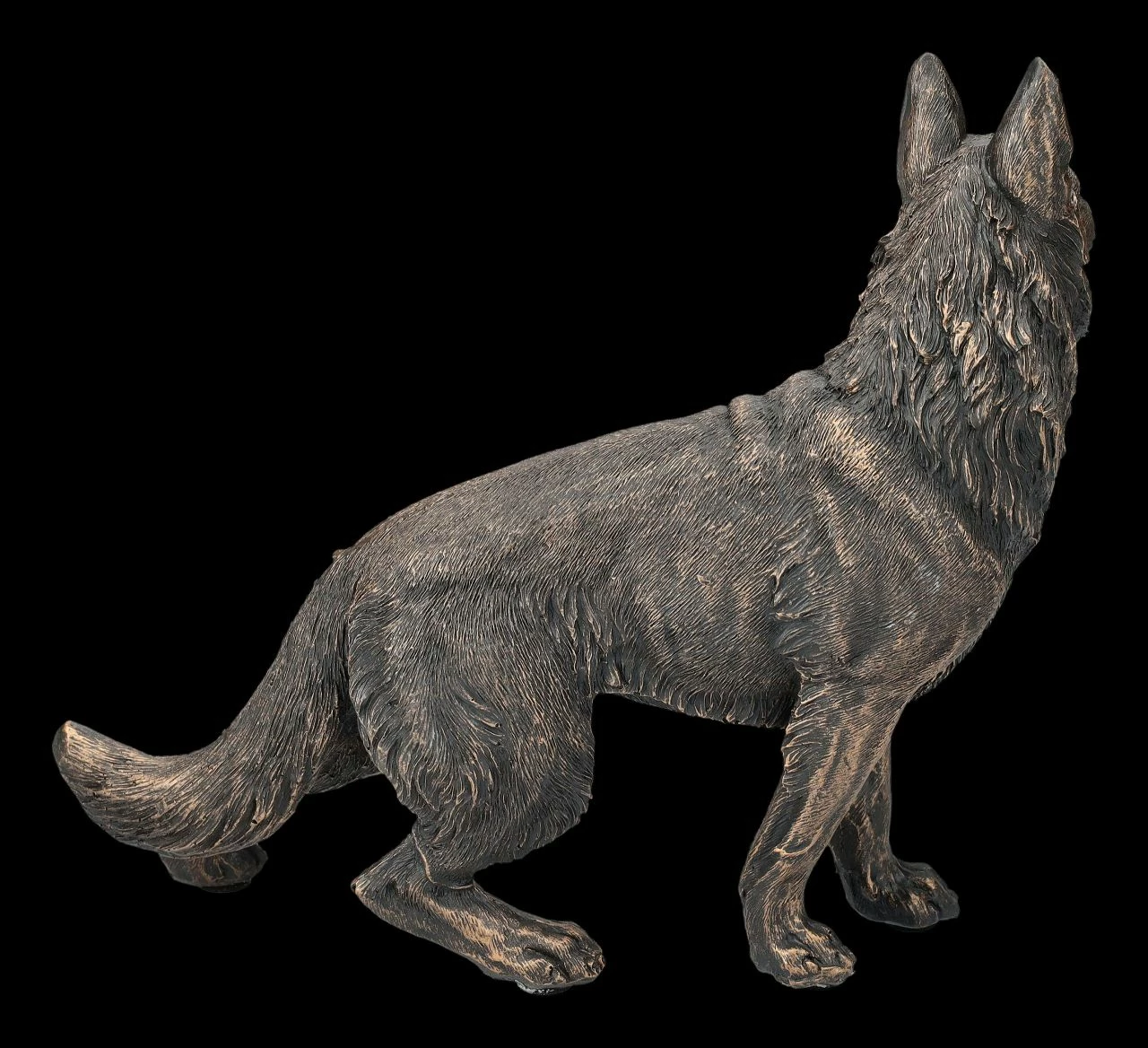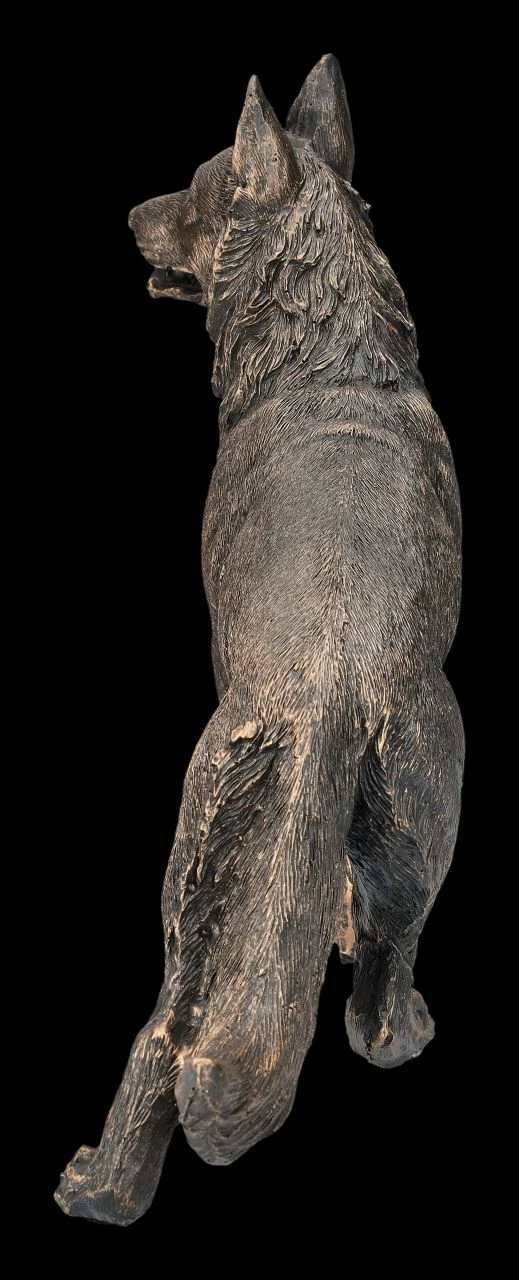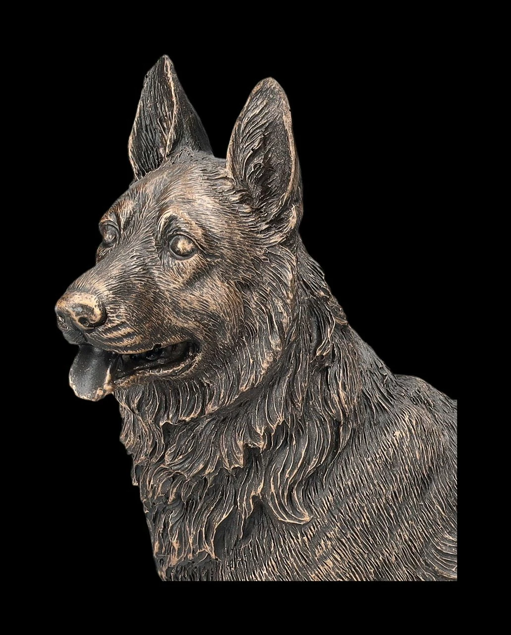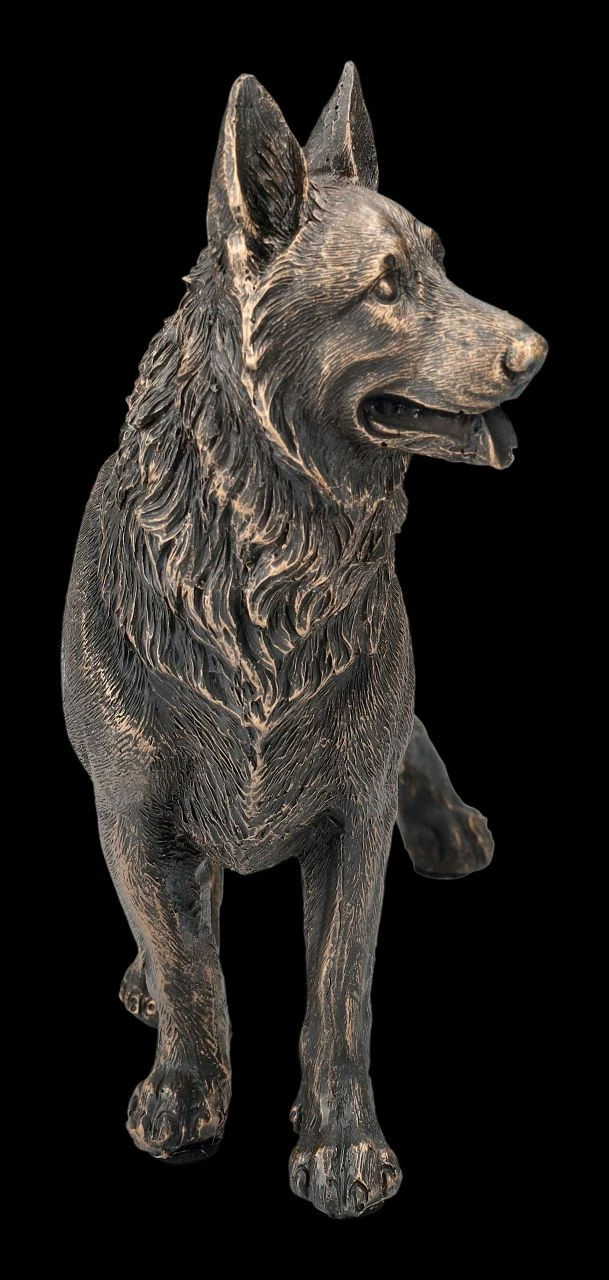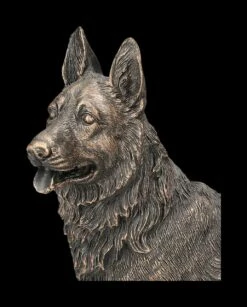 Der intelligente, arbeitswillige und treue, aber auch selbstsichere Deutsche Schäferhund gehört zu den ältesten Hunderassen Deutschlands und zu den weltweit bekanntesten. Er hat auch in Film und Fernsehen seine Spuren hinterlassen und wurde sogar in Hollywood mit einem Stern geehrt. Edel bronziert und perfekt in der Haltung ist diese Figur eines Deutschen Schäferhundes. Seine kraftvolle Stärke aber auch gelassene Ruhe kommen bei dieser Skulptur absolut perfekt zur Geltung. Die 20,5 cm hohe, 18,5 cm breite und 9 cm tiefe Hunde-Figur ist aus hochwertig bronziertem Kunststein (Polyresin) gefertigt. Der Deutsche Schäferhund ist auch für alle Hundeclubs und Vereine eine tolle Deko und ein perfektes Geschenk für alle Hunde- und insbesonders Schäferhund-Freunde.