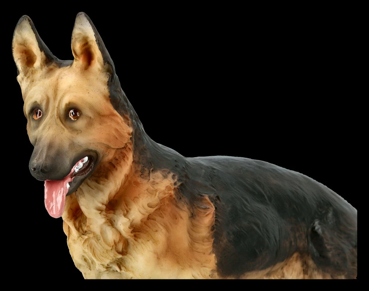 Sieht dieser deutsche Schäferhund nicht äußerst lebendig aus? Mit aufmerksamen Blick und wachsam scheint der hübsche Hund auf etwas zu warten. Die 22 cm hohe, 7 cm breite und 27 cm tiefe Hundefigur wurde aus hochwertigem Kunststein (Polyresin) gefertigt und liebevoll handbemalt. Er ist eine tolle Deko für jedes Schäferhund-Vereinsheim, aber auch ein fantastisches Geschenk für jeden Freund.dieser schönen Tiere.