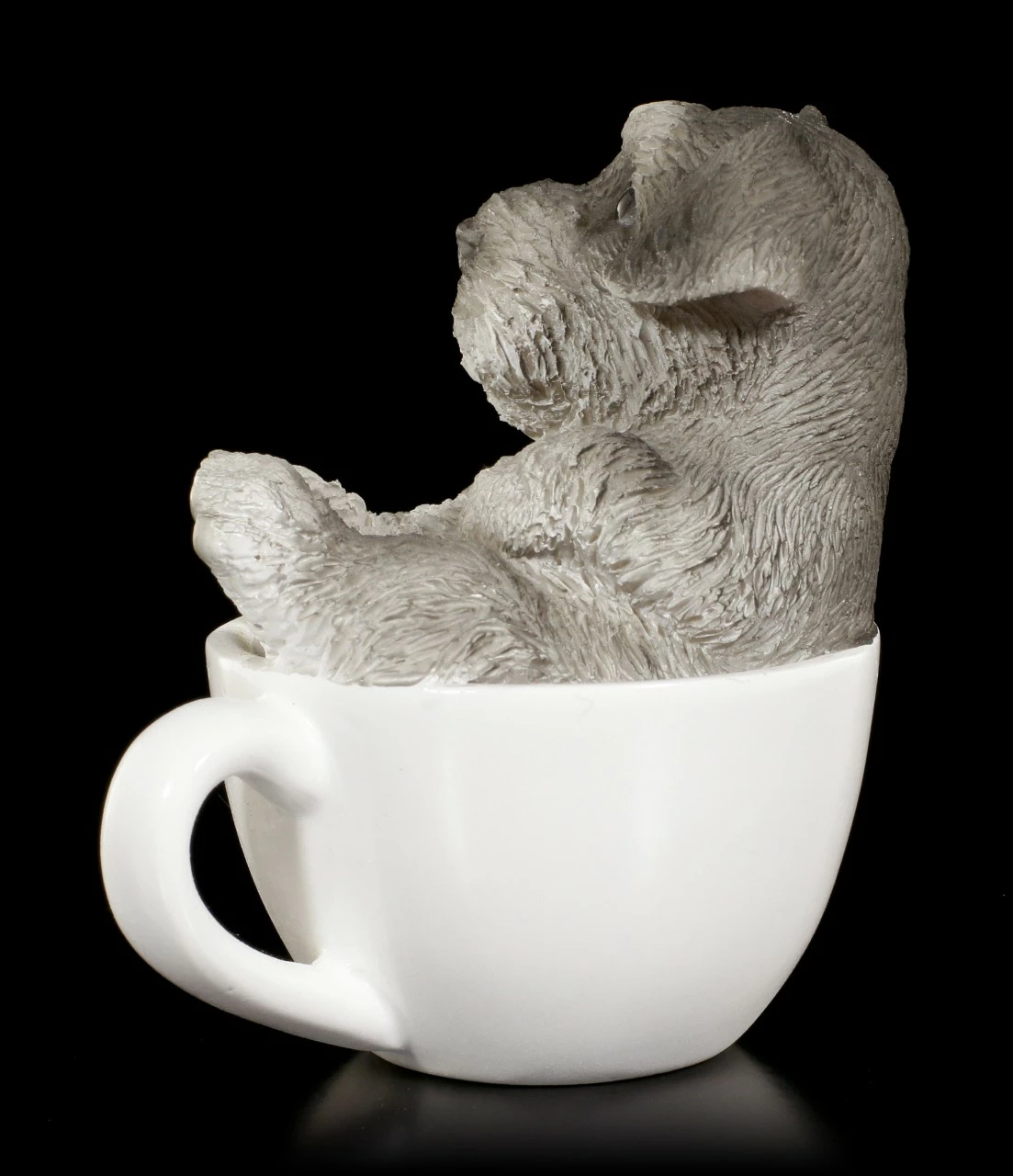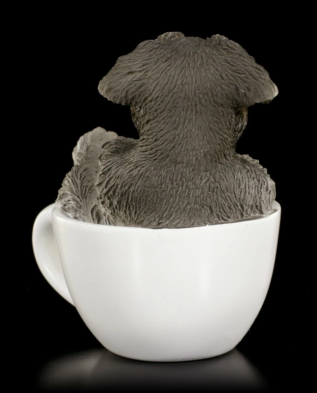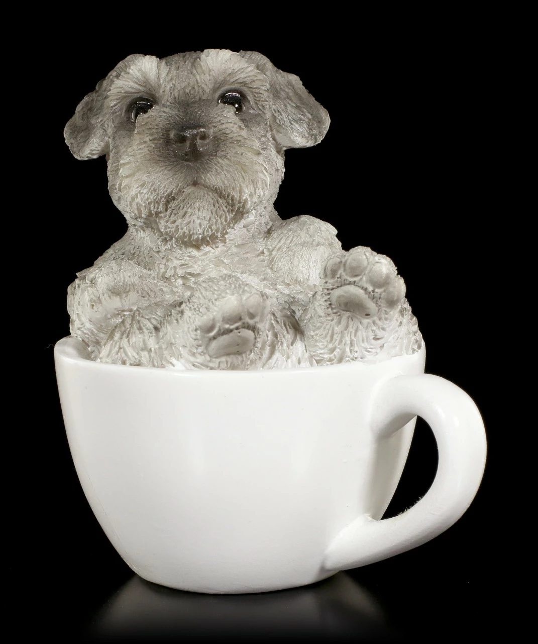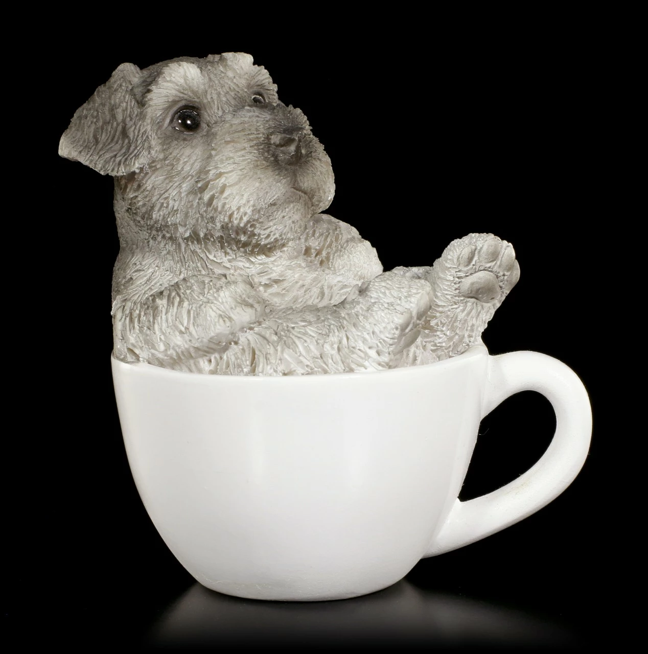 Der niedliche kleine Schnauzer Welpe wartet geduldig auf seinen Adoptiveltern. Möchten Sie ihm, oder einem seiner Freunde, ein neues zu Hause geben? Die kleine handbemalte Kunststein Figur eignet sich auch ganz wunderbar als Geschenk an einen Hunde Fan.