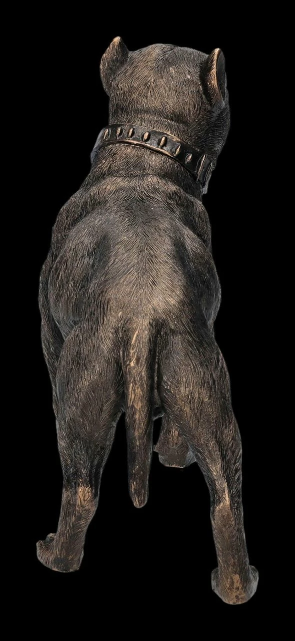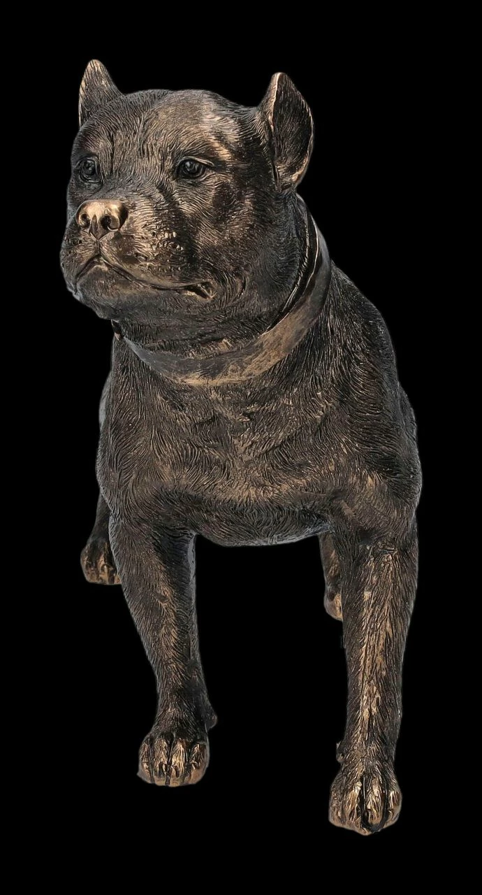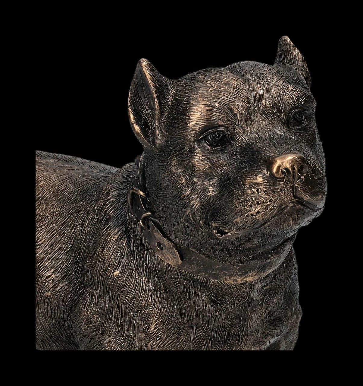 Der Pit Bull Terrier wurde aus der Kreuzung von Bulldogge und Terrier einst für Wettbewerbe gezüchtet. Im Allgemeinen gelten sie als sehr beißfreudig und angriffslustig, aber wie bei allen Hunden ist die Erziehung ausschlaggebend und so streiten sich Hundehalter, Züchter und Behörden um die Einstufung. Aber eines ist sicher, dieser fantastische, edel bronzierte Pit Bull Terrier aus Kunststein (Polyresin) ist in seiner Haltung schön anzusehen und macht einen wirklich gutmütigen Eindruck. Die 15 cm hohe, 20 cm breite und 8 cm tiefe Hunde Figur ist das perfekte Geschenk für Hundefreunde.