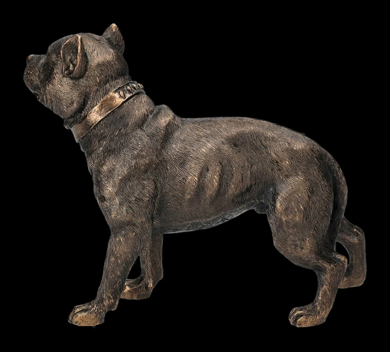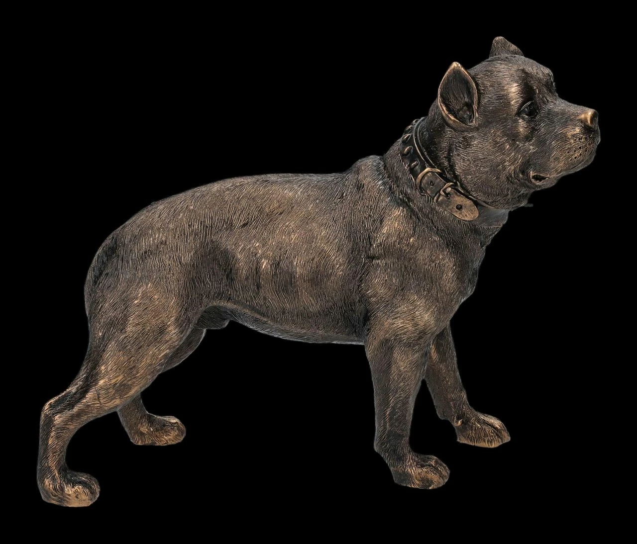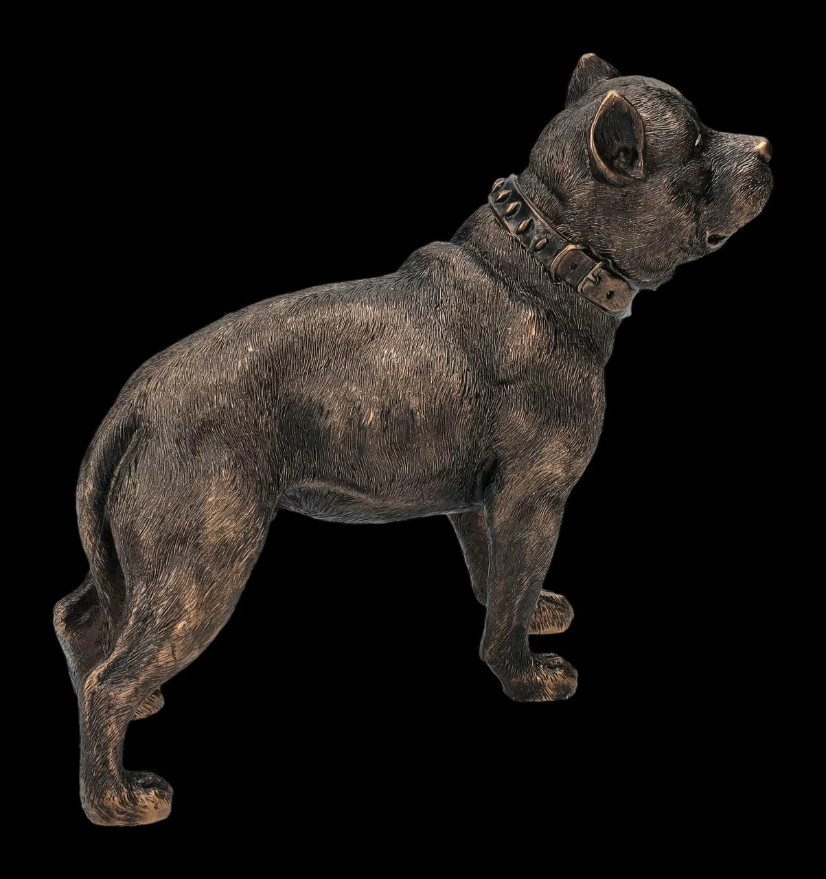 Der Pit Bull Terrier wurde aus der Kreuzung von Bulldogge und Terrier einst für Wettbewerbe gezüchtet. Im Allgemeinen gelten sie als sehr beißfreudig und angriffslustig, aber wie bei allen Hunden ist die Erziehung ausschlaggebend und so streiten sich Hundehalter, Züchter und Behörden um die Einstufung. Aber eines ist sicher, dieser fantastische, edel bronzierte Pit Bull Terrier aus Kunststein (Polyresin) ist in seiner Haltung schön anzusehen und macht einen wirklich gutmütigen Eindruck. Die 15 cm hohe, 20 cm breite und 8 cm tiefe Hunde Figur ist das perfekte Geschenk für Hundefreunde.