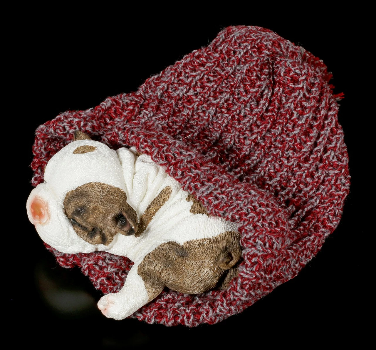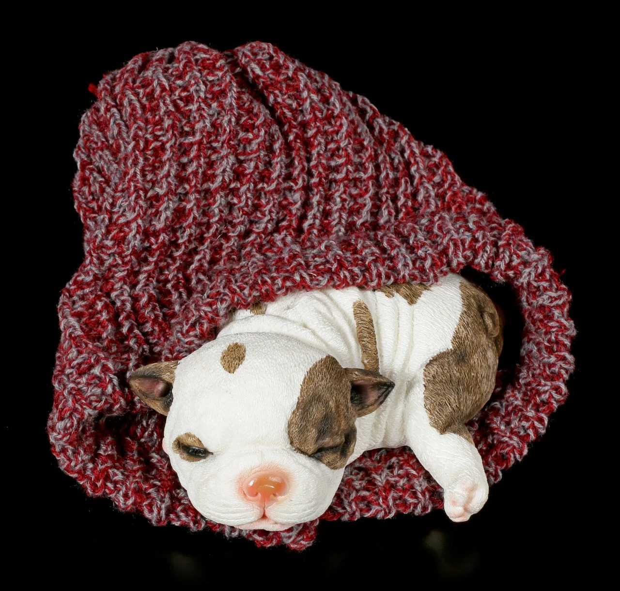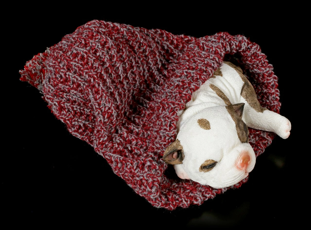 Die handbemalte Kunststein Figur ist das perfekte Geschenk für einen Hunde Fan. Der süße kleine Welpe hat sich beim Spielen in der Strickmütze versteck und ist nun wohl eingeschlafen.