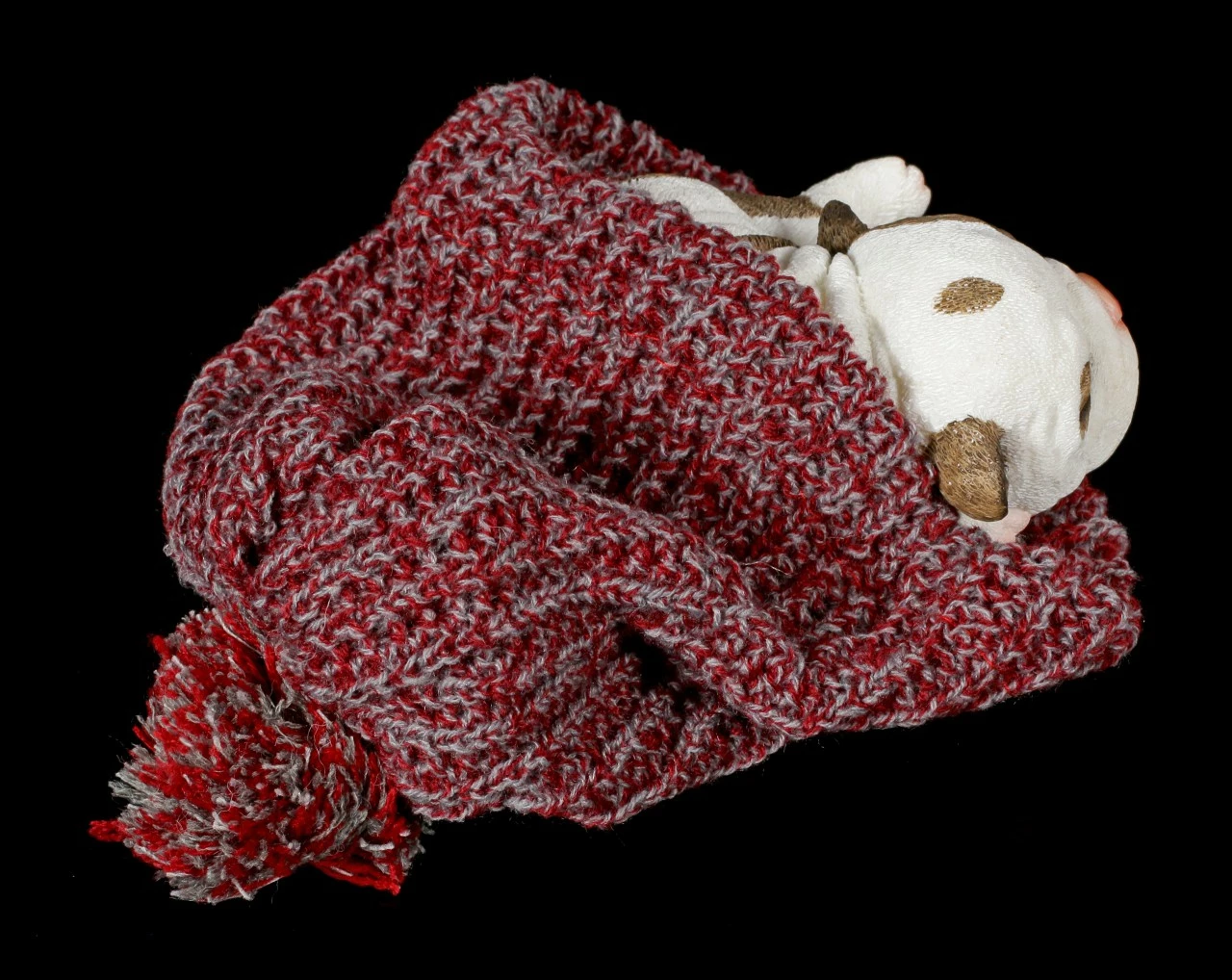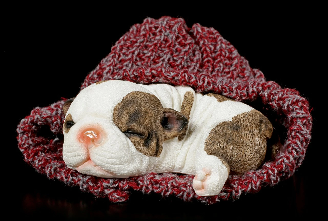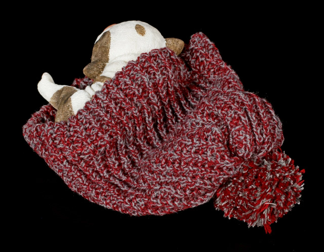 Die handbemalte Kunststein Figur ist das perfekte Geschenk für einen Hunde Fan. Der süße kleine Welpe hat sich beim Spielen in der Strickmütze versteck und ist nun wohl eingeschlafen.
